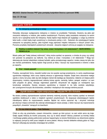 MIEJSCE: Gdańsk Dworzec PKP (plac pomiędzy budynkiem Dworca a peronami SKM) Data: 23 i 24 maja 23 maja godz. 12.00-18.00 1. Ile nietoperzy pomieszkuje w wieży Warsztaty dotyczące występowania nietoperzy w mieście na przykładzie Trójmiasta. Dowiemy się jakie jest znaczenie nietoperzy w mieście, jako ssaków owadożernych. Poznamy zalety posiadania nietoperzy na swoim strychu lub w specjalnej budce dla nietoperzy. Każdy będzie mógł obejrzeć jak wyglądają i z czego są zrobione takie budki, a chętni będą mogli uczestniczyć w zbudowaniu jednej z nich. Zadaniem dla zwiedzających będzie wskazanie na specjalnej planszy, jakie kryjówki mogą zajmować miejskie nietoperze w różnych porach roku. Poznamy przykłady trójmiejskich podziemnych zimowisk - obszarów objętych ochroną ze względu na nietoperze. 2. Rośliny w wielkim mieście! Czy wiesz, znasz i korzystasz z ich właściwości? - MARCHEWKA: REWOLUCJA Miasto pełne jest "małej ziołowej roślinności", którą można spotkać na spacerze, w drodze do pracy czy szkoły lub uprawiać na parapecie czy balkonie. Czy dobrze je znasz i korzystasz z ich właściwości ? Mogą być dekoracją ale również składnikiem ziołowej herbatki, pełne aromatycznego zapachu i smaku cieszą nie tylko oko ale również podniebienie. Każdy będzie mógł poznać je bliżej i nauczyć się rozpoznawania w terenie a także po zapachu. 3. Fru! - ‘miasto pszczół’ Prostota, oszczędność formy, niewielki budżet oraz nie wysokie wymogi przestrzenne, to cechy współczesnego ogrodnictwa miejskiego, które coraz chętniej wkracza w aglomeracje miejskie. Dzięki temu stworzenie małego ogrodu w domu lub pracy stało się dziś dostępne niemal dla każdego jej mieszkańca. Zależnie od miejsca jakim dysponujemy, możemy zagospodarować zielenią ścianę ogrodu, werandę, balkon, parapet, wnętrze i co nam tylko przyjdzie do głowy, stosując najprostsze pojemniki, skrzyneczki lub sięgając po rozwiązania typu konstrukcje wertykalne. Swoisty renesans ogrodnictwa w miastach to nie tylko osobista satysfakcja, ale i przeogromne korzyści dla środowiska, człowieka i niezbędnych dla naszego istnienia pszczół. 4. „Ogródki działkowe – miejska ostoja przyrody” - Wdzydzki PK i ZS w Schodnie Na stoisku zostaną zaprezentowane wybrane elementy rodzimej przyrody, które możemy spotkać na terenach ogródków działkowych a także w miejskich ogrodach przydomowych. Do dyspozycji odwiedzających będzie interaktywna tablica do rozpoznawania owadów. Będzie też można zapoznać się i otrzymać instrukcje jak stworzyć miejsca schronień dla zwierząt odwiedzających nasze posesje, a także nauczyć się rozpoznawania pospolitych „chwastów” rosnących na trawnikach. 5. Co ma chleb do ptaka – Teatr Delikates Chleb na ulicy się przechadza, czasem mimowolnie, czasem go ktoś porzuci, na sam widok serce się kraje. Gołąb zapała miłością do kromki porzuconej, lecz czy to dobra strawa? Aktorzy przebrani za kromkę chleba i kochliwego gołębia pokażą publiczności podczas happeningów na terenie Śródmieścia czy dokarmianie ptaków to najlepszy pomysł by trafić przez żołądek do serca ptaków. Aktorzy również dokładnie wskażą gdzie na Targu Siennym odbywają się warsztaty omawiające ten problem. Centrum Informacji i Edukacji Ekologicznej w Gdańsku 24 maja godz. 11.00-15.00 1. Start gry terenowej „Bioróżnorodność – poznaj by zachować” – punkt wydawania kart 2. Fru! - ‘miasto pszczół’ Prostota, oszczędność formy, niewielki budżet oraz nie wysokie wymogi przestrzenne, to cechy współczesnego ogrodnictwa miejskiego, które coraz chętniej wkracza w aglomeracje miejskie. Dzięki temu stworzenie małego ogrodu w domu lub pracy stało się dziś dostępne niemal dla każdego jej mieszkańca. Zależnie od miejsca jakim dysponujemy, możemy zagospodarować zielenią ścianę ogrodu, werandę, balkon, parapet, wnętrze i co nam tylko przyjdzie do głowy, stosując najprostsze pojemniki, skrzyneczki lub sięgając po rozwiązania typu konstrukcje wertykalne. Swoisty renesans ogrodnictwa w miastach to nie tylko osobista satysfakcja, ale i przeogromne korzyści dla środowiska, człowieka i niezbędnych dla naszego istnienia pszczół. Centrum Informacji i Edukacji Ekologicznej w Gdańsku