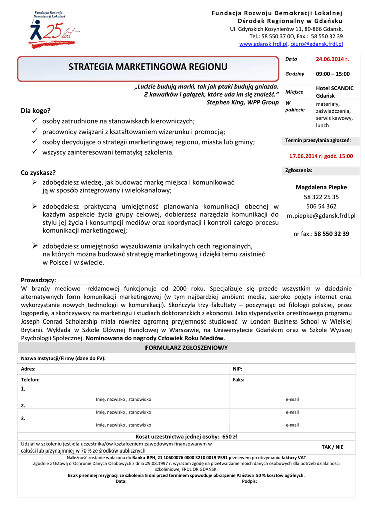 Fundacja Rozwoj u Demokracji Lokal nej Ośrodek Regionalny w Gdańs ku Ul. Gdyńskich Kosynierów 11, 80-866 Gdańsk, Tel.: 58 550 37 00, Fax.: 58 550 32 39 www.gdansk.frdl.pl, [email protected] STRATEGIA MARKETINGOWA REGIONU Data 24.06.2014 r. Godziny 09:00 – 15:00 „Ludzie budują marki, tak jak ptaki budują gniazda. Z kawałków i gałązek, które uda im się znaleźć.“ Miejsce Stephen King, WPP Group W Dla kogo? osoby zatrudnione na stanowiskach kierowniczych; pracownicy związani z kształtowaniem wizerunku i promocją; osoby decydujące o strategii marketingowej regionu, miasta lub gminy; wszyscy zainteresowani tematyką szkolenia. pakiecie Co zyskasz? zdobędziesz wiedzę, jak budować markę miejsca i komunikować ją w sposób zintegrowany i wielokanałowy; Zgłoszenia: zdobędziesz praktyczną umiejętność planowania komunikacji obecnej w każdym aspekcie życia grupy celowej, dobierzesz narzędzia komunikacji do stylu jej życia i konsumpcji mediów oraz koordynacji i kontroli całego procesu komunikacji marketingowej; Hotel SCANDIC Gdańsk materiały, zaświadczenia, serwis kawowy, lunch Termin przesyłania zgłoszeń: 17.06.2014 r. godz. 15:00 Magdalena Piepke 58 322 25 35 506 54 362 [email protected] nr fax.: 58 550 32 39 zdobędziesz umiejętności wyszukiwania unikalnych cech regionalnych, na których można budować strategię marketingową i dzięki temu zaistnieć w Polsce i w świecie. Prowadzący: W branży mediowo -reklamowej funkcjonuje od 2000 roku. Specjalizuje się przede wszystkim w dziedzinie alternatywnych form komunikacji marketingowej (w tym najbardziej ambient media, szeroko pojęty internet oraz wykorzystanie nowych technologii w komunikacji). Skończyła trzy fakultety – poczynając od filologii polskiej, przez logopedię, a skończywszy na marketingu i studiach doktoranckich z ekonomii. Jako stypendystka prestiżowego programu Joseph Conrad Scholarship miała również ogromną przyjemność studiować w London Business School w Wielkiej Brytanii. Wykłada w Szkole Głównej Handlowej w Warszawie, na Uniwersytecie Gdańskim oraz w Szkole Wyższej Psychologii Społecznej. Nominowana do nagrody Człowiek Roku Mediów. FORMULARZ ZGŁOSZENIOWY Nazwa Instytucji/Firmy (dane do FV): Adres: NIP: Telefon: Faks: 1. Imię, nazwisko , stanowisko e-mail Imię, nazwisko , stanowisko e-mail Imię, nazwisko , stanowisko e-mail 2. 3. Koszt uczestnictwa jednej osoby: 650 zł Udział w szkoleniu jest dla uczestnika/ów kształceniem zawodowym finansowanym w całości lub przynajmniej w 70 % ze środków publicznych TAK / NIE Należność zostanie wpłacona do Banku BPH, 21 10600076 0000 3210 0019 7591 przelewem po otrzymaniu faktury VAT Zgodnie z Ustawą o Ochronie Danych Osobowych z dnia 29.08.1997 r. wyrażam zgodę na przetwarzanie moich danych osobowych dla potrzeb działalności szkoleniowej FRDL OR GDAŃSK. Brak pisemnej rezygnacji ze szkolenia 5 dni przed terminem spowoduje obciążenie Państwa 50 % kosztów ogólnych. Data: Podpis: 1. Marketing terytorialny w Polsce – cechy charakterystyczne, błędy i dobre praktyki – na przykładach (analiza i ocena wybranych komunikatów reklamowych). 2. Kiedy konsument jest królem... – rola konsumenta w budowaniu marki oraz kampanii marketingowych; najważniejsze trendy konsumenckie (w tym także szeroko pojęte media społecznościowe, rosnąca rola nowych technologii i tzw. punkty styku). 3. Czym jest/ czym nie jest - zintegrowana komunikacja marketingowa i dlaczego jest tak ważna zwłaszcza dziś (w tym także poruszona kwestia tzw. strategii transmediowej)? 4. Strategia to podstawa: - czyli jak opracować program komunikacji marketingowej dla regionu (wyróżnialność to nie tylko treść). NARZĘDZIA UŁATWIAJĄCE PRZYSWAJANIE WIEDZY I METODYKA ZAJĘĆ: wyjątkowa prezentacja multimedialna; wykład; ćwiczenia dla uczestników; aktywna dyskusja; analiza przypadków/case studies z Polski i świata;