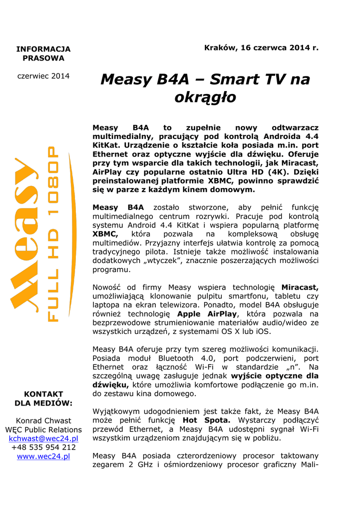 INFORMACJA PRASOWA czerwiec 2014 Kraków, 16 czerwca 2014 r. Measy B4A – Smart TV na okrągło Measy B4A to zupełnie nowy odtwarzacz multimedialny, pracujący pod kontrolą Androida 4.4 KitKat. Urządzenie o kształcie koła posiada m.in. port Ethernet oraz optyczne wyjście dla dźwięku. Oferuje przy tym wsparcie dla takich technologii, jak Miracast, AirPlay czy popularne ostatnio Ultra HD (4K). Dzięki preinstalowanej platformie XBMC, powinno sprawdzić się w parze z każdym kinem domowym. Measy B4A zostało stworzone, aby pełnić funkcję multimedialnego centrum rozrywki. Pracuje pod kontrolą systemu Android 4.4 KitKat i wspiera popularną platformę XBMC, która pozwala na kompleksową obsługę multimediów. Przyjazny interfejs ułatwia kontrolę za pomocą tradycyjnego pilota. Istnieje także możliwość instalowania dodatkowych „wtyczek”, znacznie poszerzających możliwości programu. Nowość od firmy Measy wspiera technologię Miracast, umożliwiającą klonowanie pulpitu smartfonu, tabletu czy laptopa na ekran telewizora. Ponadto, model B4A obsługuje również technologię Apple AirPlay, która pozwala na bezprzewodowe strumieniowanie materiałów audio/wideo ze wszystkich urządzeń, z systemami OS X lub iOS. KONTAKT DLA MEDIÓW: Konrad Chwast WĘC Public Relations [email protected] +48 535 954 212 www.wec24.pl Measy B4A oferuje przy tym szereg możliwości komunikacji. Posiada moduł Bluetooth 4.0, port podczerwieni, port Ethernet oraz łączność Wi-Fi w standardzie „n”. Na szczególną uwagę zasługuje jednak wyjście optyczne dla dźwięku, które umożliwia komfortowe podłączenie go m.in. do zestawu kina domowego. Wyjątkowym udogodnieniem jest także fakt, że Measy B4A może pełnić funkcję Hot Spota. Wystarczy podłączyć przewód Ethernet, a Measy B4A udostępni sygnał Wi-Fi wszystkim urządzeniom znajdującym się w pobliżu. Measy B4A posiada czterordzeniowy procesor taktowany zegarem 2 GHz i ośmiordzeniowy procesor graficzny Mali- INFORMACJA PRASOWA czerwiec 2014 450MP, o częstotliwości 600 MHz. Pamięć operacyjna to 2 GB DDR3, a na dane użytkownika przeznaczono 8 GB pamięci flash. Całość uzupełnia wyjście HDMI w wersji 1.4b. Dzięki takiej specyfikacji, nowy model B4A z łatwością odtwarza filmy w jakości Ultra HD, znanej również jako 4K. Measy B4A będzie dostępne w sprzedaży już w czerwcu bieżącego roku. Objęte jest 24-miesięczną gwarancją producenta, a jego sugerowana cena detaliczna wynosi 445 PLN brutto. Tagi: b4a, hdmi, ultra hd, ott, android, smart tv, measy, xbmc, 4k, miracast, aitplay, spdif O firmie Measy Electronics Co., Ltd. Measy to firma z kilkunastoletnim doświadczeniem, o ugruntowanej pozycji na rynku. Jest jednym z największych dostawców odtwarzaczy multimedialnych HD oraz kompaktowych klawiatur bezprzewodowych. Od początku stawia na pełne zrozumienie potrzeb użytkownika, nowe kierunki rozwoju oraz innowacyjność. Dzięki bogatemu doświadczeniu, potrafi trafnie odpowiedzieć na oczekiwania klientów, co z roku na rok jeszcze bardziej umacnia jej pozycję na światowych rynkach. Obecnie firma zatrudnia ponad 200 osób w swojej fabryce, w Chinach oraz w nowym centrum R&D, które mieści się w Korei Południowej. Miesięczna produkcja przekracza pół miliona sztuk, a produkty trafiają do kilkudziesięciu krajów na całym świecie, w tym także do Polski. Measy to technologia jutra dostępna dla każdego. Więcej informacji: www.measypolska.pl KONTAKT DLA MEDIÓW: Konrad Chwast WĘC Public Relations [email protected] +48 535 954 212 www.wec24.pl