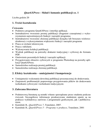 QuarkXPress - Skład i łamanie publikacji cz. 1 Liczba godzin 20 1. Treści kształcenia Ćwiczenia: • Podstawy programu QuarkXPress i interfejs aplikacji. • Instruktażowe tworzenie prostej publikacji (fragment czasopisma) z wykorzystaniem najważniejszych funkcji i narzędzi programu; • Instruktażowe tworzenie złożonej publikacji (ksiązka lub broszura wielorozdziałowa) z wykorzystaniem większości funkcji i narzędzi programu • Praca ze stylami tekstowymi. • Praca z tabelami. • Wykonywanie kolekcji publikacji. • Wydruk publikacji na potrzeby drukarni tradycyjnej i cyfrowej do formatu PDF. • Omówienie pozostałych funkcji i narzędzi aplikacji. • Przygotowanie obrazów cyfrowych w programie Photoshop na porzeby aplikacji QuarkXPress. • Samodzielna realizacja prostej publikacji. • Samodzielna realizacja złożonej publikacji. 2. Efekty kształcenia – umiejętności i kompetencje • Umiejętności wykonania dowolnej publikacji przeznaczonej do drukowania. • Znajomość problematyki poprawnego przygotowania plików do drukowania technikami cyfrowymi i technikami tradycyjnymi. 3. Zalecana literatura • Podstawową literaturą są notatki własne sporządzane przez studenta podczas ćwiczeń. Szczegółowe informacje przekazywane studentom oparte są na praktyce wykładowcy zarówno z programami graficznymi, jak i publikowaniem. • Kamiński B., QuarkXPress 7, Translator, 2007. • Kamiński B., QuarkXPress 5 – Programy w praktyce, Translator, 2001 5