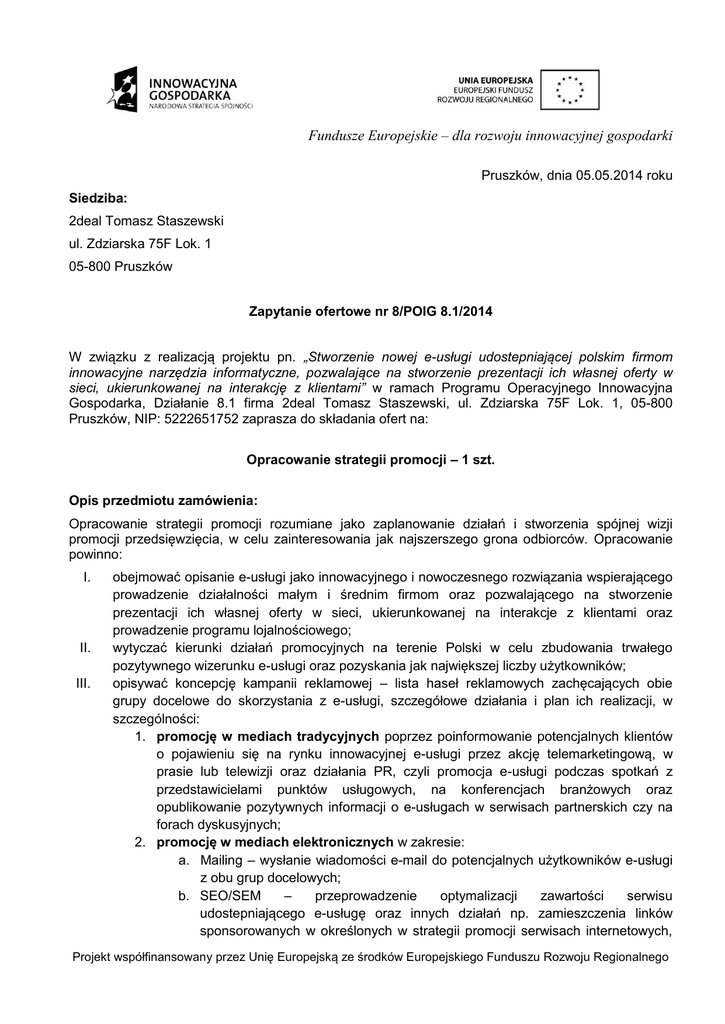 Fundusze Europejskie – dla rozwoju innowacyjnej gospodarki Pruszków, dnia 05.05.2014 roku Siedziba: 2deal Tomasz Staszewski ul. Zdziarska 75F Lok. 1 05-800 Pruszków Zapytanie ofertowe nr 8/POIG 8.1/2014 W związku z realizacją projektu pn. „Stworzenie nowej e-usługi udostepniającej polskim firmom innowacyjne narzędzia informatyczne, pozwalające na stworzenie prezentacji ich własnej oferty w sieci, ukierunkowanej na interakcję z klientami” w ramach Programu Operacyjnego Innowacyjna Gospodarka, Działanie 8.1 firma 2deal Tomasz Staszewski, ul. Zdziarska 75F Lok. 1, 05-800 Pruszków, NIP: 5222651752 zaprasza do składania ofert na: Opracowanie strategii promocji – 1 szt. Opis przedmiotu zamówienia: Opracowanie strategii promocji rozumiane jako zaplanowanie działań i stworzenia spójnej wizji promocji przedsięwzięcia, w celu zainteresowania jak najszerszego grona odbiorców. Opracowanie powinno: I. II. III. obejmować opisanie e-usługi jako innowacyjnego i nowoczesnego rozwiązania wspierającego prowadzenie działalności małym i średnim firmom oraz pozwalającego na stworzenie prezentacji ich własnej oferty w sieci, ukierunkowanej na interakcje z klientami oraz prowadzenie programu lojalnościowego; wytyczać kierunki działań promocyjnych na terenie Polski w celu zbudowania trwałego pozytywnego wizerunku e-usługi oraz pozyskania jak największej liczby użytkowników; opisywać koncepcję kampanii reklamowej – lista haseł reklamowych zachęcających obie grupy docelowe do skorzystania z e-usługi, szczegółowe działania i plan ich realizacji, w szczególności: 1. promocję w mediach tradycyjnych poprzez poinformowanie potencjalnych klientów o pojawieniu się na rynku innowacyjnej e-usługi przez akcję telemarketingową, w prasie lub telewizji oraz działania PR, czyli promocja e-usługi podczas spotkań z przedstawicielami punktów usługowych, na konferencjach branżowych oraz opublikowanie pozytywnych informacji o e-usługach w serwisach partnerskich czy na forach dyskusyjnych; 2. promocję w mediach elektronicznych w zakresie: a. Mailing – wysłanie wiadomości e-mail do potencjalnych użytkowników e-usługi z obu grup docelowych; b. SEO/SEM – przeprowadzenie optymalizacji zawartości serwisu udostepniającego e-usługę oraz innych działań np. zamieszczenia linków sponsorowanych w określonych w strategii promocji serwisach internetowych, Projekt współfinansowany przez Unię Europejską ze środków Europejskiego Funduszu Rozwoju Regionalnego Fundusze Europejskie – dla rozwoju innowacyjnej gospodarki mających na celu uzyskanie jak najlepszych pozycji serwisu udostępniającego e-usługę (pojawienie się linku na pierwszej stronie wyników wyszukiwania) w wynikach organicznych wyszukiwania w wyszukiwarce Google, na określone w strategii promocji słowa/frazy wpisywane przez użytkowników do wyszukiwarki; Opis projektu: Projekt polega na stworzeniu e-usługi, która zakłada udostępnienie polskim firmom (przede wszystkim usługowym z sektora MSP) innowacyjnych narzędzi informatycznych, pozwalających na stworzenie prezentacji ich własnej oferty w sieci, ukierunkowanej na interakcję z klientami oraz stworzenie i prowadzenie programu lojalnościowego. E-usługa będzie udostępniała klientom firm, korzystającym z e-usługi, możliwość oceny i wyboru ofert usług tych firm na podstawie wizualizacji i opinii, oraz łatwej, zdalnej rezerwacji tych usług. E-usługa będzie udostępniała następujące funkcjonalności dedykowane dla każdej z grup docelowych: Firmy - generowanie własnego systemu lojalnościowego dla klientów, opracowywanie indywidualnych form rabatów i bonusów, personalizowanie parametrów programów lojalnościowych ,ocenianie i monitorowanie działań marketingowych, możliwość zarządzania oraz organizowania funkcjonowania danego przedsiębiorstwa, możliwość dokonywania panoramicznych zdjęć lokalu, ułatwiających dokonywanie wyboru miejsca i rezerwacji, możliwość prowadzenia elektronicznego kalendarza z listą rezerwacji; Konsumenci – możliwość rezerwacji online miejsca w danym punkcie usługowym, możliwość otrzymywania dedykowanego programu lojalnościowego w tym rabatów i bonusów, korzystanie z listy rezerwowej i otrzymywania powiadomień o zwolnieniu miejsca/godziny w danym punkcie usługowym, możliwość opiniowania danego punktu usługowego, możliwość zakupu i przesyłania do innej osoby wirtualnej karty podarunkowej. Celem projektu jest wsparcie małych i średnich firm usługowych, aby nie musiały budować dedykowanych rozwiązań do budowania relacji ze swoimi klientami w Internecie, lecz mogły skorzystać z gotowego rozwiązania. E-usługa będzie dostępna przez serwis internetowy 2deal.pl lub inną domenę wybraną przez klienta oraz przez aplikacje na urządzenia mobilne. Zastrzeżenia 1. Zamawiający zastrzega sobie prawo zakończenia postępowania bez podania przyczyny. 2. W przypadku, gdy kwoty przedstawione w odpowiedziach na zapytanie będą wyższe od zaplanowanych w budżecie ww. projektu, Zamawiający zastrzega sobie prawo negocjacji z Wykonawcą, który przedstawi najkorzystniejszą ofertę. 3. Zamawiający nie dopuszcza możliwości składania ofert częściowych. Oferty niekompletne nie będą rozpatrywane. 4. Wydanie niniejszego zapytania ofertowego nie zobowiązuje firmy 2deal Tomasz Staszewski do akceptacji oferty, w całości lub części i nie zobowiązuje firmy 2deal Tomasz Staszewski do składania wyjaśnień czy powodów akceptacji lub odrzucenia oferty. 5. 2deal Tomasz Staszewski nie może być pociągana do odpowiedzialności za jakiekolwiek koszty czy wydatki poniesione przez oferentów w związku z przygotowaniem i dostarczeniem oferty. Projekt współfinansowany przez Unię Europejską ze środków Europejskiego Funduszu Rozwoju Regionalnego Fundusze Europejskie – dla rozwoju innowacyjnej gospodarki 6. 2deal Tomasz Staszewski zastrzega sobie pr
