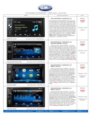 CAR MULTIMEDIA 2DIN UNIWERSALNE * OFERTA sierpień - wrzesień 2013. Model Parametry techniczne 2DIN UNIWERSALNY – WINDOWS CE 6.0 2DIN uniwersalny, 50Wx4 MOSFET, ISO wbudowane 6.2” (800x480) pixels DIGITAL LCD TFT WVGA, DVD VCD, CD , DIVX , AVI , XVID, MP4, JPEG, MP3, WMA FM / AM, RDS, GPS, SWC interfejs sterowania z koła kierownicy 8 sekcji, , BLUETOOTH A2DP, telefoniczna książka adresowa plus zewnętrzny mikrofon,3 kanałowy korektor barwy dźwięku, EQUALIZER, port 2xUSB 2.0 front - tył / SD / micro SD map, 10 tapet własnych plus 12 tapet użytkownika, przyciemniane ekranu 4 nastawy, polskie i angielskie menu, niezależne wzmocnienie dla DVD/USB/SD oraz RADIO, AV-1, AV-2,wyjścia :4xRCA plus 1 x RCA subwoofer z filtrem, VIDEO-1/2, MULTI ZONE druga strefa odbioru, sterowanieDVB-T RGB COLOR – Paleta 256 kolorów podświetlenia Współpraca z AUTOMAPA , IGO 8/9 GMS 6701 LUXURY 2DIN uniwersalny, 45Wx 4 MOSFET, ISO kable 6.2” (800x480) pixels DIGITAL LCD TFT WVGA, DVD VCD, CD , DIVX , RMVB, AVI , XVID, MP4, JPEG, MP3, WMA, FM / AM, RDS, GPS, SWC interfejs sterowania z kierownicy 8 sekcji, , BLUETOOTH A2DP, telefoniczna książka adresowa plus zewnętrzny mikrofon, 3 pasmowy korektor barwy dźwięku, EQUALIZER, port 1x USB 2.0 tył / 1x mini USB front / SD / micro SD map, 10pozycji przyciemniana ekranu, polskie i angielskie menu, niezależne wzmocnienie DVD/USB/SD/BT oraz RADIO, AV-1, AV-2, wyjścia :4xRCA plus 1 x RCA subwoofer z filtrem, VIDEO -1/2, sterowanie : DVB-T, opcja: DVR , podświetlenie przycisków Dual Color: czerwone - białe 2DIN uniwersalny, 45Wx 4 MOSFET, ISO kable 6.2” (800x480) pixels DIGITAL LCD TFT WVGA, DVD VCD, CD, XVID, MP4, JPEG, MP3, WMA, FM / AM, DIVX, RMVB, RDS, GPS, SWC interfejs sterowania z koła kierownicy 8 sekcji, BLUETOOTH - wbudowany mikrofon, A2DP, telefoniczna książka adresowa, 10 pasmowy korektor barwy dźwięku, EQUALIZER, port 1x mini USB front / SD / micro SD map, DIMMER przyciemniane ekranu 4 pozycje, polskie i angielskie menu, niezależny balans wzmocnienia dla : RADIO/ DVD/USB/SD, BLUETOOTH, AV-IN1, wyjścia : DVB-T 4 x RCA, plus 1 x RCA subwoofer z filtrem, wyjście VIDEO, czerwone - białe podświetlenie , wersja bez pilota. PLN/szt Gwarancja - 2 lata w ofercie ! Detal brutto 1599,00 PLN/szt Gwarancja - 2 lata w ofercie ! Detal brutto 1269,00 PLN/szt Gwarancja - 2 lata w ofercie od sierpnia ! Kod towaru EAN : 5902738801438 2DIN UNIWERSALNY – WINDOWS CE 6.0 800MHz - procesor 2DIN uniwersalny, 45Wx 4 MOSFET, ISO kable 6.2” (800x480) pixels DIGITAL LCD TFT WVGA, DVD VCD, CD, XVID, MP4, JPEG, MP3, WMA, FM / AM, DIVX, RMVB, RDS, GPS, SWC interfejs sterowania z koła kierownicy 8 sekcji, BLUETOOTH - wbudowany mikrofon, A2DP, telefoniczna książka adresowa, EQ-10 pasmowy korektor barwy dźwięku, EQUALIZER, port 1x mini USB front / SD / micro SD map, DIMMER przyciemniane ekranu 4 pozycje, polskie i angielskie menu, niezależny balans wzmocnienia dla : RADIO/ DVD/USB/SD, BLUETOOTH, AV-IN1 , AV-IN2, wyjścia : 4 x RCA, plus 1 x RCA subwoofer z filtrem, wyjście VIDEO, czerwone - zielone podświetlenie. GMS 6311 SMART 1969,00 Kod towaru EAN : 5902738801407 2DIN UNIWERSALNY – WINDOWS CE 6.0 800MHz - procesor GMS 6301 SMART Detal brutto Kod towaru EAN : 5902738800493 2DIN UNIWERSALNY – WINDOWS CE 6.0 CORTEX A9 / 800MHz - procesor GMS 6401 NEW EXCELLENCE Cena Detal brutto 1299,00 PLN/szt Gwarancja - 2 lata w ofercie od 15 września ! Kod towaru EAN : 5902738801452 System GPS z cyfrową mapą, karta 4GB plus adaptor SD. * AUTOMAPA XL ( Polska ): 189,00 PLN brutto * AUTOMAPA EU ( Europa ): 389,00 PLN brutto 2DIN UNIWERSALNY – WINDOWS CE 6.0 800MHz - procesor 2DIN uniwersalny, 45Wx 4 MOSFET, ISO kable 6.2” (800x480) pixels DIGITAL LCD TFT WVGA, DVD VCD, CD, XVID, MP4, JPEG, MP3, WMA, FM / AM, DIVX, RMVB, RDS, GPS, SWC interfejs sterowania z koła kierownicy 8 sekcji, BLUETOOTH - wbudowany mikrofon, A2DP, telefoniczna książka adresowa, 10 pasmowy korektor barwy dźwięku, EQUALIZER, port 1x mini USB front / SD / micro SD map, DIMMER przyciemniane ekranu 4 pozycje, polskie i angielskie menu, niezależny balans wzmocnienia dla : RADIO/ DVD/USB/SD, BLUETOOTH, AV-IN1 , AV-IN2, wyjścia : 4 x RCA, plus 1 x RCA subwoofer z filtrem, wyjście VIDEO, czerwone - białe podświetlenie. GMS 6313 SMART Detal brutto 1299,00 PLN/szt Gwarancja - 2 lata w ofercie od pażdziernika ! Kod towaru EAN : 5902738801179 mporter: AUDIOPOL MATLA CORPORATION 25-808 Kielce, Al.Górników Staszicowskich 132, tel: 41 346 26 60, fax: 41 346 3031, e-mail:[email protected] www.gms.pl