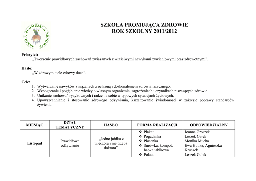 SZKOŁA PROMUJĄCA ZDROWIE ROK SZKOLNY 2011/2012 Priorytet: „Tworzenie prawidłowych zachowań związanych z właściwymi nawykami żywieniowymi oraz zdrowotnymi”. Hasło: „W zdrowym ciele zdrowy duch”. Cele: 1. 2. 3. 4. Wytwarzanie nawyków związanych z ochroną i doskonaleniem zdrowia fizycznego. Wzbogacanie i pogłębianie wiedzy o własnym organizmie, zagrożeniach i czynnikach niszczących zdrowie. Unikanie zachowań ryzykownych i radzenia sobie w typowych sytuacjach życiowych. Upowszechnianie i stosowanie zdrowego odżywiania, kształtowanie świadomości w zakresie poprawy standardów żywienia. MIESIĄC Listopad DZIAŁ TEMATYCZNY Prawidłowe odżywianie HASŁO FORMA REALIZACJI „Jedno jabłko z wieczora i nie trzeba doktora” Plakat Pogadanka Piosenka Surówka, kompot, babka jabłkowa Pokaz ODPOWIEDZIALNY Joanna Groszek Leszek Gałek Monika Mucha Ewa Hubka, Agnieszka Kruczek Leszek Gałek Grudzień Zapobiegamy infekcjom „Czosnek - naturalny antybiotyk” Styczeń Nawyki higieniczne „Mydło lubi zabawę” Luty Kształtowanie prawidłowej postawy ciała i jego rozwoju fizycznego „Ruch jest dobry na wszystko” Marzec ABC dobrego wychowania „Każdy dzień, co Ci upłynie, świadczyć ma o dobrym czynie” Kwiecień Maj Dni profilaktyki i wiedzy o zdrowiu „Zdrowie dla człowieka jest wartością najwyższą” Zdrowe nawyki żywieniowe „Gdy jesz owoce i warzywa – sił i zdrowia Ci przybywa” 2 Degustacja Konkurs plastyczny na logo „Szkoła promująca zdrowie” Pogadanka Konkurs/plakat Prezentacja multimedialna Naturalne leki wystawka Przedstawienie Gazetka Zabawy na śniegu Kulig Plakat Joanna Groszek Iwona Miśniakiewicz Joanna Groszek Agnieszka Kruczek Ewa Hubka Joanna Groszek Ewa Hubka Wszyscy nauczyciele Wychowawcy Joanna Groszek Gazetka Przedstawienie Serduszka życzliwości Joanna Groszek Monika Mucha Wychowawcy Piosenka Plakaty Drama Hasła prozdrowotne Wywiadówka – resuscytacja Przepis na ulubioną potrawę Konkurs na sałatkę Piramida racjonalnego Wojciech Kruczek Wychowawcy Halina Warzocha Wychowawcy Wolontariusze – Generator Inspiracji Agnieszka Socha Agnieszka Socha Joanna Groszek Czerwiec Aktywność fizyczna „Żadne lekarstwo nie zastąpi ruchu” żywienia Piosenka o zdrowiu Nordic Walking Spacery/wycieczki piesze i rowerowe Rozgrywki sportowe Wojciech Kruczek Joanna Groszek Ewa Hubka, Agnieszka Kruczek, Halina Warzocha Wojciech Kruczek, Leszek Gałek Formy realizowane przez cały rok: „Szklanka mleka dla każdego ucznia”; „Nauka szczotkowania zębów”; „Owoce w szkole” – II semestr. Koordynator SzPZ Dyrektor szkoły 3