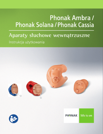 Aparaty słuchowe wewnątrzuszne Instrukcja użytkowania Spis treści 1. Witamy 5 2. Ważne informacje Prosimy o zapoznanie się z nimi przed uruchomieniem aparatów po raz pierwszy 6 Ostrzeżenia o zagrożeniach 6 Informacje o bezpiecznym używaniu produktu 8 3. Opis aparatu słuchowego 10 4. Instrukcje obsługi aparatu krok po kroku 13 Krok 1. Zapoznanie się z aparatem słuchowym 13 2 Krok 2. Przygotowanie baterii 16 Krok 3. Wkładanie baterii 16 Krok 4. Włączanie aparatu słuchowego 17 Krok 5. Wkładanie aparatu słuchowego 18 Krok 6. Regulowanie poziomu głośności w aparacie wewnątrzusznym 20 Krok 7. Wybieranie programu w aparacie wewnątrzusznym 22 Krok 8. Wyjmowanie aparatu słuchowego 23 Krok 9. Wyłączanie aparatu słuchowego 25 Krok 10. Wymiana baterii 25 5. Pielęgnacja i konserwacja 26 6. Rozwiązywanie problemów 29 7. Akcesoria bezprzewodowe i systemy FM 31 8. Informacje o gwarancji 33 9. Informacje na temat zgodności 34 10. Informacje i objaśnienia dotyczące symboli 37 3 4 1. Witamy Prezentowany aparat słuchowy to szwajcarski produkt wysokiej jakości. Został on opracowany przez firmę Phonak, jednego ze światowych liderów w dziedzinie technologii systemów słuchowych. Aparat ten został wyposażony w najnowocześniejszą, dostępną obecnie na rynku, cyfrową technologię wspomagającą słyszenie. Prosimy o dokładne zapoznanie się z niniejszą instrukcją użytkowania, aby móc w pełni wykorzystać wszystkie możliwości nowego aparatu słuchowego. Właściwe użytkowanie i pielęgnacja aparatu pozwolą cieszyć się nim przez wiele lat. W przypadku jakichkolwiek pytań skonsultuj się z protetykiem słuchu. Phonak - life is on www.phonak.pl 0459 5 2.Ważne informacje Przed użyciem aparatu prosimy o zapoznanie się z informacjami znajdującymi się na następnych stronach. Aparat słuchowy nie przywróci prawidłowego słuchu, nie zdoła zapobiec uszkodzeniu słuchu o podłożu naturalnym ani nie zmniejszy go. Jednak nieregularne używanie aparatu słuchowego uniemożliwia użytkownikowi jego pełne wykorzystanie. Stosowanie aparatu słuchowego jest tylko częścią rehabilitacji słuchu i może wymagać dodatkowego treningu słuchowego oraz poznania zasad czytania z ruchu warg. 2.1Ostrzeżenia o zagrożeniach Korzystaj wyłącznie z aparatu słuchowego, który został zaprogramowany przez protetyka słuchu specjalnie dla Ciebie. Inne aparaty mogą być nieskuteczne, a w pewnych przypadkach mogą u osób je stosujących spowodować uszkodzenie słuchu. N ie wprowadzaj do aparatów słuchowych zmian ani modyfikacji, które nie zostały jednoznacznie zatwierdzone przez firmę Phonak. Zmiany takie mogą uszkodzić słuch lub aparat słuchowy. 6 Baterie do aparatu słuchowego są toksyczne! Przechowuj je z dala od dzieci i zwierząt domowych. Jeśli baterie zostaną połknięte, natychmiast skonsultuj się z lekarzem! Jeśli czujesz ból w uchu lub za nim, widać stan zapalny, skóra jest podrażniona bądź pojawiła się nadmierna woskowina, skontaktuj się z protetykiem słuchu lub lekarzem. Aparaty słuchowe działające w trybie mikrofonu kierunkowego redukują dźwięki z otoczenia. Musisz zdawać sobie sprawę, że dochodzące od tyłu sygnały ostrzegawcze i dźwięki wydawane np. przez samochód są częściowo lub całkowicie tłumione. Aparat słuchowy zawiera małe elementy, które mogą zostać połknięte przez dzieci. Urządzenia zewnętrzne mogą być podłączane pod warunkiem, że zostały przetestowane zgodnie ze standardami IECXXXXX. Używaj wyłącznie akcesoriów zatwierdzonych przez firmę Phonak. 7 2. Ważne informacje 2.2 Informacje o bezpiecznym używaniu produktu Nigdy nie zanurzaj aparatu słuchowego w wodzie! Chroń urządzenie przed nadmierną wilgocią. Zawsze zdejmuj aparat słuchowy przed myciem, kąpielą lub pływaniem. Chroń aparat słuchowy przed wysoką temperaturą (nie zostawiaj go w pobliżu okna czy w samochodzie). Nie osuszaj aparatu słuchowego w mikrofalówce ani w innych urządzeniach grzewczych. Zapytaj protetyka słuchu o odpowiednie sposoby osuszania. Kiedy nie korzystasz z aparatu słuchowego, zostaw komorę baterii otwartą, aby umożliwić odparowanie wilgoci. Zawsze upewnij się, czy aparat słuchowy został po użyciu dokładnie osuszony. Przechowuj aparat w bezpiecznym, suchym i czystym miejscu. Chroń aparat przed wstrząsami i uderzeniami! Zrzucenie aparatu na twardą powierzchnię może go uszkodzić. 8 Używaj zawsze tylko nowych baterii do aparatu. Zużyte baterie możesz zwrócić protetykowi słuchu. Jeśli nie używasz aparatu słuchowego przez dłuższy czas, wyjmij z niego baterie. Naświetlanie promieniami X (Rentgen, tomografia komputerowa lub obrazowanie metodą rezonansu magnetycznego) może wpływać niekorzystnie na działanie aparatu słuchowego. Zawsze wyjmuj aparat przed naświetlaniem i zostawiaj go poza miejscem badania. Nie korzystaj z aparatu w miejscach, w których stosowanie urządzeń elektronicznych jest zabronione. 9 3. Opis aparatu słuchowego W niniejszej instrukcji użytkowania opisane zostały cztery modele aparatów słuchowych: nano i CIC/MC - umieszczane głęboko w przewodzie słuchowym, ITC/HS - umieszczane w przewodzie słuchowym lub w małżowinie usznej, oraz FS - umieszczane w małżowinie usznej. Na następnych stronach znajdują się opisane ilustracje, za pomocą których na pewno rozpoznasz swój aparat słuchowy. Uwaga: konkretny model może nie obsługiwać wszystkich funkcji opisanych na następnych stronach - niektóre z nich to funkcje opcjonalne. Protetyk słuchu poinformuje Cię, jakiego typu baterii potrzebujesz do swojego aparatu. 10 Phonak nano oraz model CIC/MC m n o l p k j q j Indywidualna obudowa k Słuchawka (wyjście dźwiękowe) i filtr przeciwwoskowinowy l Komora baterii z funkcją włączania/wyłączania m Przełącznik programów (opcja)* n Osłonięte wloty mikrofonów (dwa w przypadku modeli z technologią kierunkową) o Uchwyt do wyjm