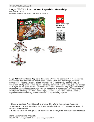 http://klocki24.com Lego 75021 Star Wars Republic Gunship kod produktu: 75021 kategoria: Klocki24com > LEGO Star Wars > Epizod_2 Producent: Lego 649,90 zł Waga: 2kg Kod QR: Lego 75021 Star Wars Republic Gunship. Wyrusz na Geonosis™ w niesamowitej kanonierce Republiki LEGO® Star Wars™ i uratuj Obi-Wana Kenobiego, Anakina Skywalkera i Padmé Amidalę, zanim pokonają ich 2 superdroidy bojowe! Celuj z 4 wieżyczek z kokpitami na minifigurki i otwórz przedni schowek i załaduj rakiety z niego do 8 wyrzutni na górze statku! Otwórz boczne i tylne drzwiczki, aby wypuścić skutery! Dzięki uchwytowi możesz łatwiej bawić się modelem w powietrzu! Zestaw zawiera 7 minifigurek z bronią: Obi-Wana Kenobiego, Anakina Skywalkera, Padmé Amidalę, kapitana klonów-żołnierzy, klona-żołnierza i 2 superdroidy bojowe. • Zestaw zawiera 7 minifigurek z bronią: Obi-Wana Kenobiego, Anakina Skywalkera, Padmé Amidalę, kapitana klonów-żołnierzy™, klona-żołnierza i 2 superdroidy bojowe. • Kanonierka ma 4 wieżyczki z miejscami na minifigurki, wystrzeliwane rakiety, strona: 1/2 wydrukowano: 07-03-2017 http://klocki24.com/lego-75021-star-wars-republic-gunship.html 8 wyrzutni rakiet w górnej części, boczne i tylne drzwiczki, skuter oraz uchwyt. • Bronie: 2 miecze świetlne, pistolet blasterowy, blaster i karabin blasterowy. • Celuj i strzelaj z wieżyczek. • Załaduj wyrzutnie rakiet! • Otwórz kokpity i posadź w nich minifigurki. • Odtwórz niesamowite sceny walki z filmu Gwiezdne Wojny™: Epizod 2 — Atak klonów. • Odtwórz jeszcze większą bitwę o Geonosis™ z droidem Sojuszu Korporacyjnego z zestawu 75015, pajęczym droidem z zestawu 75021 i czołgiem AT-TE™ z zestawu 75019. • Wymiary: ok. 20 cm wysokości, 48 cm długości i 43 cm szerokości. Kod EAN/ISBN 5702014974753 strona: 2/2 wydrukowano: 07-03-2017 http://klocki24.com/lego-75021-star-wars-republic-gunship.html