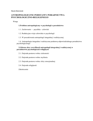 Marek Dziewiecki ANTROPOLOGICZNE PODSTAWY PORADNICTWA PSYCHOLOGICZNO-RELIGIJNEGO Wstęp 1.Problem antropologiczny w psychologii a poradnictwa 1.1. Zachowanie — psychika - człowiek 1.2. Redukcyjne wizje człowieka w psychologii 1.3. W poszukiwaniu antropologii integralnej i realistycznej 1.4. Antropologia integralna i realistyczna podstawą odpowiedzialnego poradnictwa psychologicznego 2.Główne sfery weryfikacji antropologii integralnej i realistycznej w poradnictwie psychologiczno-religijnym 2.1. Dojrzała postawa wobec cielesności 2.2. Dojrzała postawa wobec myślenia 2.3. Dojrzała postawa wobec sfery emocjonalnej 2.4. Dojrzała religijność Zakończenie Wstęp Koniec XX-tego wieku w cywilizacji Zachodniej charakteryzuje się bolesnym kryzysem człowieka. Jednoznacznie potwierdzają to obiektywne wyznaczniki. Rośnie ilość samobójstw oraz liczba osób chorych psychicznie. Dramatycznie wzrasta przestępczość, a także ilość ludzi uzależnionych, zwłaszcza od alkoholu i narkotyków. Kryzys poszczególnych osób wiąże się z kryzysem rodzin i całych społeczeństw. W tej sytuacji coraz więcej ludzi szuka pomocy: materialnej, prawnej, społecznej, religijnej. Coraz więcej też osób — także w Polsce szuka z pomocy psychologicznej i terapeutycznej. Jednocześnie okazuje się, że poradnictwo psychologiczne jest często nieadekwatne. Nierzadko zdarza się, że interwencja danego psychologa pogarsza jeszcze sytuację człowieka, który szuka pomocy. Bez przesady można powiedzieć, że współczesne poradnictwo psychologiczne także przeżywa kryzys. Odnotowujemy niepokojący fakt, że wzrostowi ilości psychologów towarzyszy wzrost liczby osób chorych psychicznie. Brytyjski socjolog, S. Andreski (1974) zauważa, że jeśli jakaś profesja oparta jest na rzetelnej wiedzy, to istnieje pozytywny związek pomiędzy ilością osób uprawiających ten zawód, a osiągniętymi rezultatami. "Zatem w kraju, posiadającym mnóstwo inżynierów telekomunikacji, dostępność usług telefonicznych będzie zwykle większa niż w kraju, który posiada niewielką liczbę tego typu specjalistów. W krajach o dużej liczbie lekarzy i pielęgniarek śmiertelność będzie niższa niż tam, gdzie zawody te należą do rzadkości. Powinno się więc okazać, że w krajach, regionach, instytucjach lub sektorach, w których szeroko korzysta się z usług psychologów, rodziny są bardziej trwałe; więzy pomiędzy małżonkami, rodzeństwem, rodzicami i dziećmi są silniejsze i bardziej serdeczne, stosunki w pracy są bardziej harmonijne; wandali, przestępców i narkomanów jest mniej niż w miejscach lub środowiskach, które nie korzystają z umiejętności psychologów" (Andreski 1974 s. 25-6). Tymczasem możemy skonstatować, że "ulice są niebezpieczne. Rodziny są w rozsypce. Młodzi ludzie odbierają sobie życie. A gdy społeczeństwo psychologiczne usiłuje się z tymi problemami uporać, często zdaje się je tylko pogłębiać. Na przykład, otwieraniu w miastach ośrodków zapobiegania samobójstwom towarzyszy wzrost liczby samobójstw. Poradnictwo małżeńskie nierzadko doprowadza do rozwodu. A wprowadzenie na szeroką skalę publicznej edukacji seksualnej nie zdołało, choćby w najmniejszym stopniu, powstrzymać wzrostu liczby przypadków niechcianej ciąży, rozwiązłości i chorób wenerycznych. Trudno oprzeć się twierdzeniu, że przypisane lekarstwo może być przyczyną choroby" (Kilpatrick 1997 s. 32). W obliczu kryzysu współczesnego poradnictwa psychologicznego rodzi się pytanie: jaki jest podstawowy warunek, by pomoc psychologiczna mogła być bardziej adekwatna i skuteczna niż dotąd? Sądzę, iż warunkiem tym jest oparcie poradnictwa psychologicznego na adekwatnej antropologii, która oznacza przyjęcie przez psychologów integralnej i realistycznej koncepcji człowieka. Jakiekolwiek zawężenie czy wypaczenie koncepcji człowieka w psychologii prowadzi bowiem do zawężenia czy wypaczenia treści i metod poradnictwa, proponowanego przez daną szkołę psychologiczną czy przez danego psychologa. 1.Problem antropologiczny w psychologii a poradnictwo 1.1. Zachowanie — psychika - człowiek Psychologia jest nauką, która analizuje i bada zachowanie człowieka po to, by je coraz lepiej rozumieć, by promować zachowania dojrzale oraz by - w razie potrzeby modyfikować zachowania niedojrzałe czy zaburzone. Psychologia staje zatem w obliczu potrójnej rzeczywistość. Wyrusza od obserwacji zachowania człowieka. Następnie stara się odkryć i wyjaśnić fizyczne i psychospołeczne uwarunkowania tegoż zachowania. Wreszcie staje w obliczu tajemnicy człowieka i jego życia. Do psychologa przychodzi bowiem nie ludzka psychika, lecz człowiek. Pomocy u psychologa nie szukają bolesne emocje, zaburzone strategie myślenia czy błędne sposoby decydowania, lecz człowiek. Cały człowiek. Psycholodzy mogą tylko na tyle udzielać odpowiedzialnej i adekwatnej pomocy psychologicznej, na ile rozumieją oni całego człowieka. Tymczasem współczesna psychologia bada coraz chętniej fragmenty ludzkiej rzeczywistości. Coraz bardziej adekwatnie rozumie zachowania cząstkowe i coraz mniej adekwatnie radzi sobie z tajemnicą całego człowieka. 1.2. Redukcyjne wizje człowieka w psychologii Podstawową bolączką współczesnej psychologii jest zjawisko, które możemy nazwać problemem antropologicznym. Oznacza to, że większość szkół i systemów psychologicznych odwołuje się — w sposób ujawniony lub zamaskowany — do koncepcji antropologicznych, które charakteryzują się redukcjonizmem oraz brakiem realizmu. Psychologiczne interpretacje poradnictwa i zdrowia psychicznego odzwierciedlają spór o podstawowe założenia antropologiczne dotyczące człowieka, jego natury oraz ostatecznego sensu jego istnienia. W konsekwencji zasadniczych różnic antropologicznych poszczególne kierunki psychologiczne nie są zgodne co do tego, jakiego typu zachowania 