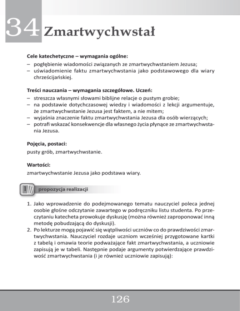 34 Zmartwychwstał Cele katechetyczne – wymagania ogólne: – pogłębienie wiadomości związanych ze zmartwychwstaniem Jezusa; – uświadomienie faktu zmartwychwstania jako podstawowego dla wiary chrześcijańskiej. Treści nauczania – wymagania szczegółowe. Uczeń: – streszcza własnymi słowami biblijne relacje o pustym grobie; – na podstawie dotychczasowej wiedzy i wiadomości z lekcji argumentuje, że zmartwychwstanie Jezusa jest faktem, a nie mitem; – wyjaśnia znaczenie faktu zmartwychwstania Jezusa dla osób wierzących; – potrafi wskazać konsekwencje dla własnego życia płynące ze zmartwychwstania Jezusa. Pojęcia, postaci: pusty grób, zmartwychwstanie. Wartości: zmartwychwstanie Jezusa jako podstawa wiary. propozycja realizacji 1Propozycja realizacji: 1. Jako wprowadzenie do podejmowanego tematu nauczyciel poleca jednej osobie głośne odczytanie zawartego w podręczniku listu studenta. Po przeczytaniu katecheta prowokuje dyskusję (można również zaproponować inną metodę pobudzającą do dyskusji). 2. Po lekturze mogą pojawić się wątpliwości uczniów co do prawdziwości zmartwychwstania. Nauczyciel rozdaje uczniom wcześniej przygotowane kartki z tabelą i omawia teorie podważające fakt zmartwychwstania, a uczniowie zapisują je w tabeli. Następnie podaje argumenty potwierdzające prawdziwość zmartwychwstania (i je również uczniowie zapisują): 126 Teorie zaprzeczające zmartwychwstaniu Jezusa Argumenty potwierdzające zmartwychwstanie Jezusa Wnioski 3. Uczniowie w parach pracują z tekstami z podręcznika, analizują wypełnioną w części tabelę i formułują wnioski, które zapisują w kolejnej rubryce. 4. Uczniowie na forum klasy przedstawiają efekty swojej pracy. Uwaga: Do omówienia argumentów za i przeciw zmartwychwstaniu można posłużyć się wcześniej przygotowaną prezentacją na ten temat. propozycja pracypracy na lekcji: propozycja na lekcji 3 inna 12Inna Lekcja zaczyna się od odczytania jednej z ewangelicznych relacji o pustym grobie. Następnie nauczyciel referuje zarzuty przeciwko zmartwychwstaniu, a uczniowie starają się zbić je za pomocą dostępnych im wiadomości. W swojej pracy nie powinni posługiwać się podręcznikiem. Tę lekcję można też przeprowadzić metodą trybunału. Modlitwa: odczytanie fragmentu 1 Kor 15, 17–20 z podręcznika ucznia. Polecenie 1. oraz 2. lub 3. z podręcznika ucznia. Korelacja z innymi przedmiotami: język polski – zmartwychwstanie w literaturze; plastyka – zmartwychwstanie w malarstwie; muzyka – zmartwychwstanie w muzyce: najsłynniejsze Alleluja, polskie pieśni wielkanocne. 127