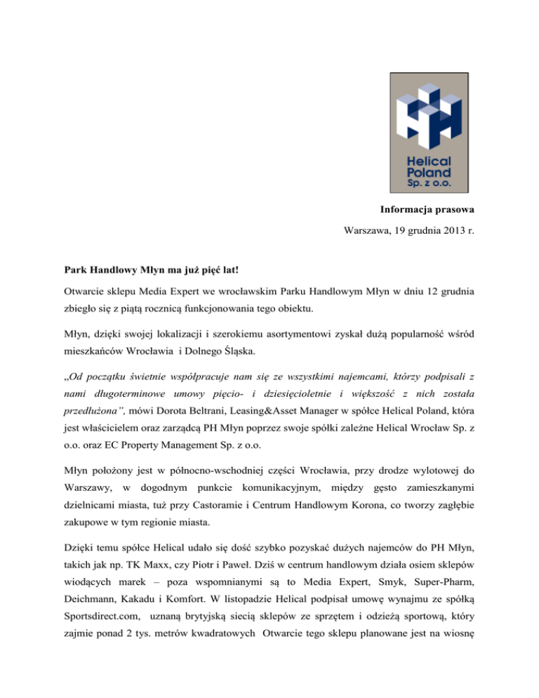 Informacja prasowa Warszawa, 19 grudnia 2013 r. Park Handlowy Młyn ma już pięć lat! Otwarcie sklepu Media Expert we wrocławskim Parku Handlowym Młyn w dniu 12 grudnia zbiegło się z piątą rocznicą funkcjonowania tego obiektu. Młyn, dzięki swojej lokalizacji i szerokiemu asortymentowi zyskał dużą popularność wśród mieszkańców Wrocławia i Dolnego Śląska. „Od początku świetnie współpracuje nam się ze wszystkimi najemcami, którzy podpisali z nami długoterminowe umowy pięcio- i dziesięcioletnie i większość z nich została przedłużona”, mówi Dorota Beltrani, Leasing&Asset Manager w spółce Helical Poland, która jest właścicielem oraz zarządcą PH Młyn poprzez swoje spółki zależne Helical Wrocław Sp. z o.o. oraz EC Property Management Sp. z o.o. Młyn położony jest w północno-wschodniej części Wrocławia, przy drodze wylotowej do Warszawy, w dogodnym punkcie komunikacyjnym, między gęsto zamieszkanymi dzielnicami miasta, tuż przy Castoramie i Centrum Handlowym Korona, co tworzy zagłębie zakupowe w tym regionie miasta. Dzięki temu spółce Helical udało się dość szybko pozyskać dużych najemców do PH Młyn, takich jak np. TK Maxx, czy Piotr i Paweł. Dziś w centrum handlowym działa osiem sklepów wiodących marek – poza wspomnianymi są to Media Expert, Smyk, Super-Pharm, Deichmann, Kakadu i Komfort. W listopadzie Helical podpisał umowę wynajmu ze spółką Sportsdirect.com, uznaną brytyjską siecią sklepów ze sprzętem i odzieżą sportową, który zajmie ponad 2 tys. metrów kwadratowych Otwarcie tego sklepu planowane jest na wiosnę 2014 r. To szósty sklep tej sieci w Polsce - w czerwcu Sportsdirect.com otworzył liczący ponad 2,3 tys. metrów kwadratowych powierzchni lokal w zarządzanym przez spółkę EC Property Management Centrum Handlowym Europa Centralna w Gliwicach. „PH Młyn był naszym pierwszym projektem w Polsce. Okazał się wyjątkowo udany i stanowi pewnego rodzaju model dla planu parków handlowych średniej wielkości, których budowę planujemy w ciągu najbliższych pięciu lat. Wiosną przyszłego roku chcielibyśmy ogłosić start dwóch podobnych projektów, które byłyby otwarte wiosną 2015 r.”, mówi Jonathan Tinker, członek Zarządu Helical Poland. Otwarty w grudniu 2008 r. Nazwa pochodzi od zabytkowego Młyna Sułkowice, wybudowanego w sąsiedztwie dzisiejszej inwestycji w 1890 r. Na prawie 10 000 m 2 powierzchni handlowej znajduje się osiem sklepów wiodących marek (Media Expert, Smyk, Piotr i Paweł, TKMaxx, Super-Pharm, Deichmann, Kakadu, i Komfort), gwarantujące najwyższej jakości towary i obsługę. Otwarta formuła Parku Handlowego Młyn, z lokalami dostępnymi bezpośrednio z parkingu, gwarantuje wygodne i szybkie zakupy. Właścicielem i zarządcą Parku Handlowego Młyn jest firma Helical Poland poprzez swoje spółki zależne Helical Wrocław Sp. z o.o oraz EC Property Management Sp. z o.o. PH Młyn dysponuje 250 bezpłatnymi miejscami parkingowymi. Kontakt: Dorota Beltrani Tel. 601 241 388 [email protected] www.parkhandlowy-mlyn.pl