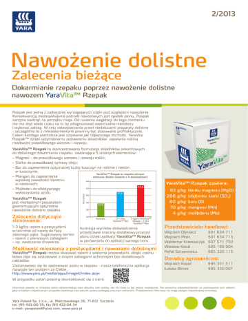 2/2013 � Nawożenie dolistne � Zalecenia bieżące Dokarmianie rzepaku poprzez nawożenie dolistne nawozem YaraVita™ Rzepak Rzepak jest jedną z najbardziej wymagających roślin pod względem nawożenia. Konsekwencją niezaspokojenia potrzeb nawozowych jest spadek plonu. Rzepak zaczyna kwitnąć na początku maja. Od ruszenia wegetacji do tego momentu nie ma zbyt wiele czasu na to by zdiagnozować ewentualne niedobory i wykonać zabieg. W celu zabezpieczenia przed niedoborami preparaty dolistne - szczególnie te z mikroelementami powinny być stosowane profilaktycznie. Celem każdego plantatora jest uzyskanie jak najlepszego dochodu. YaraVita Rzepak™ dzięki optymalnemu zestawieniu składników zapewnia rośliną możliwość prawidłowego wzrostu i rozwoju. YaraVita™ Rzepak jest niezbędnym preparatem gwarantującym optymalne nawożenie dolistne rzepaku. Zalecenia dotyczące stosowania: 1–3 kg/ha razem z pestycydami w terminie od rozety do fazy zielonego pąka. Sugerowany termin – razem z pierwszym zabiegiem – np. zwalczanie chowacza. Plon [dt/ha] YaraVita™ Rzepak to skoncentrowana formulacja składników pokarmowych do dolistnego dokarmiania rzepaku, zawierająca 5 istotnych elementów: – Magnez – do prawidłowego wzrostu i rozwoju roślin; – Siarka do prawidłowej syntezy oleju; – Bor do zapewnienia optymalnej liczby łuszczyn na roślinie i nasion w łuszczynie; YaraVita™ Rzepak w rzepaku ozimym – Mangan do zapewnienia odmiana: Baldur (średnia z 4 doświadczeń) wysokiej zawartości tłuszczu 44 w nasionach; 42,8 42 – Molibden do efektywnego wykorzystania azotu. 41,0 40 38 37,8 36 34 Kontrola 3*1 l/ha 3 kg/ha YaraVita™ YaraVita™ Bor Rzepak + 1 l/ha YaraVita™ Bor Ilustracja wyników doświadczenia przedstawia znaczny dodatkowy przyrost plonu dzięki aplikacji YaraVita™ Rzepak w porównaniu do aplikacji samego boru. Możliwość mieszania z pestycydami i nawozami dolistnymi YaraVita™ Rzepak można stosować razem z wieloma preparatami, dzięki czemu łatwo daje się zastosować z innymi zabiegami ochronnymi bez dodatkowych nakładów. Zastanawiasz się ile zastosować azotu w rzepaku - nasza telefoniczna aplikacja rozwiąże ten problem za Ciebie. http://www.yara.pl/media/apps/imageit/index.aspx YaraVita™ Rzepak zawiera: 83 288 80 70 4 g/kg g/kg g/kg g/kg g/kg tlenku magnezu (MgO) trójtlenku siarki (SO3) boru (B) manganu (Mn) molibdenu (Mo) Przedstawiciele handlowi: Wojciech Oleniacz Wojciech Mróz Waldemar Krzesiwczyk Wiesław Kocoł Rafał Szczanowicz 60 1 60 1 607 605 665 634 634 57 1 1 99 320 71 1 713 7 50 904 1 15 Doradcy agronomiczni: Wojciech Kopeć Łukasz Biniek 695 33 1 5 1 1 695 330 007 W przypadku pytań prosimy skontaktować się z nami. Informacje zawarte w niniejszej ulotce odzwierciedlają nasz aktualny stan wiedzy, ale nie może to być jedyne rozwiązanie. Nie ponosimy odpowiedzialności za zastosowanie tych zaleceń, gdyż w każdym indywidualnym przypadku lokalizacja oraz warunki uprawy podlegają znacznym wahaniom. Przedstawione informacje nie mogą zastąpić indywidualnej konsultacji. Yara Poland Sp. z o.o., ul. Malczewskiego 26, 71-612 Szczecin tel. (91) 433 00 35, fax (91) 433 04 34 e-mail: [email protected], www.yara.pl