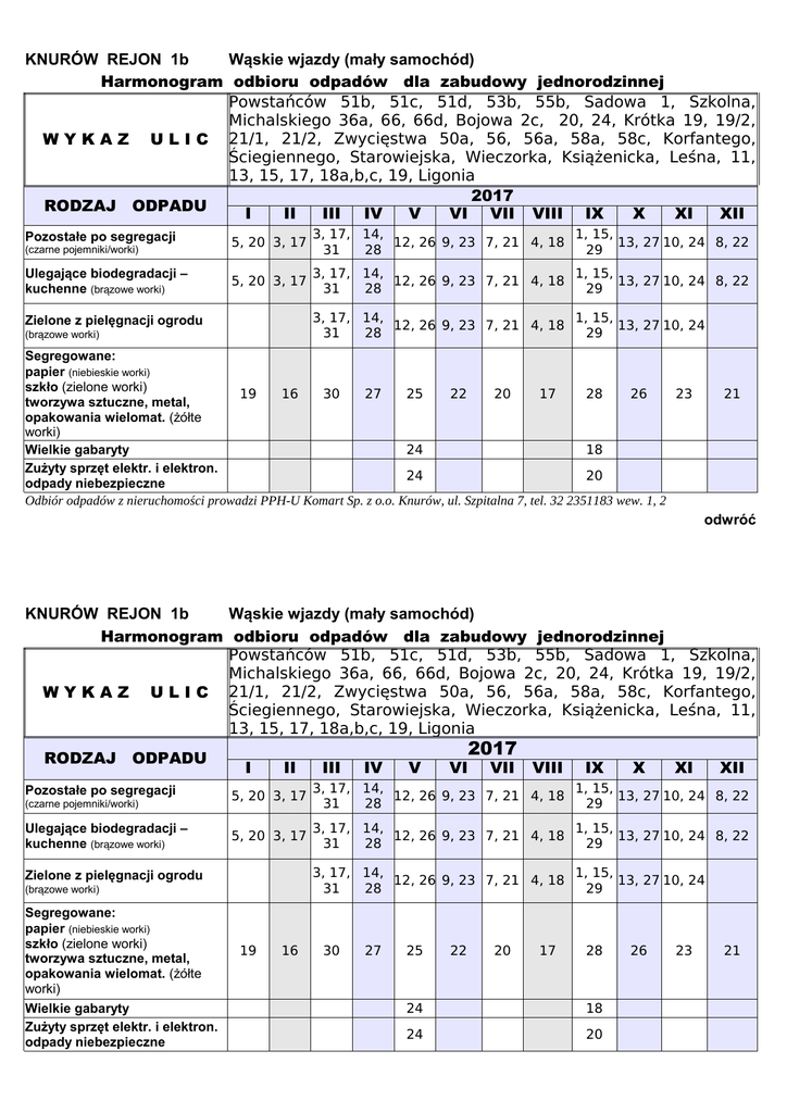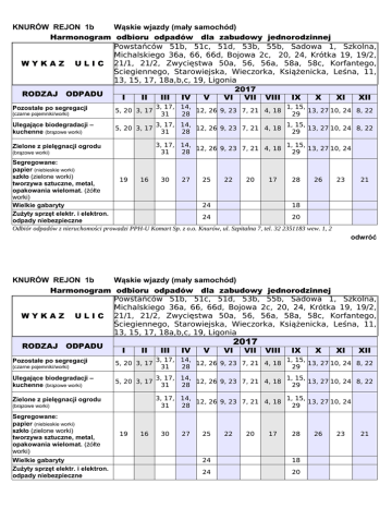 KNURÓW REJON 1b Wąskie wjazdy (mały samochód) Harmonogram odbioru odpadów dla zabudowy jednorodzinnej Powstańców 51b, 51c, 51d, 53b, 55b, Sadowa 1, Szkolna, Michalskiego 36a, 66, 66d, Bojowa 2c, 20, 24, Krótka 19, 19/2, W Y K A Z U L I C 21/1, 21/2, Zwycięstwa 50a, 56, 56a, 58a, 58c, Korfantego, Ściegiennego, Starowiejska, Wieczorka, Książenicka, Leśna, 11, 13, 15, 17, 18a,b,c, 19, Ligonia 2017 RODZAJ ODPADU I II III IV V VI VII VIII IX X XI XII Pozostałe po segregacji (czarne pojemniki/worki) Ulegające biodegradacji – kuchenne (brązowe worki) 5, 20 3, 17 3, 17, 14, 1, 15, 12, 26 9, 23 7, 21 4, 18 13, 27 10, 24 8, 22 31 28 29 5, 20 3, 17 3, 17, 14, 1, 15, 12, 26 9, 23 7, 21 4, 18 13, 27 10, 24 8, 22 31 28 29 3, 17, 14, 1, 15, 12, 26 9, 23 7, 21 4, 18 13, 27 10, 24 31 28 29 Zielone z pielęgnacji ogrodu (brązowe worki) Segregowane: papier (niebieskie worki) szkło (zielone worki) 19 16 30 27 25 22 20 17 28 26 23 tworzywa sztuczne, metal, opakowania wielomat. (żółte worki) 24 18 Wielkie gabaryty Zużyty sprzęt elektr. i elektron. 24 20 odpady niebezpieczne Odbiór odpadów z nieruchomości prowadzi PPH-U Komart Sp. z o.o. Knurów, ul. Szpitalna 7, tel. 32 2351183 wew. 1, 2 21 odwróć KNURÓW REJON 1b Wąskie wjazdy (mały samochód) Harmonogram odbioru odpadów dla zabudowy jednorodzinnej Powstańców 51b, 51c, 51d, 53b, 55b, Sadowa 1, Szkolna, Michalskiego 36a, 66, 66d, Bojowa 2c, 20, 24, Krótka 19, 19/2, W Y K A Z U L I C 21/1, 21/2, Zwycięstwa 50a, 56, 56a, 58a, 58c, Korfantego, Ściegiennego, Starowiejska, Wieczorka, Książenicka, Leśna, 11, 13, 15, 17, 18a,b,c, 19, Ligonia RODZAJ ODPADU Pozostałe po segregacji (czarne pojemniki/worki) Ulegające biodegradacji – kuchenne (brązowe worki) I II IV V VI VII VIII IX X XI XII 5, 20 3, 17 3, 17, 14, 1, 15, 12, 26 9, 23 7, 21 4, 18 13, 27 10, 24 8, 22 31 28 29 5, 20 3, 17 3, 17, 14, 1, 15, 12, 26 9, 23 7, 21 4, 18 13, 27 10, 24 8, 22 31 28 29 3, 17, 14, 1, 15, 12, 26 9, 23 7, 21 4, 18 13, 27 10, 24 31 28 29 Zielone z pielęgnacji ogrodu (brązowe worki) Segregowane: papier (niebieskie worki) szkło (zielone worki) tworzywa sztuczne, metal, opakowania wielomat. (żółte worki) Wielkie gabaryty Zużyty sprzęt elektr. i elektron. odpady niebezpieczne III 2017 19 16 30 27 25 22 20 17 28 24 18 24 20 26 23 21 Odbiór odpadów z nieruchomości prowadzi PPH-U Komart Sp. z o.o. Knurów, ul. Szpitalna 7, tel. 32 2351183 wew. 1, 2 odwróć