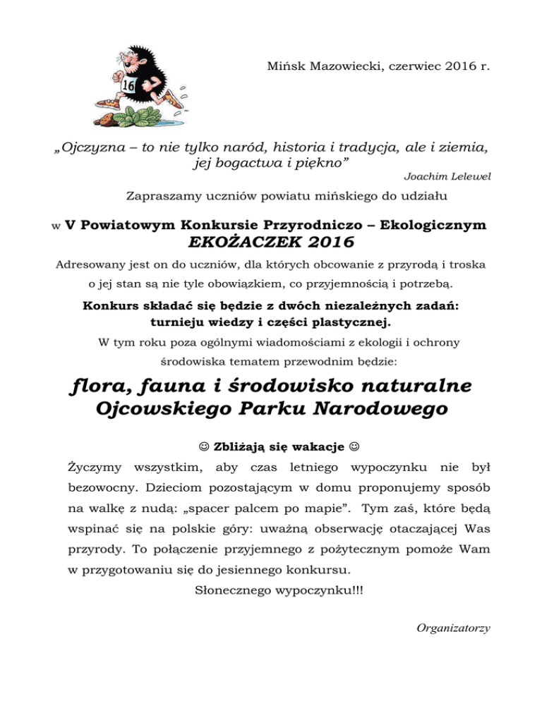 Mińsk Mazowiecki, czerwiec 2016 r. „Ojczyzna – to nie tylko naród, historia i tradycja, ale i ziemia, jej bogactwa i piękno” Joachim Lelewel Zapraszamy uczniów powiatu mińskiego do udziału w V Powiatowym Konkursie Przyrodniczo – Ekologicznym EKOŻACZEK 2016 Adresowany jest on do uczniów, dla których obcowanie z przyrodą i troska o jej stan są nie tyle obowiązkiem, co przyjemnością i potrzebą. Konkurs składać się będzie z dwóch niezależnych zadań: turnieju wiedzy i części plastycznej. W tym roku poza ogólnymi wiadomościami z ekologii i ochrony środowiska tematem przewodnim będzie: flora, fauna i środowisko naturalne Ojcowskiego Parku Narodowego ☺ Zbliżają się wakacje ☺ Życzymy wszystkim, aby czas letniego wypoczynku nie był bezowocny. Dzieciom pozostającym w domu proponujemy sposób na walkę z nudą: „spacer palcem po mapie”. Tym zaś, które będą wspinać się na polskie góry: uważną obserwację otaczającej Was przyrody. To połączenie przyjemnego z pożytecznym pomoże Wam w przygotowaniu się do jesiennego konkursu. Słonecznego wypoczynku!!! Organizatorzy