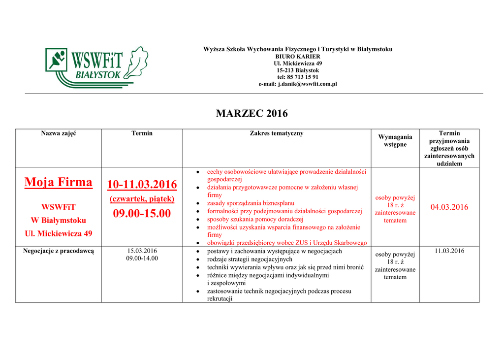 Wyższa Szkoła Wychowania Fizycznego i Turystyki w Białymstoku BIURO KARIER Ul. Mickiewicza 49 15-213 Białystok tel: 85 713 15 91 e-mail: [email protected] MARZEC 2016 Nazwa zajęć Moja Firma Termin 10-11.03.2016 (czwartek, piątek) WSWFiT W Białymstoku 09.00-15.00 Ul. Mickiewicza 49 Negocjacje z pracodawcą 15.03.2016 09.00-14.00 Zakres tematyczny cechy osobowościowe ułatwiające prowadzenie działalności gospodarczej działania przygotowawcze pomocne w założeniu własnej firmy zasady sporządzania biznesplanu formalności przy podejmowaniu działalności gospodarczej sposoby szukania pomocy doradczej możliwości uzyskania wsparcia finansowego na założenie firmy obowiązki przedsiębiorcy wobec ZUS i Urzędu Skarbowego postawy i zachowania występujące w negocjacjach rodzaje strategii negocjacyjnych techniki wywierania wpływu oraz jak się przed nimi bronić różnice między negocjacjami indywidualnymi i zespołowymi zastosowanie technik negocjacyjnych podczas procesu rekrutacji Wymagania wstępne osoby powyżej 18 r. ż zainteresowane tematem osoby powyżej 18 r. ż zainteresowane tematem Termin przyjmowania zgłoszeń osób zainteresowanych udziałem 04.03.2016 11.03.2016 Zredukuj stres 18.03.2016 09.00-14.00 Odkryj swój potencjał zawodowy i osobisty 21-22.03.2016 09.00-14.00 Asertywność bez tajemnic 23.03.2016 09.00-14.00 Bądź skuteczny w poszukiwaniu pracy 30.03.2016 09.00-14.00 Skutecznie zarządzam sobą w czasie 31.03.2016 09.00-14.00 rola stresu w życiu człowieka czynniki stresogenne analiza postaw życiowych poznanie i praktyczne przećwiczenie technik relaksacji i innych technik radzenia sobie ze stresem poznanie własnego potencjału zawodowego odkrycie własnych możliwości i wykorzystanie ich na rynku pracy kształtowanie aktywnych postaw nauczenie umiejętności świadomego kierowania swoimi decyzjami i drogą zawodową pojęcie asertywności rozpoznawanie zachowań asertywnych budowanie postawy asertywnej techniki asertywne zasady pisania CV i listu motywacyjnego; rodzaje CV najczęściej występujące błędy w dokumentach aplikacyjnych; zapoznanie ze sposobami prowadzenia rozmów z kandydatami do pracy; metody selekcji i rekrutacji; przygotowanie do rozmowy kwalifikacyjnej; analiza najczęściej zadawanych pytań na rozmowie kwalifikacyjnej sposoby formułowania i realizacji celów zastosowanie zasady SMART indywidualne style zarządzania czasem rozpoznanie własnego sposobu zarządzania sobą w czasie metody radzenia sobie z zaległościami osoby powyżej 18 r. ż zainteresowane tematem 16.03.2016 osoby powyżej 18 r. ż zainteresowane tematem 18.03.2016 osoby powyżej 18 r. ż zainteresowane tematem osoby powyżej 18 r. ż zainteresowane tematem 21.03.2016 osoby powyżej 18 r. ż zainteresowane tematem 29.03.2016 Informacje i zapisy: Warsztaty MOJA FIRMA – [email protected], telefonicznie 85 713 15 91, Dziekanat WSWFiT w Białymstoku (do 04.03.2016 r.) Pozostałe warsztaty: telefonicznie 85 74 97 244, [email protected] albo osobiście – Wojewódzki Urząd Pracy w Białymstoku, ul. Pogodna 22, Białystok, pokój nr 4 i 10. Warsztaty są bezpłatne. 25.03.2016