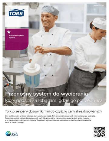 www.tork.pl Wygoda i większa higiena Przenośny system do wycierania który podąża za tobą tam, gdzie go potrzebujesz Tork przenośny dozownik mini do czyściw centralnie dozowanych Czy jest to punkt szybkiej obsługi, bar, sala konsumpcji, Tork przenośny dozownik mini jest zawsze pod ręką. Przeznaczony do użycia, jako dozownik stały lub przenośny, zabezpiecza papier przed wodą i brudem, a to zapewnia wysoki poziom higieny. Czystość, higiena i łatwość uzupełnienia, jak i wydajniejsza praca teraz w Twoim zasięgu. Wygodne rozwiązanie Dozownik zaprojektowany, aby zapewnić łatwość użycia, wygodę i maksymalną higienę w pracy. Jego zalety: • Przenośnydozownik,którymożnadokować • Elastycznedozowaniepapieru • Elastycznemocowanie-stacjadokującadołączona • Lekki,nadajesiędomyciawzmywarkach • Pozawieszeniumożliwedozowaniezapomocąjednejręki • Przyklikustacjachmożliwośćdokowaniawwielumiejscach Dozowniki Tork Performance Nr artykułu Kolor Format 658002 Turkus/biały 658001 Turkus/biały 658003 Biały Rodzaj wkładu Materiał szt./ TRP Rozmiar W x S x G Tork przenośny dozownik do czyściw w roli centralnie dozowanych + 1 stacja dokująca M1 plastik 1 263 x 239 x 185 Torkprzenośnydozownik-wariantstartowyzwkładem101221+2stacjedokujące M1 plastik 1 263 x 239 x 185 Tork dodatkowe stacje dokujące M1 plastik 10 12 x 161 x 97 Tork Wiping Paper / Tork czyściwo papierowe do lekkich zabrudzeń Nr artykułu Kolor Format Rodzaj wkładu 101030 Biały Rolka M1 Ilość warstw Długość rolki (m) Szerokość (cm) 1 120 21 Ilość odcinków /rolka Produktyztymsymbolemsądopuszczone do kontaktu z żywnością. szt. /TRP 11 TorkEasyHandling™oszczędzaczas i pieniądze, poprawia tez ergonomię pracy. Tork Wiping Paper Plus / Tork czyściwo papierowe do średnich zabrudzeń Nr artykułu Kolor Format Rodzaj wkładu 101221 Biały Rolka M1 Ilość warstw Długość rolki (m) Szerokość (cm) Ilość odcinków /rolka szt. /TRP 2 75 21 214 11 Tork oferuje szeroką gamę wkładów do tego i innych dozowników. Dystrybutor MOP SERWIS Sp. z o.o. ul. Ogrodowa 14, 82-500 Kwidzyn tel. 55 646 31 56 [email protected] www.mopserwis.pl SCA Hygiene Sp. z o.o. ul. Puławska 435a, 02-801 Warszawa Tel.: /22/ 543 75 00, Fax: /22/ 543 75 01 www.tork.pl Dział Obsługi Klienta tel.: /22/ 543 76 16-17, fax: 800 129 111 (połączenie bezpłatne) SE/04/01 PrzyznanonamznakEUEcolabelza: •Obniżenieemisjidwutlenkusiarki i gazów cieplarnianych •Obniżeniezanieczyszczeniawody chlorem i odpadami organicznymi •Obniżeniezużyciaenergiielektrycznej