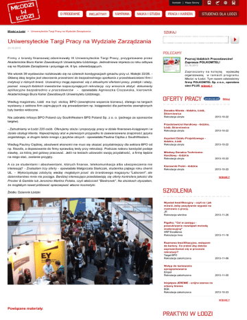 Kontakt | Mapa Strony Młodzi w Łodzi > Uniwersyteckie Targi Pracy na Wydziale Zarządzania Uniwersyteckie Targi Pracy na Wydziale Zarządzania 23.10.2013 F i r m y z b r a nży finansowej zdominowały IX Uniwersyteckie Targi Pracy, przygotowane przez Akademickie Biuro Karier Zawodowych Uniwersytetu Łódzkiego. Jednodniowa impreza co roku odbywa się na Wydziale Zarządzenia i przyciąga ok. 6 tys. odwiedzających. We wtorek 39 wystawców rozlokowało się na czterech kondygnacjach gmachu przy ul. Matejki 22/26. Główną ideą targów jest stworzenie przestrzeni do bezpośredniego spotkania z przedstawicielami firm i instytucji z różnych branż. Uczestnicy mogą zapoznać się z aktualnymi ofertami pracy, praktyk i staży, poznać nowych łódzkich inwestorów rozpoczynających rekrutację czy wreszcie złożyć dokumenty aplikacyjne bezpośrednio u pracodawców - opowiadała Agnieszka Ciszewska, kierownik Akademickiego Biura Karier Zawodowych Uniwersytetu Łódzkiego. Poznaj łódzkich Pracodawców! Zaprasza POLKOMTEL! 22.10.2013 Z a p r a s z a m y n a k o l e j ną wycieczkę organizowaną w r a m a c h p r o g r a m u Młodzi w Łodzi. Tym razem odwiedzimy firmę POLKOMTEL Sp. z o.o., operatora sieci PLUS. więcej > filtruj Według magistratu, Łódź ma być stolicą BPO (zewnętrzne wsparcie biznesu), dlatego na targach wystawcy z sektora firm zajmujących się prowadzeniem np. księgowości dla partnerów zewnętrznych były bardzo widoczne. Nie zabrakło Infosys BPO Poland czy SouthWestern BPS Poland Sp. z o. o. (jednego ze sponsorów targów). - Zatrudniamy w Łodzi 220 osób. Oferujemy staże i propozycję pracy w dziale finansowo-księgowym i w dziale obsługi klienta. Najważniejszy atut w pierwszym przypadku to zaawansowana znajomość języka angielskiego, w drugim także innego z języków obcych - opowiadała Paulina Ciężka z SouthWestern. Według Pauliny Ciężkiej, absolwent ekonomii nie musi się okazać przydatniejszy dla sektora BPO od np. filozofa, a dopasowanie do firmy sprawdzą testy przy rekrutacji. Podczas naboru kandydat podaje stawkę, za którą jest gotowy pracować. Jeśli na testach udowodni swoją przydatność, a firmę będzie na niego stać, zostanie przyjęty. A co ze studentami i absolwentami, których finanse, telekomunikacja albo ubezpieczenia nie interesują? - Znalazłam trzy oferty - opowiadała Małgorzata Stańczak, studentka piątego roku chemii UŁ. - Wykorzystując zdobytą wiedzę mogłabym pisać do branżowego magazynu "Laborant", ale dziennikarstwo mnie nie pociąga. Bardziej interesująco przedstawiają się oferty kontrolera jakości dla Procter & Gamble lub Jeronimo Martins Polska, czyli właścicieli "Biedronek". Na stoiskach słyszałam, że mogłabym nawet próbować opracowywać własne kosmetyki. Doradca Klienta - łódzkie, Łódź, Skierniewice Rekrutacja ukryta 2013-10-22 Przedstawiciel Handlowy - łódzkie, Łódź, Skierniewice Rekrutacja ukryta 2013-10-22 Asystent Działu Projektowego łódzkie, Łódź Rekrutacja ukryta 2013-10-22 Młodszy Doradca TechnicznoHandlowy - łódzkie Rekrutacja ukryta 2013-10-22 Kierownik Pralni - łódzkie Rekrutacja ukryta 2013-10-22 w ięcej > Źródło: Dziennik Łódzki Wywiad kwalifikacyjny - czyli co i jak mówić, żeby pozytywnie wypaść na rozmowie o pracę. JTI Rekrutacja wkrótce 2013-11-26 Pigułka: "Cel w zasięgu poszukiwanie rozwiązań metodą moderacyjną" HRP Excellence Rekrutacja trwa 2013-11-18 Rozmowa kwalifikacyjna, wstępem do kariery. Co zrobić aby dobrze zaprezentować się w procesie rekrutacji? Target BPO Rekrutacja zakończona 2013-11-06 Wstęp do testowania oprogramowania Ericpol Rekrutacja zakończona 2013-11-05 Inicjatywa JEREMIE - unijna szansa na w łasny biznes BGK Rekrutacja zakończona 2013-10-23 w ięcej > Powiązane materiały: • Zapraszamy na Uniwersyteckie Targi Pracy! Też tam… • Uniwersyteckie Targi Pracy już jutro! • VIII edycja Uniwersyteckich Targów Pracy • Uwaga studenci! W czwartek Dni Kariery w Łodzi • Poszukiwani studenci do współpracy przy Targach Pracy Praktykant na stanowisko Web Developer e-City Vison 2013-10-22 Praktykantka/Praktykant w Dziale Marketingu JNS Sp. z o.o. 2013-10-22 Konsultant Telefoniczny LDI DIMOTRANS POLAND SP. Z O.O. 2013-10-21 Praktyki Pion Produkcji Oprogramowania (DEV 10/13) Ericpol Sp. z o.o. 2013-10-21 Quality Assurance / Tester Hawkeye 2013-10-21 Oferta praktyk w fundacji Dziewczynka z zapałkami Fundacja Dziewczynka z zapałkami 2013-10-21 Młodzi w Łodzi Like 5,143 people like Młodzi w Łodzi. Facebook social plugin w ięcej > Imię, Nazwisko, Nick Email (wymagany, nie będzie publikowany) WWW Wszelkie prawa zastrzezone | All Rights Reserved (c) Urzad Miasta Lodzi 2008-2012 Urząd Miasta Łodzi Biuro Rozwoju Przedsiębiorczości i Miejsc Pracy UMŁ Al. Politechniki 32 93-590 Łódź tel. 042 638 47 00, 042 638 59 28 fax 042 638 44 85 e-mail: [email protected] Wykorzystujemy pliki cookies w celu realizacji usług, zgodnie z Polityką prywatności. Zapisywanie plików cookies można zablokować zmieniając ustawienia przeglądarki.Szczegółowe informacje dotyczące cookies > Rozumiem