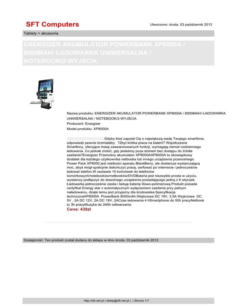 SFT Computers Utworzono: środa, 03 październik 2012 Tablety > akcesoria ENERGIZER AKUMULATOR POWERBANK XP8000A / 8000MAH/ ŁADOWARKA UNIWERSALNA / NOTEBOOK/2-WYJŚCIA Nazwa produktu: ENERGIZER AKUMULATOR POWERBANK XP8000A / 8000MAH/ ŁADOWARKA UNIWERSALNA / NOTEBOOK/2-WYJŚCIA Producent: Energizer Model produktu: XP8000A Gdyby ktoś zapytał Cię o największą wadę Twojego smartfona, odpowiedź pewnie brzmiałaby: ?Zbyt krótka praca na baterii? Współczesne Smartfony, oferujące masę zaawansowanych funkcji, wymagają niemal codziennego ładowania. Co jednak zrobić, gdy jesteśmy poza domem bez dostępu do źródła zasilania?Energizer Przenośny akumulator XP8000AXP8000A to obowiązkowy dodatek dla każdego użytkownika netbooka lub innego urządzenia przenośnego. Power Pack XP8000 jest wielkości aparatu BlackBerry, ale dostarcza wystarczającą moc, abyś mógł spokojnie dokończyć pracę, serfować po internecie i jednocześnie ładować telefon.W zestawie 15 końcówek do telefonów komórkowych/notebooków/netbooków/DVDBateria jest niezwykle prosta w użyciu, wystarczy podłączyć do dowolnego urządzenia posiadającego jedną z 6 wtyczek. Ładowarka jednocześnie zasila i ładuję baterię litowo-polimerową.Produkt posiada certyfikat Energy star z automatycznym wyłączeniem zasilania przy pełnym naładowaniu, dzięki temu jest przyjazny dla środowiska.Specyfikacja technicznaXP8000A PowerBank 8000mAh.Wejściowe DC 19V, 3,5A Wyjściowe DC 5V , 2A DC 12V, 2A DC 19V, 2ACzas ładowania 4 hSmartphone do 50h pracyNetbook to 3h pracyMuzyka do 240h odtwarzania Cena: 438zł Dostępność: Ten produkt został dodany do sklepu w dniu środa, 03 październik 2012 http://sft.net.pl | [email protected] | | Strona 1/1