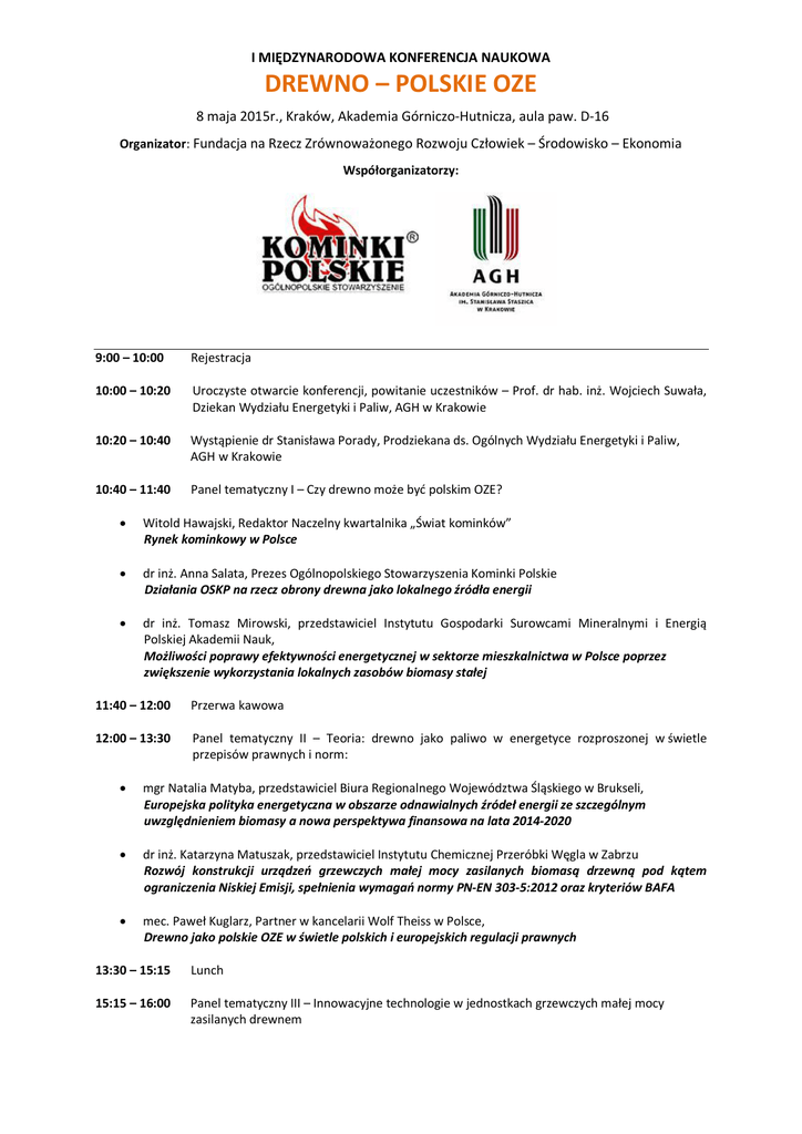 I MIĘDZYNARODOWA KONFERENCJA NAUKOWA DREWNO – POLSKIE OZE 8 maja 2015r., Kraków, Akademia Górniczo-Hutnicza, aula paw. D-16 Organizator: Fundacja na Rzecz Zrównoważonego Rozwoju Człowiek – Środowisko – Ekonomia Współorganizatorzy: 9:00 – 10:00 Rejestracja 10:00 – 10:20 Uroczyste otwarcie konferencji, powitanie uczestników – Prof. dr hab. inż. Wojciech Suwała, Dziekan Wydziału Energetyki i Paliw, AGH w Krakowie 10:20 – 10:40 Wystąpienie dr Stanisława Porady, Prodziekana ds. Ogólnych Wydziału Energetyki i Paliw, AGH w Krakowie 10:40 – 11:40 Panel tematyczny I – Czy drewno może być polskim OZE? Witold Hawajski, Redaktor Naczelny kwartalnika „Świat kominków” Rynek kominkowy w Polsce dr inż. Anna Salata, Prezes Ogólnopolskiego Stowarzyszenia Kominki Polskie Działania OSKP na rzecz obrony drewna jako lokalnego źródła energii dr inż. Tomasz Mirowski, przedstawiciel Instytutu Gospodarki Surowcami Mineralnymi i Energią Polskiej Akademii Nauk, Możliwości poprawy efektywności energetycznej w sektorze mieszkalnictwa w Polsce poprzez zwiększenie wykorzystania lokalnych zasobów biomasy stałej 11:40 – 12:00 Przerwa kawowa 12:00 – 13:30 Panel tematyczny II – Teoria: drewno jako paliwo w energetyce rozproszonej w świetle przepisów prawnych i norm: mgr Natalia Matyba, przedstawiciel Biura Regionalnego Województwa Śląskiego w Brukseli, Europejska polityka energetyczna w obszarze odnawialnych źródeł energii ze szczególnym uwzględnieniem biomasy a nowa perspektywa finansowa na lata 2014-2020 dr inż. Katarzyna Matuszak, przedstawiciel Instytutu Chemicznej Przeróbki Węgla w Zabrzu Rozwój konstrukcji urządzeń grzewczych małej mocy zasilanych biomasą drzewną pod kątem ograniczenia Niskiej Emisji, spełnienia wymagań normy PN-EN 303-5:2012 oraz kryteriów BAFA mec. Paweł Kuglarz, Partner w kancelarii Wolf Theiss w Polsce, Drewno jako polskie OZE w świetle polskich i europejskich regulacji prawnych 13:30 – 15:15 Lunch 15:15 – 16:00 Panel tematyczny III – Innowacyjne technologie w jednostkach grzewczych małej mocy zasilanych drewnem 16:00 – 18:00 Panel tematyczny IV – Praktyka: drewno w technologiach czystego ogrzewania: dr inż. Wojciech Cichy, mgr inż. Agnieszka Panek, Instytutu Technologii Drewna w Poznaniu Drewno jako surowiec energetyczny w badaniach Instytutu Technologii Drewna w Poznaniu dr hab. inż. Mariusz Filipowicz, Kierownik Katedry Zrównoważonego Rozwoju Energetycznego Wydziału Energetyki i Paliw, AGH w Krakowie, Spalanie drewna na przykładzie prac prowadzonych na Wydziale Energetyki i Paliw AGH w Krakowie dr inż. Zdzisław Gebhardt, Kierownik Zakładu Użytkowania Paliw, Instytut Nafty i Gazu w Krakowie Procedury badawcze urządzeń grzewczych na paliwa stałe Prof. Dipl. Ing. Wolfgang Kippes, Sekretarz Generalny VEUKO, Vergangenheit, Gegenwart und Zukunft des Hafners/Kachelofenbauers in Österreich und Europa – Przeszłość, teraźniejszość i przyszłość zduństwa w Austrii i Europie Dr Dipl. Ing. Thomas Schiffert – wiceprezes VEUKO (Vereinigung Europäischer Verbände des Kachelofenbauer – Zrzeszenie Europejskich Stowarzyszeń Zduńskich), dyrektor austriackiego stowarzyszenia zduńskiego (Austrian Tile Stove Association), Emissionsvorschriften für Holz befeuerte Kleinfeuerungen in Österreich und dem Rest Europas – heute und morgen – Normy emisji dla małych palenisk opalanych drewnem w Austrii i reszcie Europy - dziś i jutro 18:00 Podsumowanie i oficjalne zakończenie konferencji PARTNERZY: PATRONI MEDIALNI: Sekretarz konferencji: mgr inż. Magdalena Warszewska tel. 012 617 34 28 [email protected]