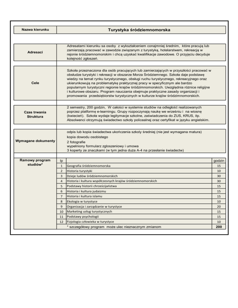 Nazwa kierunku Turystyka śródziemnomorska Adresaci Adresatami kierunku sa osoby z wykształceniem conajmniej średnim, które pracują lub zamierzają pracować w zawodzie związanym z turystyką, hotelarstwem, rekreacją w rejonie śródziemnomorskim i chcą uzyskać kwalifikacje zawodowe. O przyjęciu decyduje kolejność zgłoszeń. Cele Szkoła przeznaczona dla osób pracujących lub zamierzających w przyszłości pracować w obsłudze turystyki i rekreacji w obszarze Morza Śródziemnego. Szkoła daje podstawę wiedzy na temat rynku turystycznego, obsługi ruchu turystycznego, rekreacyjnego oraz ukierunkowują na problematykę praktycznej pracy w specyficznym ale bardzo popularnym turystyczni regionie krajów śródzimnomorskich. Uwzględnia różnice religijne i kulturowe obszaru. Program nauczania obejmuje praktyczne zasady organizacji i promowania przedsiębiorstw turystycznych w kulturze krajów śródzimnomorskich. Czas trwania Struktura 2 semestry, 200 godzin, W całości w systemie studiów na odległość realizowanych poprzez platformę e-learningu. Grupy rozpoczynają naukę we wrześniu i na wiosnę (kwiecień). Szkoła wydaje legitymacje szkolne, zaświadczenia do ZUS, KRUS, itp. Absolwenci otrzymują świadectwo szkoły policealnej oraz certyfikat w języku angielskim. odpis lub kopia świadectwa ukończenia szkoly średniej (nie jest wymagana matura) kopia dowodu osobistego Wymagane dokumenty Ramowy program studiów* 2 fotografie wypelniony formularz zgloszeniowy i umowa 3 koperty ze znaczkami (w tym jedna duża A-4 na przesłanie świadectw) lp godzin 1 Geografia śródziemnomorska 15 2 Historia turystyki 10 3 4 Dzieje ludów śródziemnomorskich Historia i kultura współczesnych krajów śródziemnomorskich 30 5 Podstawy historii chrześcijaństwa 15 6 15 7 Historia i kultura judaizmu Historia i kultura islamu 15 8 Ekologia w turystyce 10 30 9 Organizacja i zarządzanie w turystyce 10 Marketing usług turystycznych 11 Podstawy psychologii 15 12 Fizjologia człowieka w turystyce 10 * szczegółowy program może ulec nieznacznym zmianom 20 15 200
