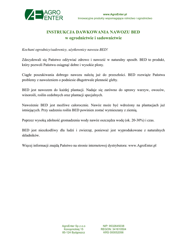www.AgroEnter.pl Innowacyjne produkty wspomagające rolnictwo i ogrodnictwo INSTRUKCJA DAWKOWANIA NAWOZU BED w ogrodnictwie i sadownictwie Kochani ogrodnicy/sadownicy, użytkownicy nawozu BED! Zdecydowali się Państwo odżywiać zdrowo i nawozić w naturalny sposób. BED to produkt, który pozwoli Państwu osiągnąć dobre i wysokie plony. Ciągłe poszukiwania dobrego nawozu należą już do przeszłości. BED rozwiąże Państwa problemy z nawożeniem o podniesie długotrwale plenność gleby. BED jest nawozem do każdej plantacji. Nadaje się zarówno do uprawy warzyw, owoców, winorośli, roślin ozdobnych oraz plantacji specjalnych. Nawożenie BED jest możliwe całorocznie. Nawóz może być wdrożony na plantacjach już istniejących. Przy sadzeniu roślin BED powinien zostać wymieszany z ziemią. Poprzez wysoką zdolność gromadzenia wody nawóz oszczędza wodę (ok. 2030%) i czas. BED jest nieszkodliwy dla ludzi i zwierząt, ponieważ jest wyprodukowane z naturalnych składników. Więcej informacji znajdą Państwo na stronie internetowej dystrybutora: www.AgroEnter.pl AgroEnter Sp z.o.o Konopnickiej 15 85124 Bydgoszcz NIP: 9532645038 REGON: 341610504 KRS 000052056 www.AgroEnter.pl Innowacyjne produkty wspomagające rolnictwo i ogrodnictwo ZALECANE DAWKOWANIE NAWOZU BED Rodzaj roślin: Warzywa Ilość BED na roślinę (litry) Ogórki gruntowe 3,0 Ogórki szklarniowe 3,5 Cukinie 3,5 Pomidory 2,0 Warzywa Ilość BED w litrach na metr kwadratowy (m2) Ziemniaki 5,0 Marchew 2,0 Kalafior 2,5 Brukselka 2,5 Brokuły 2,5 Sałata 1,5 Rzodkiew zwyczajna 1,0 Rzodkiew biała 1,0 Por 0,5 Cebula 1,0 Papryka 1,5 Dynia 3,0 Seler 2,5 Czerwona kapusta 3,0 Szparagi 2,0 AgroEnter Sp z.o.o Konopnickiej 15 85124 Bydgoszcz NIP: 9532645038 REGON: 341610504 KRS 000052056 www.AgroEnter.pl Innowacyjne produkty wspomagające rolnictwo i ogrodnictwo Owoce Ilość BED w litrach na metr kwadratowy (m2) Truskawki 2,0 Drzewa owocowe 5,0 Krzewy owocowe 3,5 Winorośle 3,0 Rośliny ozdobne Ilość BED w litrach na metr kwadratowy (m2) Róże 0,5 Astry jednoroczne 0,5 Byliny 0,5 Rośliny specjalne Ilość BED w litrach na metr kwadratowy (m2) Nowy siew 1,0 Sadzenie drzew 10,0 Inne Stosunek nawóz:ziemia Rośliny o dużych wymaganiach od 1:3 do 1:5 Rośliny o małych wymaganiach od 1:10 do 1:20 AgroEnter Sp z.o.o Konopnickiej 15 85124 Bydgoszcz NIP: 9532645038 REGON: 341610504 KRS 000052056 www.AgroEnter.pl Innowacyjne produkty wspomagające rolnictwo i ogrodnictwo Rośliny doniczkowe Wielkość donicy Ilość BED do 200 ml 1 łyżka do 500 ml 2 łyżki do 5 l 0,5 l do 10 l 1 l BED jest nowym, wyjątkowym nawozem dla wszystkich typów upraw! Długotrwałe działanie 24 lat. Nawóz zawiera azot, fosfor, węglan potasu, tlenek wapnia, tlenek magnezu, żelazo, siarkę oraz mikroelementy. Zawartość próchnicy 6080%. Duża absorpcja wody. Substancje odżywcze nie są zagrożone wymyciem. Rośliny tworzą 35 krotność ukorzenienia. Wykluczone zanieczyszczenie gleby fosforanami i azotanami. Przeciwdziała zakwaszaniu gleby i powstawania mchu. Podwyższa i stabilizuje wartość pH gleby do poziomu 7,07,8. Dba o szybkie ocieplenie gleby. Przeciwdziała zarazkom. AgroEnter Sp z.o.o Konopnickiej 15 85124 Bydgoszcz NIP: 9532645038 REGON: 341610504 KRS 000052056 www.AgroEnter.pl Innowacyjne produkty wspomagające rolnictwo i ogrodnictwo WAŻNE WSKAZÓWKI Nie stosować, jako ziemia pod hodowlę, gdyż BED jest zbyt bogaty w składniki odżywcze. Przed ponowną dawką wody po zasianiu lub sadzeniu sprawdzić wilgotność gleby, gdyż BED absorbuje wodę. SKŁAD: N (azot) P2 O4 (pięciotlenek fosforu) K2O (tlenek potasu) CaO (tlenek wapnia) MgO (tlenek magnezu) pH 7,07,8 60% składników jest dostępna w Iszym roku nawożenia. Produkt dopuszczony do obrotu na podstawie art. 5 ustawy z dnia 10 lipca 2007 r. o nawozach i nawożeniu (Dz.U. 2007 nr 147 poz. 1033) wraz z aktami wykonawczymi. AgroEnter Sp z.o.o Konopnickiej 15 85124 Bydgoszcz NIP: 9532645038 REGON: 341610504 KRS 000052056