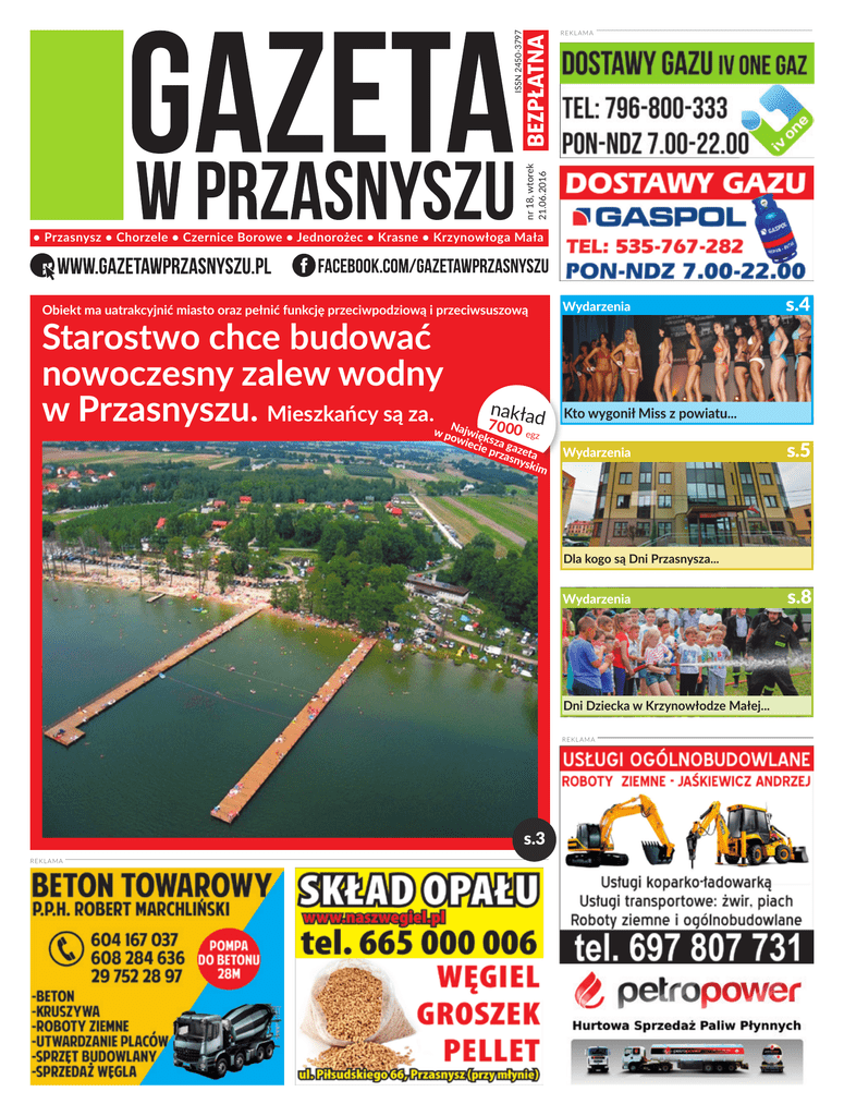 nr 18, wtorek 21.06.2016 ISSN 2450-3797 RE K L A M A • Przasnysz • Chorzele • Czernice Borowe • Jednorożec • Krasne • Krzynowłoga Mała Obiekt ma uatrakcyjnić miasto oraz pełnić funkcję przeciwpodziową i przeciwsuszową Starostwo chce budować nowoczesny zalew wodny w Przasnyszu. Mieszkańcy są za. nakład w pNajwię 7000 egz owi ksz ecie a ga prza zeta sny skim Wydarzenia s.4 Kto wygonił Miss z powiatu... Wydarzenia s.5 Dla kogo są Dni Przasnysza... Wydarzenia Dni Dziecka w Krzynowłodze Małej... RE K L A M A s.3 RE KL A M A s.8 2 WYDARZENIA Rusza budowa hali sportowej w Krasnem! Po wielu latach oczekiwania, w Krasnem powstanie hala sportowa. Gmina Krasne, to jedyna gmina na terenie powiatu, która nie posiadała tego rodzaju obiektu. Powiodły się wspólne zabiegi wójta Michała Szczepańskiego i starosty przasnyskiego Zenona Szczepankowskiego u marszałka województwa Adama Struzika, o których pisaliśmy. Gmina uzyskała dofinansowanie realizacji inwestycji. Rozstrzygnięto już przetarg na budowę. Koszt opiewa na kwotę ok. 3,7 mln. zł. Hala ma być oddana do użytku z początkiem roku 2018. H ala powstanie przy miejscowym gimnazjum i będzie miała powierzchnię ok 955 m2, 100 miejsc siedzących i zaplecze. Inwestycja zakłada również zaadaptowanie pomieszczeń piwnicy istniejącego budynku szkoły na węzeł sanitarny i szatnie, dla korzystających z hali. Powstaną również nowe schody i wejście do budynku. Inwestycja, z pewnością będzie cieszyć przede wszystkim uczniów szkół, którzy będą mieli znakomite warunki do GAZETA W PRZASNYSZU www.gazetawprzasnyszu.pl Edward Lemanowicz z Przaśnikiem 2016 K uprawiania sportu. Ale i pozostali mieszkańcy gminy zapewne skorzystają z hali, np. podczas organizowanych tam imprez sportowych, czy kulturalnych. GwP wtorek 21.06.2016 olejny raz Towarzystwo Przyjaciół Ziemi Przasnyskiej przyznało nagrodę Przaśnika. Statuetki legendarnego młynarza Przaśnika, założyciela Przasnysza, przyznawane są za zasługi dla ziemi przasnyskiej w różnych dziedzinach, takich jak: oświata, kultura, sport, działalność gospodarcza czy społeczna. Decyzją walnego zebrania Towarzystwa Przyjaciół Ziemi Przasnyskiej, „Przaśnika” otrzymał w roku 2016 Edward Lemanowicz. Działacz społeczny, były dyrektor Zespołu Szkół Ponadgimnazjalnych w Przasnyszu. Od 60 lat związany z Przasnyszem. Edward Lemanowicz gospodarzy, a to, że wybory te, nie dają władzy kandydatom z PiS w takiej skali, jakby chcieli, wiele mówi. PiS, ciągle powołując się na suwerena, który dał mu władzę (tak naprawdę na partię Jarosława Kaczyńskiego głosowało tylko 19 % uprawnionych), powinien uszanować wybory właśnie tego suwerena na poziomie lokalnym. I nie ingerować w decyzje i plany samorządowców, którzy na swoim terenie mają mandat do ich podejmowania, zagwarantowany przez mieszkańców. Tu, na samym dole, w powiatach, małych miasteczkach, gminach był dyrektorem ZSZ od 1969 do 1978 roku. W tym czasie placówce tej nadano imię mjr. Henryka Sucharskiego, a budynek szkolny został rozbudowany, zyskując skrzydło z dodatkowymi salami lekcyjnymi oraz pomieszczenie na bibliotekę i czytelnię. Zaczynał pracę jako nauczyciel matematyki i fizyki w szkole zawodowej. Jego zasługi zostały docenione przez ówczesną władzę i powierzono mu na 10 lat funkcję Przewodniczącego Miejskiej Rady Narodowej w Przasnyszu... Edward Lemanowicz był również Prezesem Zarządu Oddziału Powiatowego PTTK oraz prezesem Klubu Sportowego Grom, później KS ZWAR. GwP, foto:www.plock.gosc.pl, arch. Ewelina Kisiel Piotr Sekuna nadal dyrektorem Zespołu Szkół w Bogatem Piotra Sekuna - wieloletni dyrektor Zespołu Szkół w Bogatem, członek zarządu powiatu przasnyskiego, społecznik i człowiek cieszący się ogromnym autorytetem i zaufaniem mieszkańców, wygrał konkurs na kolejną kadencję dyrektora tej szkoły. J ak się dowiedzieliśmy, władze gminy Przasnysz, w związku ze wzorowym zarządzaniem placówką, wielkim doświadczeniem oraz znajomością specyfiki szkoły – chciały skorzystać z możliwości, jakie daje prawo i przedłużyć sprawowanie funkcji przez Piotr Sekunę, na kolejną kadencję, w drodze bez konkursowej. Taka przysługuje samorządom możliwość i w więk- szości jest ona praktykowana, jeżeli dotychczasowy dyrektor bardzo dobrze sprawuje swoje obowiązki. Kuratorium Oświaty nie zgodziło się na wniosek gminy Przasnysz o przedłużenie sprawowania funkcji dyrektora w drodze bez konkursowej Piotrowi Sekunie. Trzeba było więc ogłosić konkurs. Oprócz obecnego dyrektora, stanęła do niego jeszcze jedna osoba, nie RE KL A M A Redakcja: ul. Ostrołęcka 1, 06-300 Przasnysz tel. 883 458 207 związana ze szkołą, ani bliżej nawet z terenem gminy, ale kojarzona z partią rządzącą, czyli PiS. Ostatecznie, to jednak dotychczasowy dyrektor – wygrał konkurs i będzie pełnił funkcję przez następne 5 lat. Od redakcji: Jak wiadomo, PiS dokonuje „dobrych” zmian we wszystkich możliwych instytucjach i obsadza je swoimi ludźmi. Ich kompetencje do zajmowania niektórych stanowisk są szeroko oceniane i komentowane, często zaś krótko: mierny, bierny, ale wierny. Samorządy to praktycznie ostatni bastion stabilnej i ugruntowanej demokracji, która przez wielu ludzi uważana jest obecnie za rozchwianą i zagrożoną. Samorządy są tej demokracji przykładem, przynajmniej powinny być. O sprawowaniu władzy decydują w nich lokalnie mieszkańcy, którzy znają osoby, na które oddają swój głos. PiS w samorządach nie ma wielu swoich przedstawicieli oraz zbyt dużego wpływu, i to boli partię rządzącą. Mieszkańcy przecież wybierają dobrych i sprawnych Redaktor naczelny: Bartłomiej Siedlecki www.gazetawprzasnyszu.pl [email protected] i na wsiach, znani lokalnie politycy i samorządowcy oraz głosujący na nich ludzie najlepiej znają realia, potrzeby i uwarunkowania, a decyzje pod