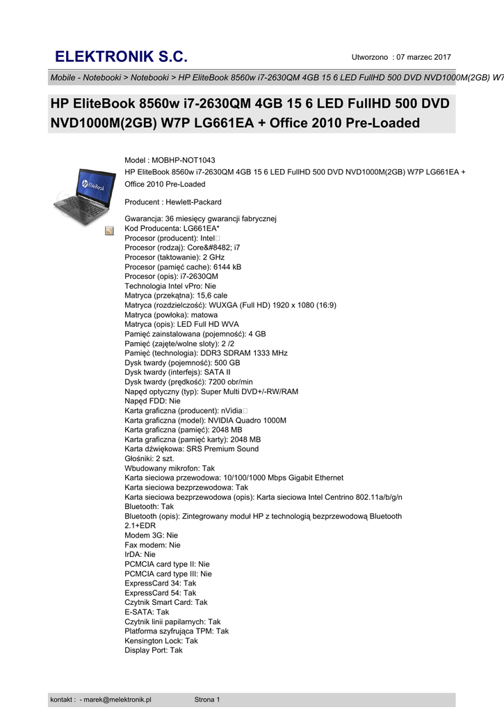 ELEKTRONIK S.C. Utworzono : 07 marzec 2017 Mobile - Notebooki > Notebooki > HP EliteBook 8560w i7-2630QM 4GB 15 6 LED FullHD 500 DVD NVD1000M(2GB) W7 HP EliteBook 8560w i7-2630QM 4GB 15 6 LED FullHD 500 DVD NVD1000M(2GB) W7P LG661EA + Office 2010 Pre-Loaded Model : MOBHP-NOT1043 HP EliteBook 8560w i7-2630QM 4GB 15 6 LED FullHD 500 DVD NVD1000M(2GB) W7P LG661EA + Office 2010 Pre-Loaded Producent : Hewlett-Packard Gwarancja: 36 miesięcy gwarancji fabrycznej Kod Producenta: LG661EA* Procesor (producent): Intel� Procesor (rodzaj): Core™ i7 Procesor (taktowanie): 2 GHz Procesor (pamięć cache): 6144 kB Procesor (opis): i7-2630QM Technologia Intel vPro: Nie Matryca (przekątna): 15,6 cale Matryca (rozdzielczość): WUXGA (Full HD) 1920 x 1080 (16:9) Matryca (powłoka): matowa Matryca (opis): LED Full HD WVA Pamięć zainstalowana (pojemność): 4 GB Pamięć (zajęte/wolne sloty): 2 /2 Pamięć (technologia): DDR3 SDRAM 1333 MHz Dysk twardy (pojemność): 500 GB Dysk twardy (interfejs): SATA II Dysk twardy (prędkość): 7200 obr/min Napęd optyczny (typ): Super Multi DVD+/-RW/RAM Napęd FDD: Nie Karta graficzna (producent): nVidia� Karta graficzna (model): NVIDIA Quadro 1000M Karta graficzna (pamięć): 2048 MB Karta graficzna (pamięć karty): 2048 MB Karta dźwiękowa: SRS Premium Sound Głośniki: 2 szt. Wbudowany mikrofon: Tak Karta sieciowa przewodowa: 10/100/1000 Mbps Gigabit Ethernet Karta sieciowa bezprzewodowa: Tak Karta sieciowa bezprzewodowa (opis): Karta sieciowa Intel Centrino 802.11a/b/g/n Bluetooth: Tak Bluetooth (opis): Zintegrowany moduł HP z technologią bezprzewodową Bluetooth 2.1+EDR Modem 3G: Nie Fax modem: Nie IrDA: Nie PCMCIA card type II: Nie PCMCIA card type III: Nie ExpressCard 34: Tak ExpressCard 54: Tak Czytnik Smart Card: Tak E-SATA: Tak Czytnik linii papilarnych: Tak Platforma szyfrująca TPM: Tak Kensington Lock: Tak Display Port: Tak kontakt : - [email protected] Strona 1 ELEKTRONIK S.C. Utworzono : 07 marzec 2017 Mobile - Notebooki > Notebooki > HP EliteBook 8560w i7-2630QM 4GB 15 6 LED FullHD 500 DVD NVD1000M(2GB) W7 HP EliteBook 8560w i7-2630QM 4GB 15 6 LED FullHD 500 DVD NVD1000M(2GB) W7P LG661EA + Office 2010 Pre-Loaded DVI-D: Nie HDMI: Nie VGA (RGB): Tak S-video/TV-out: Nie AV-in (Tuner TV): Nie Line-in: Nie Line-out: Tak Wejście mikrofonu: Tak S/PDIF: Nie LPT (równoległy): Nie RS232 (szeregowy): Nie Moduł GPS: Nie Czytnik kart pamięci: Tak Czytnik kart pamięci (opis): SD/MMC Panel klawiszy multimedialnych: Nie Złącze replikatora portów: Tak Fire-Wire (IEEE1394): Tak USB 2.0: 3 szt. USB 3.0: 2 szt. System operacyjny: Windows 7 Professional 64 bit System operacyjny (wer. Językowa): polski Dodatkowe oprogramowanie: Roxio My DVD 2010 SE, Office 2010 Pre-Loaded, Norton Internet Security 2011 (z 60-dniową subskrypcją). Wbudowana kamera: Tak Wbudowana kamera (rozdzielczość): 720 Wbudowana kamera (opis): Kamera internetowa HD Wbudowana kamera obrotowa: Nie Urządzenie wskazujące: Tabliczka dotykowa z przyciskiem wł./wył., przewijanie w dwóch kierunkach, sterowanie palcami, trzy przyciski wyboru Wskaźnik pointstick z trzema dodatkowymi przyciskami Akumulator (technologia): 8-ogniwowy akumulator litowy HP Long Life (75 Wh) Wymiary (wysokość): 34,5 mm Wymiary (szerokość): 382 mm Wymiary (głębokość): 258 mm Waga: 3 kg Gwarancja: 36 mies Gwarancja międzynarodowa: Tak Gwarancja baterii: 36 mies Wyposażenie: zasilacz sieciowy Opis: Obsługa technologii Intel AT, Śruba zabezpieczająca dolną pokrywę, Gniazdo zabezpieczeń, HP Disk Sanitizer, One-Step Logon, HP SpareKey, Enhanced Pre-Boot Security (Multiuser / Multifactor)]Spełnia wytrzymałościowe normy Armii Amerykańskiej (MIL-STD 810G)Przenośna i wydajna stacja robocza. Najbardziej wszechstronna przenośna stacja robocza HP stanowi połączenie dużej mocy obliczeniowej i profesjonalnej grafiki oferowane w artystycznej obudowie.Specjaliści, którzy potrzebują cienkiego i lekkiego komputera zapewniającego maksymalnie długi czas pracy, znakomitą wydajność oraz profesjonalną kartę graficzną z certyfikatami niezależnych producentów oprogramowania Adres www producenta: Link na stronę opisu technicznego Akumulator (czas pracy): 5 h Podświetlana klawiatura: Nie kontakt : - [email protected] Strona 2 ELEKTRONIK S.C. Utworzono : 07 marzec 2017 Mobile - Notebooki > Notebooki > HP EliteBook 8560w i7-2630QM 4GB 15 6 LED FullHD 500 DVD NVD1000M(2GB) W7 HP EliteBook 8560w i7-2630QM 4GB 15 6 LED FullHD 500 DVD NVD1000M(2GB) W7P LG661EA + Office 2010 Pre-Loaded Cena : 5.932,74 zł Brutto ( 4.862,90 zł Netto) Dostępność: Produkt dostępny w naszym sklepie od 17 lipiec 2012 kontakt : - [email protected] Strona 3