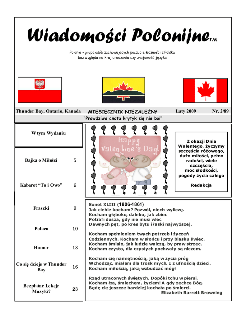 Wiadomosci Polonijne TM Polonia - grupa osób zachowujących poczucie łączności z Polską bez względu na kraj urodzenia czy znajomość języka Thunder Bay, Ontario, Kanada MIESIĘCZNIK NIEZALEŻNY Luty 2009 Nr. 2/89 “Prawdziwa cnota krytyk się nie boi” W tym Wydaniu Bajka o Miłości 5 Z okazji Dnia Walentego, życzymy szczęścia różowego, dużo miłości, pełno radości, wiele szczęścia, moc słodkości, pogody życia całego Kabaret “To i Owo” 6 Redakcja Fraszki 9 Polaco 10 Humor Co się dzieje w Thunder Bay Bezpłatne Lekcje Muzyki? Sonet XLIII (1806-1861) Jak ciebie kocham? Pozwól, niech wyliczę. Kocham głęboko, daleko, jak zbiec Potrafi dusza, gdy nie musi wlec Dawnych pęt, po kres bytu i łaski najwyższej. 13 Kocham spełnieniem twych potrzeb i życzeń Codziennych. Kocham w słońcu i przy blasku ś wiec. Kocham śmiało, jak ludzie walczą, by praw strzec. Kocham czysto, dla czystych pochwały są niczem. 16 Kocham cię namiętnością, jaką w życia próg Wchodząc, miałam dla trosk mych. I z ufnością dzieci. Kocham miłością, jaką wzbudzać mógł 23 Rząd utraconych świętych. Dopóki tchu w piersi, Kocham łzą, śmiechem, życiem! A gdy zechce Bóg, Będę cię jeszcze bardziej kochała po śmierci. Elizabeth Barrett Browning Wiadomości Polonijne 2 WIADOMOŚCI Z POLSKI-Tadeusz Michalak Redaguje Zespół: Robert Kania Lucy Michalak Tadeusz Michalak Agnieszka Reszkows ka-Kania Korespondenci: Joanna Adamik Jacek Balcewicz Agnieszka Buda-Rodriguez B. Ejbich Waldi Opracowanie: Lucy Michalak Wy dawca: Wiadomości Polonijne 236 Masters Street. Thunder Bay , Ont. P7B 6L5 e-mail: [email protected] Redakcj a zastrzega sobie prawo skracani a i edycji nadesł anych tekst ów. Wyrażone w tekstach opinie należą do autorów i nie zawsze odzwierciedlają stanowisko redakcji. Za treść ogłoszeń i reklam red ak cj a nie ponosi odpowiedzialności. Luty 2009 Fi l m " Katyń " Andrzeja Wajdy trafi w 2009 r. do kin we Włoszech, Grecji, Francji, Norwegii, Danii, Niemczech, Japonii, W. Brytanii, USA. Łącznie TVP sprzedała "Katyń" do ponad 60 krajów, co jest najlepszym wynikiem dystrybucyjnym polskiego filmu fabul arnego. W 2008 r. pokazywano "Katyń" m.in. w kinach w Szwecji, Brazylii, na Węgrzech i w Iranie. PiS przedst awił swoją propozycję pakietu antykryzysowego, bo "rząd nic w tej sprawie nie robi", jak powiedział Jarosław Kaczyński na konferencji prasowej. W pakiecie: inwestycje publiczne, ochrona rynku pracy, uł at wi eni a podat ko we i l eps ze wykorzystanie środków unijnych. I osłony dla słabszej częś ci społeczeństwa. Wiadomości Polonijne są pismem całkowici e bezpłatnym. Wszelkie PO koszty związane z druki em są odrzuciła propozycje antykryzysowe PiS, pokrywane z dotacji. Każda pomoc jako zwi ększaj ące deficyt finansów finansowa jest mile widziana. publicznych i rujnujące system emerytalny. Wszelkiego rodzaju ogloszeni a i Dell ży c z eni a d o “ W i adom o ś ci am erykański producent komput erów, P ol oni j ych” przyj m uj e Lucy przeniesi e do Łodzi linie produkcyjne z Michalak tel. 767-4200 zamykanej fabryki w Limerick w Irlandii. Oczekuje się, że istniejące już zakłady Della Wzory reklam zaprojektowanych w Łodzi zatrudnią dodatkowe 1000 osób. przez Wiadomości Polonijne” są w ł a s n oś c i ą w yd a w n i c t w a . Kopiowanie i ich publikowanie bez Gazu z Ukrainy brak wciąż. Jest komisja unijna do badania ile zgody redakcji jest nielegalne. gazu wchodzi na Ukrainę a ile wychodzi. Nawiasem, polskich kandydatów do tej Redakcja “ Wiadomości Polonijnych” zapras za wszystkich komisji odrzucono. Wraca temat kontraktu Czytelników do przysyłania własnej na gaz z Norwegii, co to rząd Buzka twórczoś ci. Mogą to być zarówno negocjował a rząd Millera zlikwidował. Stopień zasilania wciąż jeden. Czyli prawie wiersze jak i proza. normalnie - ale Orlen i Zakłady Azotowe dostają mniej. Dyżurny (od wypowiedzi w Termin nadsyłania materiałów do gazety upływa 15-go każdego mediach) psycholog, prof. Janusz Czapiński krytykuje Polaków nieprzygotowanych do miesiąca. klęsk energetycznych. Podobno mieszkańcy dużych miast nie mają zapasów. Zapytuje czego? Gazu w butli na balkonie bloku? Przysłowie miesiąca S ześciolatki do szkoły, jeżeli zechcą Kiedy luty pofolguje -marzec rodzice Najnowsza (zmieniona nawet w ostatniej zimę zreperuje. chwili) wersja ustawy oświatowej mówi, że dzieci urodzone od 1 stycznia do końca kwietnia 2003 objęte będą obowiązkiem szkolnym a do szkoły pójdą na wniosek rodziców. I tak przez 3 lata; od 2012 już wszystkie sześciolatki mają iść do szkoły. Wielka Orkiestra Ś wiątecznej Pomocy Jurka Owsiaka znowu grała i znowu zbiórka była naprawdę popularna i skuteczna, a wolontariusze liczni. Na razie podliczono 30 milionów złotych. Skutki kolejnych zbiórek naprawdę widać- choćby patrząc na napisy przy poniektórych, co cenni ejs zych aparaturach w szpitalach dzieci ęcych. Prezydenci Polski i Ukrainy spotkali się w Wiśle. Prezydent Juszczenko zapewniał gorąco, że Ukraina nie ukradła ani metra gazu, za dostawy z listopada i grudnia zapłaciła i jest gotowa przekazywać gaz tranzytem na Zachód. Prezydent Kaczynski wyraził poparcie. W Malborku odnaleziono zbiorową mogiłę, a w niej szczątki, co najmniej 1700 osób. Historykom nie udało się ustalić, kto został tam pochowany, wiadomo tylko, że grób pochodzi z pierwszych miesięcy 1945 roku. Prokuratura zakłada, że to niemieccy cywile, którzy nie ewakuowali się z miasta w 1944 i zginęli w wyniku działań wojennych. Po artykułach prasowych sprawą zainteresował się Rzecznik Praw Obywatelskich, a IPN zamierza szukać w archiwach informacji na ten temat. Wzmocnienie w Afganistanie W marcu na misje Polskiego Kontyngentu Wojskowego w Afganistanie ma dodatkowo wyjechać 70 lotników, aby przez pół roku przejąć kontrolę nad największym cywilnowojs
