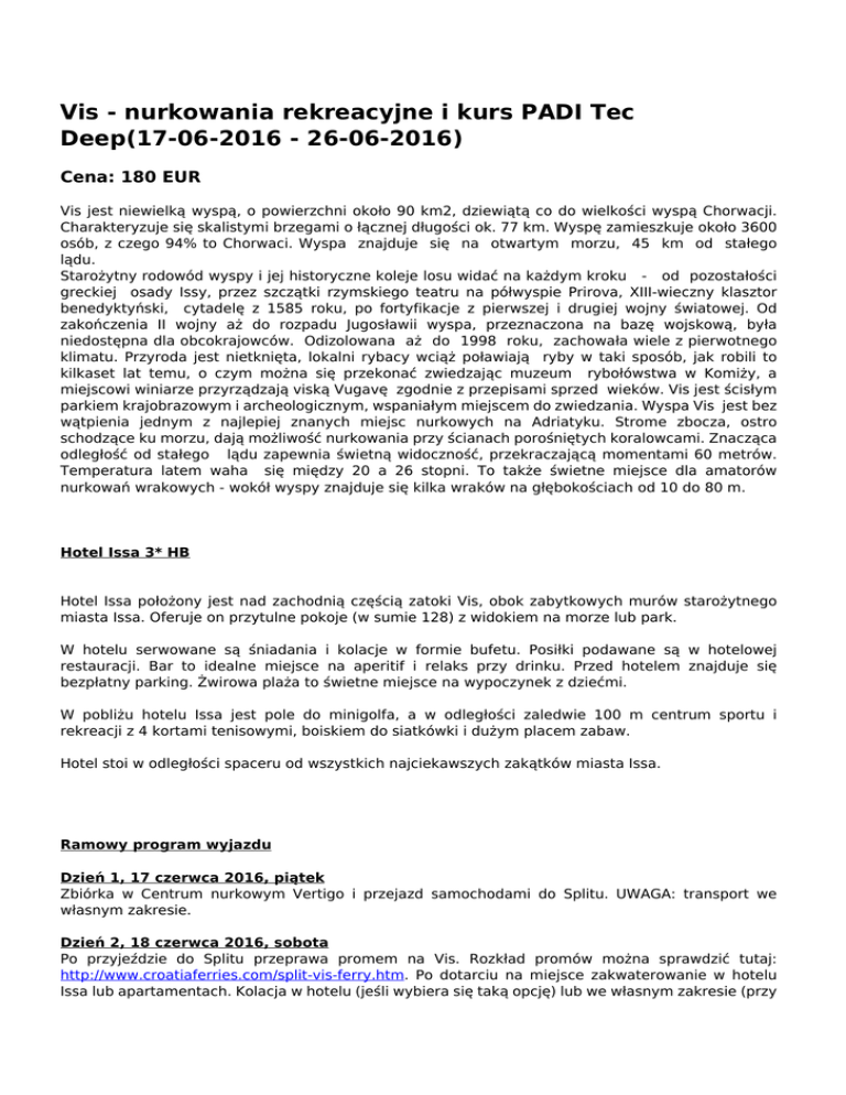 Vis - nurkowania rekreacyjne i kurs PADI Tec Deep(17-06-2016 - 26-06-2016) Cena: 180 EUR Vis jest niewielką wyspą, o powierzchni około 90 km2, dziewiątą co do wielkości wyspą Chorwacji. Charakteryzuje się skalistymi brzegami o łącznej długości ok. 77 km. Wyspę zamieszkuje około 3600 osób, z czego 94% to Chorwaci. Wyspa znajduje się na otwartym morzu, 45 km od stałego lądu. Starożytny rodowód wyspy i jej historyczne koleje losu widać na każdym kroku - od pozostałości greckiej osady Issy, przez szczątki rzymskiego teatru na półwyspie Prirova, XIII-wieczny klasztor benedyktyński, cytadelę z 1585 roku, po fortyfikacje z pierwszej i drugiej wojny światowej. Od zakończenia II wojny aż do rozpadu Jugosławii wyspa, przeznaczona na bazę wojskową, była niedostępna dla obcokrajowców. Odizolowana aż do 1998 roku, zachowała wiele z pierwotnego klimatu. Przyroda jest nietknięta, lokalni rybacy wciąż poławiają ryby w taki sposób, jak robili to kilkaset lat temu, o czym można się przekonać zwiedzając muzeum rybołówstwa w Komiży, a miejscowi winiarze przyrządzają viską Vugavę zgodnie z przepisami sprzed wieków. Vis jest ścisłym parkiem krajobrazowym i archeologicznym, wspaniałym miejscem do zwiedzania. Wyspa Vis jest bez wątpienia jednym z najlepiej znanych miejsc nurkowych na Adriatyku. Strome zbocza, ostro schodzące ku morzu, dają możliwość nurkowania przy ścianach porośniętych koralowcami. Znacząca odległość od stałego lądu zapewnia świetną widoczność, przekraczającą momentami 60 metrów. Temperatura latem waha się między 20 a 26 stopni. To także świetne miejsce dla amatorów nurkowań wrakowych - wokół wyspy znajduje się kilka wraków na głębokościach od 10 do 80 m. Hotel Issa 3* HB Hotel Issa położony jest nad zachodnią częścią zatoki Vis, obok zabytkowych murów starożytnego miasta Issa. Oferuje on przytulne pokoje (w sumie 128) z widokiem na morze lub park. W hotelu serwowane są śniadania i kolacje w formie bufetu. Posiłki podawane są w hotelowej restauracji. Bar to idealne miejsce na aperitif i relaks przy drinku. Przed hotelem znajduje się bezpłatny parking. Żwirowa plaża to świetne miejsce na wypoczynek z dziećmi. W pobliżu hotelu Issa jest pole do minigolfa, a w odległości zaledwie 100 m centrum sportu i rekreacji z 4 kortami tenisowymi, boiskiem do siatkówki i dużym placem zabaw. Hotel stoi w odległości spaceru od wszystkich najciekawszych zakątków miasta Issa. Ramowy program wyjazdu Dzień 1, 17 czerwca 2016, piątek Zbiórka w Centrum nurkowym Vertigo i przejazd samochodami do Splitu. UWAGA: transport we własnym zakresie. Dzień 2, 18 czerwca 2016, sobota Po przyjeździe do Splitu przeprawa promem na Vis. Rozkład promów można sprawdzić tutaj: http://www.croatiaferries.com/split-vis-ferry.htm. Po dotarciu na miejsce zakwaterowanie w hotelu Issa lub apartamentach. Kolacja w hotelu (jeśli wybiera się taką opcję) lub we własnym zakresie (przy zakwaterowaniu w apartamencie). Nocleg. Dzień 3 – 8, 19 – 24 czerwca 2016, niedziela - piątek 5 dni nurkowych (2 nurkowania dziennie) w dniach niedziela – czwartek dla osób nurkujących rekreacyjnie. 5/6 dni nurkowych (12 nurkowań, 2 lub 3 nurkowania dziennie) dla osób uczestniczących w kursie Tec Deep. W piątek możliwość dokupienia dodatkowych nurkowań lub dzień wolny na odpoczynek i zwiedzanie okolicy. Śniadania i kolacje w hotelu lub we własnym zakresie. Noclegi zgodnie z wybraną opcją. Informacja na temat organizacji nurkowań Nurkowania codziennie w następującym rozkładzie: poranne wypłynięcie na 2 nurkowania, popołudniowe na 1 - 2 nurkowania - w zależności od miejsca i pogody. Są też atrakcyjne miejsce dostępne z brzegu (odległość: 20 min od bazy - 5 efektownych jaskiń, odwiedzanych podczas jednego, godzinnego nurkowania). Przed bazą można zrobić check dive z brzegu (do głębokości 9 - 10 m). W tym samym miejscu najczęściej odbywają się także nurkowania nocne. Do dyspozycji gości 2 łodzie nurkowe dla 12 nurków (obydwie z trapem i drabinkami dla nurków) oraz pontonu (morski RIB) na bliższe wypłynięcia. Dzień 9, 25 czerwca 2016, sobota Śniadanie w hotelu lub we własnym zakresie. Po śniadaniu wymeldowanie i przejazd na prom do Splitu. Rozkład promów można sprawdzić tutaj: http://www.croatiaferries.com/vis-split-ferry.htm. Następnie powrót do Warszawy i koniec imprezy. Cena zakwaterowania: zakwaterowanie w apartamencie 2 + 2 (A) – 195,00 EUR/osoba/7 dni zakwaterowanie w apartamencie 2 + 2 (B) – 180,00 EUR/osoba/7 dni zakwaterowanie w pokoju dwuosobowym park view bez klimatyzacji w hotelu Issa ze śniadaniem i obiadokolacją – 365,00 EUR/osoba/7 dni dopłata do pokoju jednoosobowego – 165,00 EUR/7 dni dopłata do widoku na morze i klimatyzacji – 56,00 EUR. Apartamenty typu A i B różnią się standardem wyposażenia i metrażem. W cenie zakwaterowania (zarówno w apartamentach, jak i hotelu) zawarte jest ubezpieczenie Kl i NNW oraz obsługa instruktora Scuba Service. Ceny nurkowań: nurkowania turystyczne (nurkowanie trwające do 70 minut) - 220,00 EUR/pakiet 10 nurkowań turystycznych (w cenie: butla 12 l lub 15 l + powietrze, balast, transport na miejsce nurkowe, polski przewodnik) nurkowania techniczne (nurkowanie trwające do 110 minut) - 290,00 EUR/pakiet 12 nurkowań( w cenie stage i asysta powierzchniowa) - to pakiet dla osób uczestniczących w kursie Tec Deep czasy nurkowań w przedziale 70 - 110 minut (powyżej 110 minut liczone jako 2) - nurkowanie pojedyncze + 10,00 EUR - dla osób, które planują wykonać niewielka liczbę nieco głębszych nurkowań w ramach pakietów turystycznych dopłata do pakietu + 30,00 EUR - zawiera dodatkową butlę stage oraz pomoc na łodzi, wszystkie nurkowania w przedziale do 110 minut. pojedyncze nurkowania techniczne (nie pakiet) - 40,00 EUR/1 nurkowanie - zawiera pomoc na łodzi. Limit czasu nurkowania do 150 
