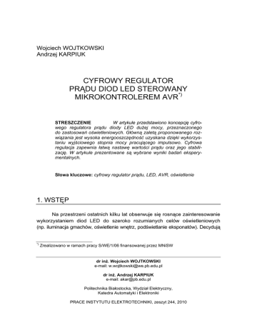 Wojciech WOJTKOWSKI Andrzej KARPIUK CYFROWY REGULATOR PRĄDU DIOD LED STEROWANY MIKROKONTROLEREM AVR*) STRESZCZENIE W artykule przedstawiono koncepcję cyfrowego regulatora prądu diody LED dużej mocy, przeznaczonego do zastosowań oświetleniowych. Główną zaletą proponowanego rozwiązania jest wysoka energooszczędność uzyskana dzięki wykorzystaniu wyjściowego stopnia mocy pracującego impulsowo. Cyfrowa regulacja zapewnia łatwą nastawę wartości prądu oraz jego stabilizację. W artykule prezentowane są wybrane wyniki badań eksperymentalnych. Słowa kluczowe: cyfrowy regulator prądu, LED, AVR, oświetlenie 1. WSTĘP Na przestrzeni ostatnich kilku lat obserwuje się rosnące zainteresowanie wykorzystaniem diod LED do szeroko rozumianych celów oświetleniowych (np. iluminacja gmachów, oświetlenie wnętrz, podświetlanie eksponatów). Decydują *) Zrealizowano w ramach pracy S/WE/1/06 finansowanej przez MNiSW dr inż. Wojciech WOJTKOWSKI e-mail: [email protected] dr inż. Andrzej KARPIUK e-mail: [email protected] Politechnika Białostocka, Wydział Elektryczny, Katedra Automatyki i Elektroniki PRACE INSTYTUTU ELEKTROTECHNIKI, zeszyt 244, 2010 198 W. Wojtkowski, A. Karpiuk o tym nie tylko względy wizualne (artystyczne), ale również, a może przede wszystkim, ekonomiczne. Niezwykle istotną częścią całego systemu oświetleniowego są układy zasilania i sterowania. Na rynku dostępna jest duża ilość specjalizowanych układów scalonych – sterowników diod LED, w większości są to jednak układy stosunkowo małej mocy. W artykule przedstawiono koncepcję cyfrowego regulatora prądu diody LED, przeznaczonego do zastosowań oświetleniowych. Główną zaletą proponowanego rozwiązania jest wysoka energooszczędność uzyskana dzięki wykorzystaniu wyjściowego stopnia mocy pracującego impulsowo. 2. UKŁAD ZASILANIA DIOD LED Z CYFROWYM REGULATOREM PRĄDU Proponowany układ (rys. 1) jest rozwinięciem koncepcji przedstawionej w [1], bazującej na znanej konfiguracji zasilacza impulsowego podwyższającego napięcie. Rys. 1. Uproszczony schemat zasilania diody LED z regulatorem cyfrowym Tranzystor MOSFET z kanałem typu n pełni rolę klucza elektronicznego. W pracy układu można wyróżnić dwie fazy. W pierwszej fazie cyklu klucz jest zamknięty (tranzystor przewodzi) i przez cewkę L1 płynie prąd, zaś w cewce gromadzi się energia. W drugiej fazie, otwarcie klucza wymusza przejęcie prądu przez diodę D i pojawienie się w cewce L1 siły elektromotorycznej samoindukcji. Cyfrowy regulator prądu diod LED sterowany mikrokontrolerem AVR 199 Zaindukowana siła elektromotoryczna, sumuje się z napięciem zasilania UZAS, w związku z czym napięcie na obciążeniu może być wyższe od napięcia zasilającego. W tej fazie cyklu energia jest przekazywana do obciążenia i do kondensatora C. Rezystor pomiarowy Rp pełni rolę czujnika prądu pracującego w pętli sprzężenia zwrotnego. Spadek napięcia na tym rezystorze podawany jest na regulator cyfrowy, który w taki sposób zmienia wartość współczynnika wypełnienia impulsów generatora PWM, sterującego kluczem tranzystorowym, aby prąd obciążenia był stały. Warto podkreślić, iż dzięki małej wartości rezystancji Rp, nawet przy dużych wartościach prądu obciążenia, straty mocy w rezystorze pomiarowym są niewielkie. Podstawowa zmiana układowa w porównaniu z [1] polega na włączeniu dodatkowej indukcyjności L2, szeregowo z zasilaną diodą LED i rezystorem pomiarowym Rp. Dzięki temu, zmniejszone zostały tętnienia prądu diody LED. Rys. 2. Uproszczony schemat blokowy regulatora cyfrowego Najważniejszym modułem zasilacza jest regulator cyfrowy. Uproszczony schemat blokowy oraz sposób podłączenia regulatora, przedstawiony został na rysunku 2. Praktycznie cały regulator zaimplementowano w strukturze mikrokontrolera ATmega8 z rodziny AVR [2]. Napięcie z rezystora pomiarowego Rp, podawane jest na przetwornik analogowo-cyfrowy ADC. Komparator cyfrowy porównuje wartość binarną z przetwornika (odpowiadającą napięciu na rezystorze pomiarowym) ze słowem ośmiobitowym REF, reprezentującym zadaną wartość prądu. Przykładowo, jeżeli prąd obciążenia maleje to komparator wytwarza sygnał, powodujący zmianę szerokości impulsów sterujących tranzystorem przekształtnika, przy zachowaniu stałej częstotliwości przełączania. Stała częstotliwość generatora PWM jest uzyskana za pomocą odpowiednio zaprogramowanego układu licznikowego mikrokontrolera (generacja sprzętowa). 200 W. Wojtkowski, A. Karpiuk 3. WYNIKI BADAŃ EKSPERYMENTALNYCH Prototyp zasilacza diody LED z regulatorem cyfrowym został poddany próbom laboratoryjnym. W czasie testów częstotliwość generatora PWM była ustawiona programowo na 16 kHz, wartości indukcyjności i pojemności wynosiły odpowiednio L1 = 200 μH, L2 = 200 μH, C = 220 μF, zaś wartość rezystancji pomiarowej RP była równa 0,91 Ω. Do testów wybrano białą diodę LED, o prądzie dopuszczalnym 350 mA. a) b) c) d) Rys. 3. Przebiegi napięcia sterującego (CH1), prądu diody LED (CH2), przy różnych napięciach wejściowych (CH3): a) 2 V, b) 2,8 V, c) 4 V, d) 4,3 V Na rysunkach 3a − 3d, przedstawione zostały oscylogramy ilustrujące pracę układu przy stałym prądzie diody LED równym 300 mA. Istotne jest, że przy zmianie napięcia wejściowego w zakresie od 2 V do 4,3 V, prąd diody nie zmienia wartości. Jest to efekt prawidłowej pracy regulatora cyfrowego, który odpowiednio zmienia współczynnik wypełnienia przebiegu sterującego tranzystorem kluczującym (rys. 3a – 3d). Analogiczne przebiegi dla prądu diody równego 150 mA, zostały przedstawione na rysunku 4. 201 Cyfrowy regulator prądu diod LED sterowany mikrokontrolerem AVR a) b) Rys. 4. Przebiegi napięcia sterującego (CH1), prądu diody LED (CH2), przy różnych napięciach wejściowych (CH3): a) 1,4 V, b) 3,7 V Przeprowadzono badania zakresów zmian nap