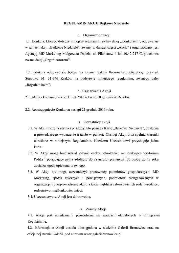 REGULAMIN AKCJI Bajkowe Niedziele 1. Organizator akcji 1.1. Konkurs, którego dotyczy niniejszy regulamin, zwany dalej „Konkursem”, odbywa się w ramach akcji „Bajkowe Niedziele”, zwanej w dalszej części „Akcją” i organizowany jest Agencję MD Marketing Małgorzata Dądela, ul. Filomatów 4 lok.10,42-217 Częstochowa zwane dalej „Organizatorem”. 1.2. Konkurs odbywać się będzie na terenie Galerii Bronowice, położonego przy ul. Stawowa 61, 31-346 Kraków na podstawie niniejszego regulaminu, zwanego dalej „Regulaminem”. 2. Czas trwania Akcji 2.1. Akcja i konkurs trwa od 31. 01.2016 roku do 18 grudnia 2016 roku. 2.2. Rozstrzygnięcie Konkursu nastąpi 21 grudnia 2016 roku. 3. Uczestnicy akcji 3.1. W Akcji może uczestniczyć każdy, kto posiada Kartę „Bajkowe Niedziele”, dostępną u prowadzącego wydarzenie a także w punkcie Obsługi Akcji oraz spełnia warunki określone w niniejszym Regulaminie. Każdemu Uczestnikowi przysługuje jedna karta. 3.2. W Akcji mogą brać udział jedynie osoby pełnoletnie, zamieszkujące terytorium Polski i posiadające pełną zdolność do czynności prawnych lub osoby do 18 roku życia za zgodą opiekuna prawnego. 3.3. W Akcji nie mogą uczestniczyć pracownicy podmiotów gospodarczych: MD Marketing, spółek zależnych i powiązanych, podmiotów zaangażowanych w organizację i przeprowadzenie akcji, a także najbliżsi członkowie ich rodzin–rodzice, rodzeństwo, małżonkowie, dzieci. 3.4. Uczestnictwo w Akcji jest dobrowolne. 4. Zasady Akcji 4.1. Akcja jest urządzana i prowadzona na zasadach określonych w niniejszym Regulaminie. 4.2. Informacja o Akcji została udostępniona w siedzibie Galerii Bronowice oraz na oficjalnej stronie Galerii pod adresem www.galeriabronowice.pl 4.3. Aby wziąć udział w Akcji uczestnik zobowiązany jest: Odebrać Kartę „Bajkowe Niedziele”. Pobrać od prowadzącego wydarzenie pieczątkę z logo „Bajkowe Niedziele”, które będą rozdawane podczas każdego z planowanych eventów, do grudnia 2016 roku. Podczas jednego eventu wydawana jest tylko jedna pieczątka. Żadna z pieczątek się nie powiela. Zebrać minimum 4 pieczątki na Karcie „Bajkowe Niedziele”. Pieczątki przyznawane są przez prowadzącego, w trakcie danej imprezy w godz. 14.00-19.00. Przystąpić do konkursu i odpowiedzieć na pytanie: Jakiego bohatera z bajki najbardziej lubisz i dlaczego? oraz wrzucić do urny znajdującej się przy Punkcie Obsługi Eventu z propozycją odpowiedzi na kuponie konkursowym wraz z Kartą „Bajkowe Niedziele”, zgodnie z zasadami określonymi w punkcie 4.6 niniejszego Regulaminu. Do akcji można przystąpić w dowolnym momencie jej trwania, jednak warunkiem jest zebranie odpowiedniej ilości zebranych pieczątek opisanych w pk.4.3. 4.4. Punkt Obsługi Akcji znajduje się przy miejscu Akcji. Hostessa działająca podczas Akcji wręcza Karty „Bajkowe Niedziele” udziela informacji o zasadach Akcji oraz Konkursu. 4.5. Propozycje odpowiedzi na pytanie konkursowe należy wpisywać na specjalnie przygotowanym polu na Kartach „Bajkowe Niedziele” muszą zawierać dane kontaktowe uczestnika oraz zezwolenie na przetworzenie danych kontaktowych. Wszystkie Karty Muszą być spięte razem, tak aby nie można było ich rozdzielić lub włożone do zamkniętej koperty na której znajdują się dane uczestnika. Jednocześnie udział w Konkursie jest jednoznaczny z wyrażeniem zgodna publikację danych osobowych na potrzeby Konkursu na oficjalnej stronie internetowej Galerii Bronowice pod adresem ww.galeriabronowice.pl oraz na przetwarzanie przez Organizatora podanych danych osobowych, wyłącznie na potrzeby przeprowadzenia Konkursu, w szczególności wydania nagród. 4.6. 10 osób biorących udział w Akcji oraz Konkursie, które zbiorą największą liczbę pieczątek oraz wymyślą najciekawszą odpowiedź na pytanie konkursowe, są upoważnione do odbioru nagród. Pierwszym kryterium jest liczba zebranych pieczątek, w drugiej kolejności będą oceniane odpowiedzi na pytania. 4.7.Zwycięzcy Konkursu zostaną poinformowani telefonicznie wg danych podanych na karcie. Lista zwycięzców zostanie ogłoszona na stronie www.galeriabronowice.pl w dniu rozstrzygnięcia – 21 grudnia 2016 roku. 4.8. Akcja zakłada 1 nagrodę główną oraz 9 nagród dodatkowych. 4.9. Po ogłoszeniu wyników do dnia 21 grudnia 2016 roku, nagrody główne pozostaną do odbioru w Galerii Bronowice po wcześniejszym ustaleniu terminu z Organizatorem pod numerem telefonu 666088044 do dnia 08.01.2017 roku. Odbiór nagrody może nastąpić w godzinach 9.00-15.00. W przypadku nieodebrania nagrody przez prawidłowo poinformowanego zwycięzcę w ww. terminie, Organizator przyzna nagrodę innej osobie, wybranej zgodnie z kryteriami wskazanymi w punkcie 4.7. powyżej, z pominięciem wcześniej wybranego zwycięzcy. 4.10.Wymyślone przez uczestników Akcji odpowiedzi podlegają ocenie Komisji w składzie: Przedstawiciele Organizatora: Małgorzata Dądela, Beata Stępniewska, Przedstawiciel Galerii Bronowice: Agnieszka Parchimowicz Manager ds. Marketingu. 4.11.Do zadań Komisji należeć będzie stałe czuwanie nad prawidłowością przebiegu Akcji i Konkursu oraz podejmowanie decyzji w kwestiach, w których pojawią się wątpliwości związane z Akcją i Konkursem, w tym dotyczących interpretacji postanowień niniejszego Regulaminu. Decyzje Komisji są ostateczne i nie przysługuje od nich odwołanie. 4.12.Udział w Konkursie oznacza wyrażenie zgody na używanie wymyślonych przez Uczestnika odpowiedzi na pytania w dowolnej formie i zakresie we wszelkich działaniach prowadzonych przez Organizatora związanych z kampaniami promocyjnymi Galerii Bronowice, a szczególności umieszczenie zdjęć na ścianach lub/i w witrynach galerii handlowej, na stronie www.galeriabronowice.pl, billboardach, reklamach prasowych itd. oraz autorskich praw majątkowych do przedmiotowych haseł na wszystkich polach eksploatacji, a w szc
