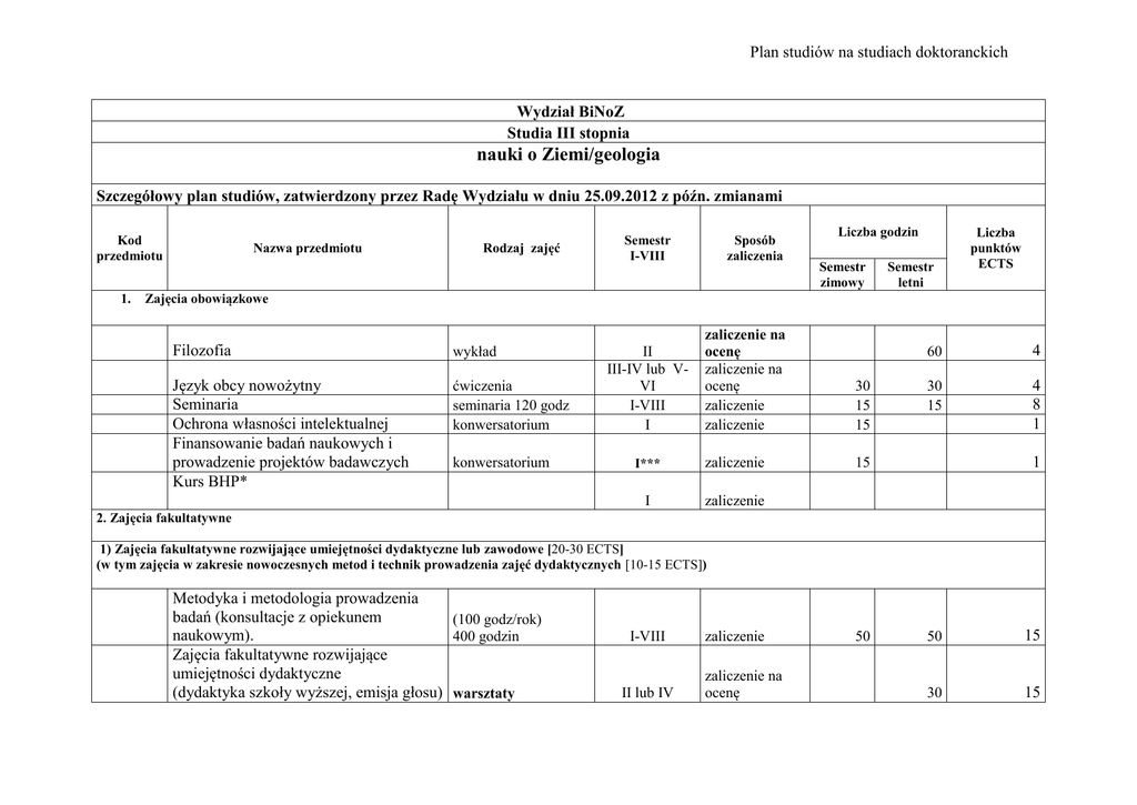 Plan studiów na studiach doktoranckich Wydział BiNoZ Studia III stopnia nauki o Ziemi/geologia Szczegółowy plan studiów, zatwierdzony przez Radę Wydziału w dniu 25.09.2012 z późn. zmianami Kod przedmiotu 1. Nazwa przedmiotu Rodzaj zajęć Sposób zaliczenia Semestr I-VIII Liczba godzin Semestr zimowy Semestr letni Liczba punktów ECTS Zajęcia obowiązkowe Filozofia wykład Język obcy nowożytny Seminaria Ochrona własności intelektualnej Finansowanie badań naukowych i prowadzenie projektów badawczych Kurs BHP* ćwiczenia seminaria 120 godz konwersatorium konwersatorium zaliczenie na ocenę zaliczenie na ocenę zaliczenie zaliczenie 30 15 15 I*** zaliczenie 15 I zaliczenie II III-IV lub VVI I-VIII I 60 4 30 15 4 8 1 1 2. Zajęcia fakultatywne 1) Zajęcia fakultatywne rozwijające umiejętności dydaktyczne lub zawodowe [20-30 ECTS] (w tym zajęcia w zakresie nowoczesnych metod i technik prowadzenia zajęć dydaktycznych [10-15 ECTS]) Metodyka i metodologia prowadzenia badań (konsultacje z opiekunem (100 godz/rok) naukowym). 400 godzin Zajęcia fakultatywne rozwijające umiejętności dydaktyczne (dydaktyka szkoły wyższej, emisja głosu) warsztaty I-VIII II lub IV zaliczenie zaliczenie na ocenę 50 50 15 30 15 2) Pozostałe zajęcia fakultatywne** Kursy do wyboru: 1. Petrologia w badaniach stref orogenicznych 2. Facies Analysis from Cores and Well Logs 3. Regional petroleum geology 4. Introduction to petroleum geology Przedmiot specjalistyczny po uzgodnieniu z opiekunem Nieobowiązkowy kurs fakultatywny wykład/seminarium I-IV zaliczenie wykład II-IV wykład wykład/seminarium wykład 5 2 zaliczenie 15 2 III-IV I-IV zaliczenie zaliczenie 15 15 2 2 V-VI zaliczenie 30 4 VII egzamin na ocenę lub zaliczenie na prawach egzamin 15 30 3. Praktyki zawodowe Zajęcia dydaktyczne 10-90 godz. ze stypendium 10-30 godz. bez stypendium I-VIII Łączna liczba punktów ECTS (45-60) Otwarcie przewodu doktorskiego do końca VI semestru Sprawozdanie z działalności naukowej do 30 czerwca każdego roku (Karta oceny doktoranta) Zasady zaliczenia roku: np. do zaliczenia roku wymagane jest zdanie przewidzianych w planie studiów egzaminów, uzyskanie obowiązujących zaliczeń, pozytywna opinia opiekuna naukowego/promotora o postępach naukowych, postępach w pracy nad rozprawą doktorską oraz działalności dydaktycznej doktoranta, złożenie sprawozdania z wykonania obowiązków doktoranta i przyjęcie sprawozdania przez kierownika studiów doktoranckich. * Zgodnie z Zarządzeniem Rektora Uniwersytetu Jagiellońskiego w sprawie: szkolenia w zakresie bezpieczeństwa i higieny pracy studentów I roku studiów pierwszego stopnia, drugiego stopnia i jednolitych studiów magisterskich oraz uczestników studiów doktoranckich w Uniwersytecie Jagiellońskim – wprowadzony został obowiązek szkolenia w zakresie bezpieczeństwa i higieny pracy uczestników studiów doktoranckich rozpoczynający naukę na I roku studiów na UJ, z wyjątkiem tych doktorantów, którzy w ramach dotychczasowego kształcenia odbyli już takie szkolenie na UJ. ** Do wyboru cztery kursy z listy *** Dotyczy doktorantów rozpoczynających studia od roku akademickiego 2013/2014. Doktoranci, którzy rozpoczęli studia w roku 2012/2013 kurs odbywają w III semestrze 60