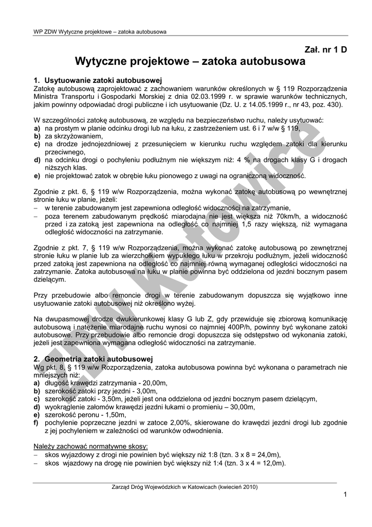 WP ZDW Wytyczne projektowe – zatoka autobusowa Zał. nr 1 D Wytyczne projektowe – zatoka autobusowa 1. Usytuowanie zatoki autobusowej Zatokę autobusową zaprojektować z zachowaniem warunków określonych w § 119 Rozporządzenia Ministra Transportu i Gospodarki Morskiej z dnia 02.03.1999 r. w sprawie warunków technicznych, jakim powinny odpowiadać drogi publiczne i ich usytuowanie (Dz. U. z 14.05.1999 r., nr 43, poz. 430). W szczególności zatokę autobusową, ze względu na bezpieczeństwo ruchu, naleŜy usytuować: a) na prostym w planie odcinku drogi lub na łuku, z zastrzeŜeniem ust. 6 i 7 w/w § 119, b) za skrzyŜowaniem, c) na drodze jednojezdniowej z przesunięciem w kierunku ruchu względem zatoki dla kierunku przeciwnego, d) na odcinku drogi o pochyleniu podłuŜnym nie większym niŜ: 4 % na drogach klasy G i drogach niŜszych klas. e) nie projektować zatok w obrębie łuku pionowego z uwagi na ograniczoną widoczność. Zgodnie z pkt. 6, § 119 w/w Rozporządzenia, moŜna wykonać zatokę autobusową po wewnętrznej stronie łuku w planie, jeŜeli: − w terenie zabudowanym jest zapewniona odległość widoczności na zatrzymanie, − poza terenem zabudowanym prędkość miarodajna nie jest większa niŜ 70km/h, a widoczność przed i za zatoką jest zapewniona na odległość co najmniej 1,5 razy większą, niŜ wymagana odległość widoczności na zatrzymanie. Zgodnie z pkt. 7, § 119 w/w Rozporządzenia, moŜna wykonać zatokę autobusową po zewnętrznej stronie łuku w planie lub za wierzchołkiem wypukłego łuku w przekroju podłuŜnym, jeŜeli widoczność przed zatoką jest zapewniona na odległość co najmniej równą wymaganej odległości widoczności na zatrzymanie. Zatoka autobusowa na łuku w planie powinna być oddzielona od jezdni bocznym pasem dzielącym. Przy przebudowie albo remoncie drogi w terenie zabudowanym dopuszcza się wyjątkowo inne usytuowanie zatoki autobusowej niŜ określono wyŜej. Na dwupasmowej drodze dwukierunkowej klasy G lub Z, gdy przewiduje się zbiorową komunikację autobusową i natęŜenie miarodajne ruchu wynosi co najmniej 400P/h, powinny być wykonane zatoki autobusowe. Przy przebudowie albo remoncie drogi dopuszcza się odstępstwo od wykonania zatoki, jeŜeli jest zapewniona wymagana odległość widoczności na zatrzymanie. 2. Geometria zatoki autobusowej Wg pkt. 8, § 119 w/w Rozporządzenia, zatoka autobusowa powinna być wykonana o parametrach nie mniejszych niŜ: a) długość krawędzi zatrzymania - 20,00m, b) szerokość zatoki przy jezdni - 3,00m, c) szerokość zatoki - 3,50m, jeŜeli jest ona oddzielona od jezdni bocznym pasem dzielącym, d) wyokrąglenie załomów krawędzi jezdni łukami o promieniu – 30,00m, e) szerokość peronu - 1,50m, f) pochylenie poprzeczne jezdni w zatoce 2,00%, skierowane do krawędzi jezdni drogi lub zgodnie z jej pochyleniem w zaleŜności od warunków odwodnienia. NaleŜy zachować normatywne skosy: − skos wyjazdowy z drogi nie powinien być większy niŜ 1:8 (tzn. 3 x 8 = 24,0m), − skos wjazdowy na drogę nie powinien być większy niŜ 1:4 (tzn. 3 x 4 = 12,0m). Zarząd Dróg Wojewódzkich w Katowicach (kwiecień 2010) 1 WP ZDW Wytyczne projektowe – zatoka autobusowa Łączna długość zatoki autobusowej wraz z jej krawędzią zatrzymania i dwoma skosami powinna wynosić: 24,0 + 20,0 + 12,0 = 56,00m (przy załoŜeniu trzy metrowej szerokości zatoki). Wg pkt. 9, § 119 Rozporządzenia, dopuszcza się na ulicach klasy G inne parametry zatoki autobusowej dostosowane do wymiarów pojazdów, dla których jest ona przeznaczona. Urządzenie dla ochrony pieszych przed warunkami atmosferycznymi (wiata), powinno być oddzielne dla kaŜdego kierunku ruchu i odsunięte od wewnętrznej krawędzi zatoki co najmniej o 1,5m, a jeŜeli zatoka nie jest wykonywana nie mniej niŜ 2,5m od krawędzi jezdni drogi. Urządzenie to nie moŜe ograniczać widoczności na drodze i w obrębie skrzyŜowania. Zgodnie z Rozporządzeniem Ministra Infrastruktury z dnia 23.09.2003 r. w sprawie szczegółowych warunków zarządzania ruchem na drogach oraz wykonywania nadzoru nad tym zarządzeniem (Dz. U z 2003 r. nr 177 poz. 1729., § 3.1., pkt. 6), geometria projektowanych zatok autobusowych przy drodze wojewódzkiej i zakres ich dostępu do tej drogi, powinny zostać takŜe zaopiniowane przez organ zarządzający ruchem, w tym przypadku przez Marszałka Województwa Śląskiego. 3. Konstrukcja nawierzchni zatoki autobusowej a) Obowiązujące obciąŜenia dla kategorii ruchu KR6. b) Warstwa ścieralna: • lub kostka kamienna wielkowymiarowa (np. granitowa regularna 18/18 cm, 16/20 cm) z wypełnieniem spoin zaprawą cementowo – piaskową, osadzona w mieszance betonowej na mokro, • lub beton cementowy o klasie wytrzymałościowej C35/45 (B40). c) Podbudowa zasadnicza z betonu cementowego C25/30 (B30). d) Pozostałe warstwy do zaprojektowania (biorąc pod uwagę rozpoznane warunki gruntowo – wodne podłoŜa, zachowując warunek mrozoodporności). e) KrawęŜnik kamienny wtopiony 20 x 30cm na ławie betonowej, ułoŜony wzdłuŜnie po krawędzi jezdni oddzielający jezdnię drogi wojewódzkiej od powierzchni projektowanej zatoki autobusowej, z zachowaniem kontynuacji ścieku przykrawęŜnikowego, mogącego w skrajnych przypadkach (występowania minimalnych pochyleń) tworzyć tzw. „ściek łamany” odprowadzający wody deszczowe do zaprojektowanych wpustów ulicznych. f) KrawęŜnik stanowiący obrys projektowanej zatoki wystający 20 x 30cm, betonowy, wibroprasowany, ewentualnie kamienny – na ławie betonowej z oporem (beton C12/15). KONIEC Zarząd Dróg Wojewódzkich w Katowicach (kwiecień 2010) 2