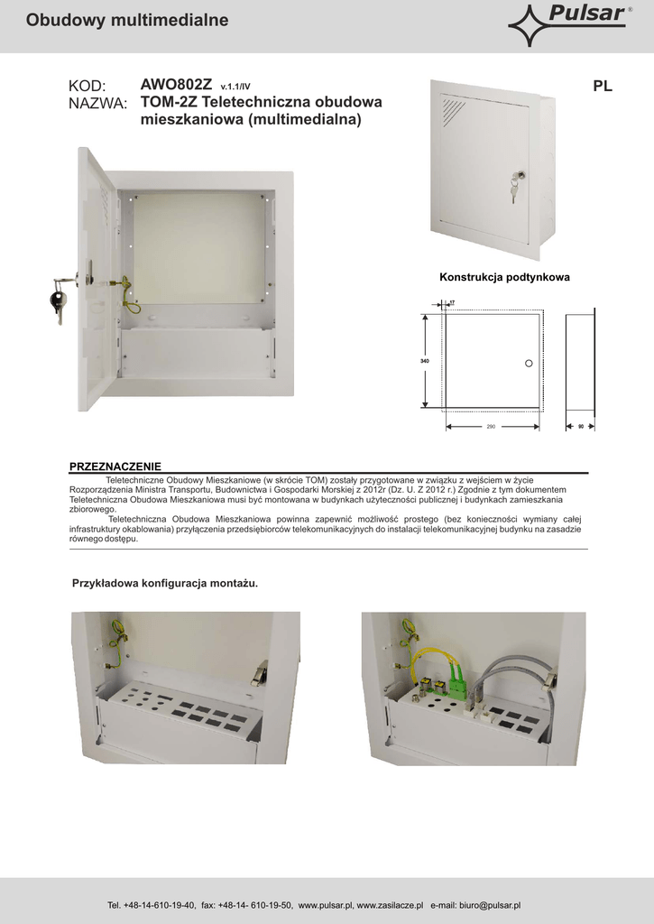 Pulsar Obudowy multimedialne AWO802Z v.1.1/IV KOD: NAZWA: TOM-2Z Teletechniczna obudowa mieszkaniowa (multimedialna) PL Konstrukcja podtynkowa 17 340 290 90 PRZEZNACZENIE Teletechniczne Obudowy Mieszkaniowe (w skrócie TOM) zostały przygotowane w związku z wejściem w życie Rozporządzenia Ministra Transportu, Budownictwa i Gospodarki Morskiej z 2012r (Dz. U. Z 2012 r.) Zgodnie z tym dokumentem Teletechniczna Obudowa Mieszkaniowa musi być montowana w budynkach użyteczności publicznej i budynkach zamieszkania zbiorowego. Teletechniczna Obudowa Mieszkaniowa powinna zapewnić możliwość prostego (bez konieczności wymiany całej infrastruktury okablowania) przyłączenia przedsiębiorców telekomunikacyjnych do instalacji telekomunikacyjnej budynku na zasadzie równego dostępu. Przykładowa konfiguracja montażu. Tel. +48-14-610-19-40, fax: +48-14- 610-19-50, www.pulsar.pl, www.zasilacze.pl e-mail: [email protected] ® Obudowy multimedialne Pulsar OPIS PRODUKTU Teletechniczne obudowy mieszkaniowe pozwalają na integrację elementów sieci komputerowej, telefonicznej, telewizyjnej (RTVSAT), światłowodowej oraz innych instalacji teletechnicznych. Służy do tego łatwo demontowany adapter z miejscem na gniazda typu „keystone” (montaż złącz RJ45, oraz złącz „F”), dodatkowe otwory pod złącza „F” oraz otwory pod złącza światłowodowe SC/APC (pojedyncze i podwójne). W górnej części na tylnej ściance można zamontować dodatkowe element tj. rozgałęźniki RTVSAT. Montaż tych elementów również jest bardzo wygodny i szybki, gdyż dołączona płyta PCV pozwala na montaż urządzeń za pomocą wkrętów, bez konieczności wcześniejszego wykonania otworów. CECHY PRODUKTU 1. Konstrukcja podtynkowa. 2. Zdejmowany, regulowany kołnierz - ochrona kołnierza przy pracach remontowo-budowlanych; - łatwy i estetyczny montaż nawet w przypadku nierówności podłoża; - regulacja głębokości obudowy. 3. Zdejmowane drzwiczki (wygodna instalacja okablowania i innych urządzeń) 4. Montaż drzwiczek jako lewe lub prawe 5. Płyta montażowa z tworzywa PCV (łatwy i szybki montaż dodatkowego wyposażenia) 6. W komplecie adapter do montażu gniazd typu keystone RJ45, złączy F oraz złączy światłowodowych S.C./APC. 7. Duża ilość przetłoczeń otworów do wprowadzenia przewodów i mocowania skrzynki w otworze 8. Obudowa zamykana na zamek 9. Uziemienie elementów obudowy DANE TECHNICZNE Wymiary: Waga netto/brutto: Wykonanie: Zastosowanie: Zamykanie: Gwarancja: wewnętrzne: W=290, H=340, D=80 zewnętrzne: W1=330, H1=380, D1=90mm [mm, +/-2] 3,50kg / 3,90kg [+/-0,1kg] blacha ocynk elektrolityczny DC01, powłoka cynku 3µm, zabezpieczenie antykorozyjne:farba poliestrowa, zastosowanie przemysłowe, kolor RAL9003 (biały) do wewnątrz zamek 2 lata od daty produkcji Tel. +48-14-610-19-40, fax: +48-14- 610-19-50, www.pulsar.pl, www.zasilacze.pl e-mail: [email protected] ®