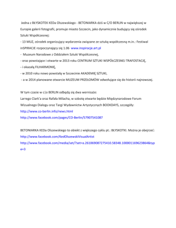 Jedna z BŁYSKOTEK KEDa Olszewskiego -‐ BETONIARKA dziś w C/O BERLIN w największej w Europie galerii fotografii, promuje miasto Szczecin, jako dynamicznie budujący się ośrodek Sztuki Współczesnej: -‐ 13 MUZ, ośrodek organizujący wydarzenia związane ze sztuką współczesną m.in.: Festiwal inSPIRACJE rozpoczynający się 1.06 www.inspiracje.art.pl -‐ Muzeum Narodowe z Oddziałem Sztuki Współczesnej, -‐ oraz powstające i otwarte w 2013 roku CENTRUM SZTUKI WSPÓŁCZESNEJ TRAFOSTACJĘ, -‐ i okazałą FILHARMONIĘ, -‐ w 2010 roku nowo powstałą w Szczecinie AKADEMIĘ SZTUKI, -‐ a w 2014 planowane otwarcie MUZEUM PRZEŁOMÓW odwołujące się do historii najnowszej. W tym czasie w c|o BERLIN odbędą się dwa wernisaże: Larrego Clark’a oraz Rafała Milacha, w sobotę otwarte będzie Międzynarodowe Forum Wizualnego Dialogu oraz Targi Wydawnictw Artystycznych BOOKDAYS, szczegóły: http://www.co-‐berlin.info/news.html http://www.facebook.com/pages/CO-‐Berlin/57907541087 BETONIARKA KEDa Olszewskiego to obiekt z większego cyklu pt.: BŁYSKOTKI. Można je obejrzeć: http://www.facebook.com/KedOlszewskiVisualArtist http://www.facebook.com/media/set/?set=a.261069087275410.58348.100001169623864&typ e=3