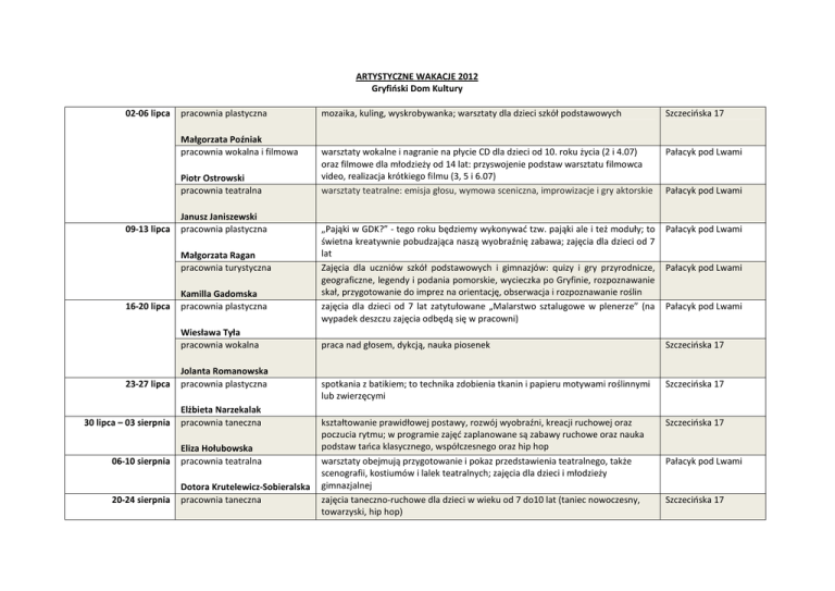 ARTYSTYCZNE WAKACJE 2012 Gryfiński Dom Kultury pracownia