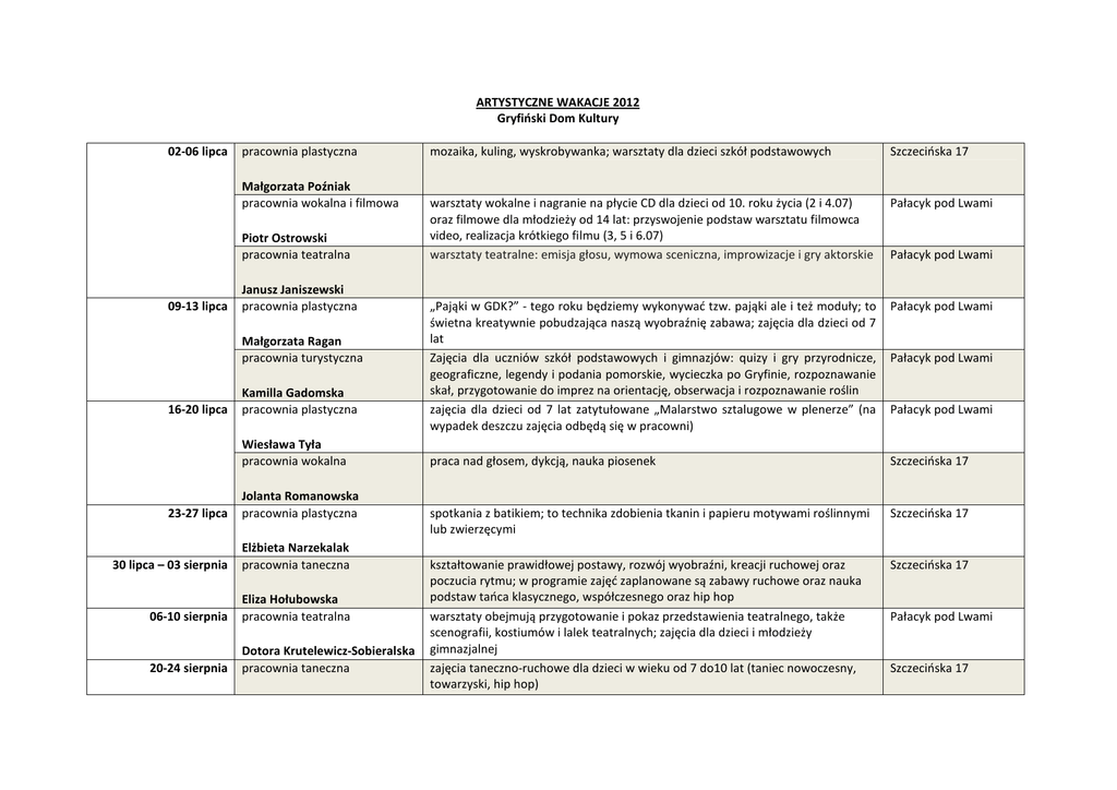 ARTYSTYCZNE WAKACJE 2012 Gryfiński Dom Kultury 02-06 lipca pracownia plastyczna Małgorzata Poźniak pracownia wokalna i filmowa Piotr Ostrowski pracownia teatralna 09-13 lipca Janusz Janiszewski pracownia plastyczna Małgorzata Ragan pracownia turystyczna 16-20 lipca Kamilla Gadomska pracownia plastyczna Wiesława Tyła pracownia wokalna 23-27 lipca Jolanta Romanowska pracownia plastyczna 30 lipca – 03 sierpnia Elżbieta Narzekalak pracownia taneczna 06-10 sierpnia Eliza Hołubowska pracownia teatralna 20-24 sierpnia Dotora Krutelewicz-Sobieralska pracownia taneczna mozaika, kuling, wyskrobywanka; warsztaty dla dzieci szkół podstawowych Szczecińska 17 warsztaty wokalne i nagranie na płycie CD dla dzieci od 10. roku życia (2 i 4.07) oraz filmowe dla młodzieży od 14 lat: przyswojenie podstaw warsztatu filmowca video, realizacja krótkiego filmu (3, 5 i 6.07) warsztaty teatralne: emisja głosu, wymowa sceniczna, improwizacje i gry aktorskie Pałacyk pod Lwami „Pająki w GDK?” - tego roku będziemy wykonywać tzw. pająki ale i też moduły; to świetna kreatywnie pobudzająca naszą wyobraźnię zabawa; zajęcia dla dzieci od 7 lat Zajęcia dla uczniów szkół podstawowych i gimnazjów: quizy i gry przyrodnicze, geograficzne, legendy i podania pomorskie, wycieczka po Gryfinie, rozpoznawanie skał, przygotowanie do imprez na orientację, obserwacja i rozpoznawanie roślin zajęcia dla dzieci od 7 lat zatytułowane „Malarstwo sztalugowe w plenerze” (na wypadek deszczu zajęcia odbędą się w pracowni) Pałacyk pod Lwami Pałacyk pod Lwami Pałacyk pod Lwami Pałacyk pod Lwami praca nad głosem, dykcją, nauka piosenek Szczecińska 17 spotkania z batikiem; to technika zdobienia tkanin i papieru motywami roślinnymi lub zwierzęcymi Szczecińska 17 kształtowanie prawidłowej postawy, rozwój wyobraźni, kreacji ruchowej oraz poczucia rytmu; w programie zajęć zaplanowane są zabawy ruchowe oraz nauka podstaw tańca klasycznego, współczesnego oraz hip hop warsztaty obejmują przygotowanie i pokaz przedstawienia teatralnego, także scenografii, kostiumów i lalek teatralnych; zajęcia dla dzieci i młodzieży gimnazjalnej zajęcia taneczno-ruchowe dla dzieci w wieku od 7 do10 lat (taniec nowoczesny, towarzyski, hip hop) Szczecińska 17 Pałacyk pod Lwami Szczecińska 17 Katarzyna Pawlak pracownia teatralna 27-31 sierpnia Krzysztof Gmiter pracownia teatralna gry i zabawy teatralne i integracyjne, podstawy dramy, ćwiczenia teatralne i indywidualne w grupie Szczecińska 17 warsztaty teatralne dla młodzieży gimnazjów i szkół ponagimnazjalnych. Szczecińska 17 Maria Piznal Każde zajęcia rozpoczynają się o godz. 10.00, a kończą o 11.30.