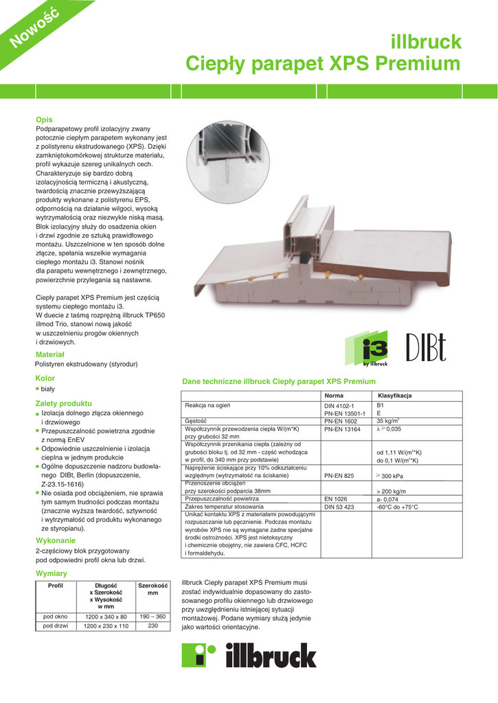 ść o w No illbruck Ciepły parapet XPS Premium Opis Podparapetowy profil izolacyjny zwany potocznie ciepłym parapetem wykonany jest z polistyrenu ekstrudowanego (XPS). Dzięki zamkniętokomórkowej strukturze materiału, profil wykazuje szereg unikalnych cech. Charakteryzuje się bardzo dobrą izolacyjnością termiczną i akustyczną, twardością znacznie przewyższającą produkty wykonane z polistyrenu EPS, odpornością na działanie wilgoci, wysoką wytrzymałością oraz niezwykle niską masą. Blok izolacyjny służy do osadzenia okien i drzwi zgodnie ze sztuką prawidłowego montażu. Uszczelnione w ten sposób dolne złącze, spełania wszelkie wymagania ciepłego montażu i3. Stanowi nośnik dla parapetu wewnętrznego i zewnętrznego, powierzchnie przylegania są nastawne. Ciepły parapet XPS Premium jest częścią systemu ciepłego montażu i3. W duecie z taśmą rozprężną illbruck TP650 illmod Trio, stanowi nową jakość w uszczelnieniu progów okiennych i drzwiowych. Materiał Polistyren ekstrudowany (styrodur) Kolor Dane techniczne illbruck Ciepły parapet XPS Premium biały Zalety produktu Reakcja na ogień Izolacja dolnego złącza okiennego i drzwiowego Przepuszczalność powietrzna zgodnie z normą EnEV Odpowiednie uszczelnienie i izolacja cieplna w jednym produkcie Ogólne dopuszczenie nadzoru budowlanego DIBt, Berlin (dopuszczenie, Z-23.15-1616) Nie osiada pod obciążeniem, nie sprawia tym samym trudności podczas montażu (znacznie wyższa twardość, sztywność i wytrzymałość od produktu wykonanego ze styropianu). Wykonanie 2-częściowy blok przygotowany pod odpowiedni profil okna lub drzwi. Gęstość Współczynnik przewodzenia ciepła W/(m*K) przy grubości 32 mm Współczynnik przenikania ciepła (zależny od grubości bloku tj. od 32 mm - część wchodząca w profil, do 340 mm przy podstawie) Naprężenie ściskające przy 10% odkształceniu względnym (wytrzymałość na ściskanie) Przenoszenie obciążeń przy szerokości podparcia 38mm Przepuszczalność powietrza Zakres temperatur stosowania Unikać kontaktu XPS z materiałami powodującymi rozpuszczanie lub pęcznienie. Podczas montażu wyrobów XPS nie są wymagane żadne specjalne środki ostrożności. XPS jest nietoksyczny i chemicznie obojętny, nie zawiera CFC, HCFC i formaldehydu. Wymiary Długość x Szerokość x Wysokość w mm Szerokość mm pod okno 1200 x 340 x 80 190 – 360 pod drzwi 1200 x 230 x 110 230 Profil illbruck Ciepły parapet XPS Premium musi zostać indywidualnie dopasowany do zastosowanego profilu okiennego lub drzwiowego przy uwzględnieniu istniejącej sytuacji montażowej. Podane wymiary służą jedynie jako wartości orientacyjne. Norma Klasyfikacja DIN 4102-1 PN-EN 13501-1 PN-EN 1602 PN-EN 13164 B1 E 35 kg/m3 ≤ 0,035 l od 1,11 W/(m2*K) do 0,1 W/(m2*K) PN-EN 825 EN 1026 DIN 53 423 ≤ 300 kPa > 200 kg/m a- 0,074 -60°C do +75°C illbruck Ciepły parapet XPS Premium Montaż illbruck Ciepły parapet XPS Premium klejony jest za pomocą kleju konstrukcyjnego PU014 Multi, MS055 lub zaprawy termoizolacyjnej illbruck na murze podokiennym i ustawiany zgodnie z wytyczonym planem położenia okna. W przypadku istnienia gładzi cementowej na murze podokiennym zaleca się stosowanie kleju konstrukcyjnego PU014 Multi, zaś przy większych nierównościach zaprawy termoizolacyjnej iilbruck. Nie ma konieczności uprzedniego kładzenia gładzi cementowej. Uwaga Dla okien i drzwi o obciążeniu przekraczającym 200kg/mb profilu, zalecane jest systemowe poszerzenie PCV. Stosowanie produku illbruck Ciepły parapet XPS Premium, w takim przypadku, jest niewskazane. Uszczelnienie Przed montażem okna naklejana jest od wewnątrz taśma illbruck illmod 15/4. Taśma uszczelniająca illmod pomaga w hermetycznym uszczelnieniu połączenia. Zastosowanie bloku izolacyjnego odpowiada montażowi i uszczelnieniu okna według najnowszego stanu techniki, zgodnie z wymogami RAL . Rys. 1: Dodatkowe mechaniczne mocowanie parapetu zewnętrznego za pomocą listwy PCV i wkrętów Rys. 2: Optymalne dolne osadzenie okna z produktem illbruck Ciepły parapet XPS Premium. Serwis Asortyment Tremco illbruck Na życzenie klienta firma Tremco illbruck udostępnia w każdej chwili fachową pomoc techniczną. illbruck Taśmy uszczelniające do fug illbruck Pianki poliuretanowe illbruck Taśmy uszczelniające butylowe illbruck Folie illbruck Produkty specjalne Tremco Materiały uszczelniające illbruck Kleje Parapety Parapety zewnętrzne i wewnętrzne klejone są włączonym do systemu wielofunkcyjnym klejem konstrukcyjnym Multi PU014 lub klejem uszczelniającym MS055 i w razie konieczności przykręcane wkrętami (parapet zewnętrzny) (rys. 1). W celu dodatkowego mechanicznego wzmocnienia aluminiowego parapetu zewnętrznego w blok została wsunięta płaska listwa PCV 25 x 2,5 mm. Informacje dodatkowe Powyższe informacje mogą być tylko ogólnymi wskazówkami. Ze względu na to, że nie mamy wpływu na warunki obróbki i zastosowania, jak również z powodu różnorodności stosowanych materiałów, należy przeprowadzić odpowiednie próby we własnym zakresie, aby sprawdzić materiał pod kątem dopasowania się do konkretnego zastosowania. Stan informacji producenta na 03/11. Zastrzega się możliwość zmian technicznych. Najnowszą wersję znajdziecie Państwo na stronie www.tremco-illbruck.pl