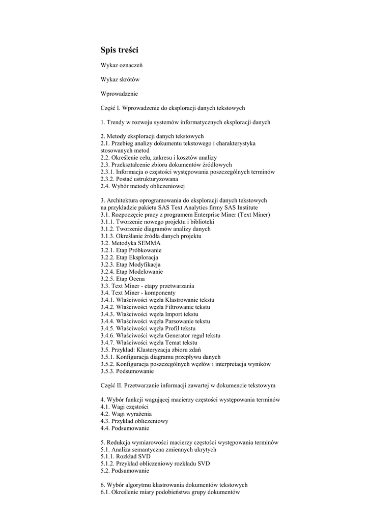 Spis treści Wykaz oznaczeń Wykaz skrótów Wprowadzenie Część I. Wprowadzenie do eksploracji danych tekstowych 1. Trendy w rozwoju systemów informatycznych eksploracji danych 2. Metody eksploracji danych tekstowych 2.1. Przebieg analizy dokumentu tekstowego i charakterystyka stosowanych metod 2.2. Określenie celu, zakresu i kosztów analizy 2.3. Przekształcenie zbioru dokumentów źródłowych 2.3.1. Informacja o częstości występowania poszczególnych terminów 2.3.2. Postać ustrukturyzowana 2.4. Wybór metody obliczeniowej 3. Architektura oprogramowania do eksploracji danych tekstowych na przykładzie pakietu SAS Text Analytics firmy SAS Institute 3.1. Rozpoczęcie pracy z programem Enterprise Miner (Text Miner) 3.1.1. Tworzenie nowego projektu i biblioteki 3.1.2. Tworzenie diagramów analizy danych 3.1.3. Określanie źródła danych projektu 3.2. Metodyka SEMMA 3.2.1. Etap Próbkowanie 3.2.2. Etap Eksploracja 3.2.3. Etap Modyfikacja 3.2.4. Etap Modelowanie 3.2.5. Etap Ocena 3.3. Text Miner - etapy przetwarzania 3.4. Text Miner - komponenty 3.4.1. Właściwości węzła Klastrowanie tekstu 3.4.2. Właściwości węzła Filtrowanie tekstu 3.4.3. Właściwości węzła Import tekstu 3.4.4. Właściwości węzła Parsowanie tekstu 3.4.5. Właściwości węzła Profil tekstu 3.4.6. Właściwości węzła Generator reguł tekstu 3.4.7. Właściwości węzła Temat tekstu 3.5. Przykład: Klasteryzacja zbioru zdań 3.5.1. Konfiguracja diagramu przepływu danych 3.5.2. Konfiguracja poszczególnych węzłów i interpretacja wyników 3.5.3. Podsumowanie Część II. Przetwarzanie informacji zawartej w dokumencie tekstowym 4. Wybór funkcji wagującej macierzy częstości występowania terminów 4.1. Wagi częstości 4.2. Wagi wyrażenia 4.3. Przykład obliczeniowy 4.4. Podsumowanie 5. Redukcja wymiarowości macierzy częstości występowania terminów 5.1. Analiza semantyczna zmiennych ukrytych 5.1.1. Rozkład SVD 5.1.2. Przykład obliczeniowy rozkładu SVD 5.2. Podsumowanie 6. Wybór algorytmu klastrowania dokumentów tekstowych 6.1. Określenie miary podobieństwa grupy dokumentów 6.2. Algorytmy klastrowania 6.3. Grupowanie za pomocą węzła Klastrowanie tekstów 6.3.1. Węzeł Klastrowanie tekstu - algorytm Hierarchiczny 6.3.2. Węzeł Klastrowanie tekstu - algorytm Maksymalizacja oczekiwań 6.3.3. Węzeł Klastrowanie tekstu - właściwość Terminy opisowe 6.4. Grupowanie za pomocą węzła Temat tekstu 6.4.1. Tematy definiowane przez użytkownika 6.5. Posumowanie 7. Zarys metodyki tworzenia modeli predykcyjnych oraz porównywania zdolności predykcyjnych modeli 7.1. Tworzenie modelu predykcyjnego 7.2. Ocena błędu klasyfikacji 7.2.1. Krzywe ROC 7.2.2. Wykresy wzrostu 7.3. Przykład: Użycie węzła Importowanie tekstu oraz porównywanie modeli predykcyjnych 7.3.1. Konfiguracja diagramu przepływu danych oraz poszczególnych węzłów 7.4. Podsumowanie 8. Klastrowanie dokumentów nadzorowane przez użytkownika 8.1. Charakterystyka węzła Generator reguł tekstu 8.2. Podsumowanie Część III. Wydobywanie i organizacja wiedzy z dokumentów tekstowych w instytucji 9. Zarys zagadnień związanych z wydobywaniem i organizacją wiedzy w instytucji 9.1. Wprowadzenie 9.1.1. SAS Crawler 9.1.2. SAS Search and Indexing 9.1.3. SAS Information Retrival Studio 9.2. Podsumowanie 10. Klasyfikacja dokumentów 10.1. SAS Content Categorization Studio 10.1.1. Metody klasyfikacji dokumentów dostępne w SAS CCS 10.1.2. Wydobywanie konceptów dostępne w SAS CCS 10.1.3. Wydobywanie kontekstu dostępne w SAS CCS 10.1.4. Zakładanie nowego projektu 10.1.5. Metodyka planowania projektu 10.1.6. Tworzenie nowej kategorii 10.1.7. Zasady używania kategoryzatora statystycznego 10.1.8. Zasady używania kategoryzatora generującego reguły automatycznie 10.1.9. Zasady używania kategoryzatora bazującego na regułach 10.1.10. Praca z konceptami 10.2. Przykład: Zastosowania klasyfikacji dokumentów w celu wspomagania diagnostyki w departamencie radiodiagnostyki 10.3. Podsumowanie 11. Analiza sentymentu 11.1. SAS Sentiment Analysis Studio 11.1.1. Metoda oceny sentymentu dla dokumentu 11.1.2. Zakładanie nowego projektu 11.1.3. Testowanie istniejących modeli 11.1.4. Tworzenie modeli hybrydowych 11.1.5. SAS Sentiment Analysis Server 11.2. Przykład analizy sentymentu użytkowników telefonów komórkowych 11.3. Podsumowanie Część IV. Inne zagadnienia przetwarzania dokumentów tekstowych 12. Inne elementy przetwarzania danych tekstowych 12.1. Porównywanie dokumentów za pomocą metryk 12.1.1. Odległość kosinusowa 12.1.2. Metryka Jaccarda 12.2. Wydobywanie jednostek specjalnych z dokumentów Słownik pojęć związanych z eksploracją danych tekstowych Dodatek A: Podstawy obsługi środowiska SAS i język 4GL A.1. Wprowadzenie do obsługi systemu SAS A.1.1. Struktura zbioru danych SAS A.1.2. Formaty i informaty A.2. Język 4GL A.2.1. Blok typu DATA STEP A.2.2. Blok typu PROC STEP Dodatek B: Podstawy języka makr B.1. Makrozmienne B.2. Makroprogramy Dodatek C: Wizualna interpretacja danych C.1. Przegląd typów wykresów stosowanych dla danych tekstowych Bibliografia Indeks pojęć Spis rysunków Spis tabel
