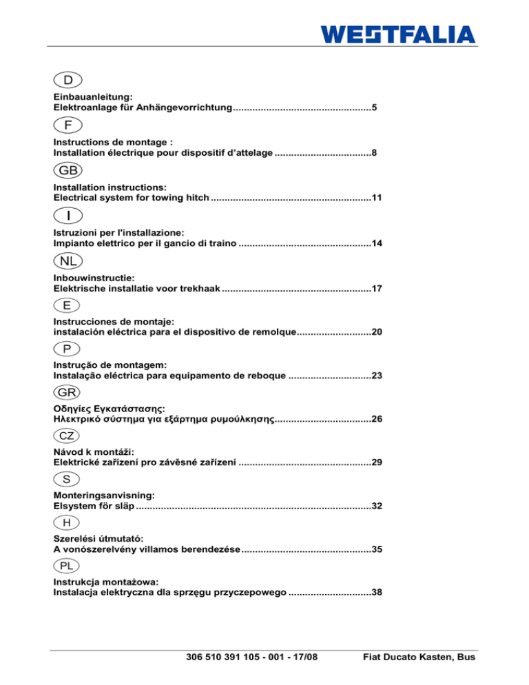 ........................................................................................................5 Einbauanleitung: Elektroanlage für Anhängevorrichtung..................................................5 ........................................................................................................8 Instructions de montage : Installation électrique pour dispositif d’attelage ...................................8 ........................................................................................................11 Installation instructions: Electrical system for towing hitch ..........................................................11 ........................................................................................................14 Istruzioni per l'installazione: Impianto elettrico per il gancio di traino ................................................14 ........................................................................................................17 Inbouwinstructie: Elektrische installatie voor trekhaak ......................................................17 .........................................................................................................20 Instrucciones de montaje: instalación eléctrica para el dispositivo de remolque...........................20 .........................................................................................................23 Instrução de montagem: Instalação eléctrica para equipamento de reboque ..............................23 .........................................................................................................26 ������� ������������: ������ι�� �����µ� �ι� ������µ� ��µ��������...................................26 .........................................................................................................29 Návod k montáži: Elektrické za�ízení pro záv�sné za�ízení ................................................29 .........................................................................................................32 Monteringsanvisning: Elsystem för släp .....................................................................................32 .........................................................................................................35 Szerelési útmutató: A vonószerelvény villamos berendezése...............................................35 .........................................................................................................38 Instrukcja monta�owa: Instalacja elektryczna dla sprz�gu przyczepowego ..............................38 306 510 391 105 - 001 - 17/08 Fiat Ducato Kasten, Bus DIN 11446 2 306 510 391 105 - 001 - 17/08 Min. 5 W grün Max. 42 W 8 schwarz noir / / gelb jaune -- schwarz noir 11 12 13 -- gelb jaune rouge vert 10 rot Min. 5 W grau/ gris/ noir gray/blac grigio / Max. 20 W schwarz k nero 7 9 Min. 5 W schwarz/ noir/roug black/red nero / Max. 42 W rot e rosso 6 black -- black / yellow yellow red green nero -- nero / giallo giallo rosso verde gris/roug gray/ red grigio / e rosso Min. 5 W grau/rot Max. 20 W nero / verde nero 5 black/ green black Min. 5 W schwarz/ noir/vert Max. 21 W grün schwarz noir bianco nero / bianco 4 3 white Min. 5 W weiß Max. 42 W 2 blanc black / white Min. 5 W schwarz/ noir / Max. 21 W weiß blanc 1 Leistung / Power �erno zelená �erno bílá zwart -- zwart / geel geel rood groen grijs / zwart zwart / rood negro / rojo gris/rojo negro / verde negro blanco �erno -- �erno / žlutá žlutá �ervená zelená negro -- negro / amarillo amarillo rojo verde šedo�ern gris / á negro �erno �ervená grijs/rood šedo �ervená zwart/ groen zwart wit zwart/wit �ernobílá negro / blanco preto -- preto / amarelo amarelo �ierna biela µ���� -- µ���� / ������� ������� szaro / sivá / �ervená czerwony czarno / zielony czarno bia�y czarno / bia�y svart -- zielony szaro / czarny žltá �ierna -- czarno -- czarno / �ó�ty �ó�ty �ervená czerwony svart /gul �ierna / žltá gul röd zelená grå/svart sivá / �ierna svart/röd �ierna / czarno / �ervená czerwony grå/röd ������� grön vermelho ������� verde ���� / µ���� preto / µ���� / vermelho ������� cinza / preto svart vit svart / vit �ierna / biela µ���� / svart/grö �ierna/ ������� n zelená µ���� ��υ�� µ���� / ��υ�� cinza / ���� / vermelho ������� preto / verde preto branco preto / branco Einbauanleitung: Elektroanlage für Anhängevorrichtung Fiat Ducato Kasten, Bus Einbauanleitung: Elektroanlage für Anhängevorrichtung WESTFALIA S.I.A.R.R. Fiat 306 510 300 107 8876 46 216 861 Fiat Ducato Kasten, Bus 46 216 862 Fiat Ducato Kasten, Bus 306 510 300 113 4 5 6 12 7 11 8 1 2 3 9 10 1 3. 2. 2. 2 Fiat Ducato Kasten, Bus 1. 306 510 391 105 - 001 - 17/08 3 Einbauanleitung: Elektroanlage für Anhängevorrichtung 1 2 3 4 5 10 6 7 9 8 3 4 306 510 391 105 - 001 - 17/08 Fiat Ducato Kasten, Bus Einbauanleitung: Elektroanlage für Anhängevorrichtung Einbauanleitung: Elektroanlage für Anhängevorrichtung Wichtige Hinweise Vor Arbeitsbeginn die Einbauanleitung lesen. Der Elektroeinbausatz darf nur von qualifiziertem Fachpersonal eingebaut werden. Vorsicht – Batterie abklemmen! Beschädigung der KFZ-Elektronik, elektronisch gespeicherte Daten können verloren gehen. Vor Arbeitsbeginn den Fehlerspeicher auslesen. Ggf. ein Ruhestrom-Erhaltungsgerät verwenden. Vor dem Bohren sicherstellen, dass sich keine Gegenstände, wie z.B. Leitungen, hinter den Verkleidungen befinden. Blanke Karosseriestellen, wie z.B. gebohrte Löcher, entgraten und anschließend mit einem Rostschutzmittel versi