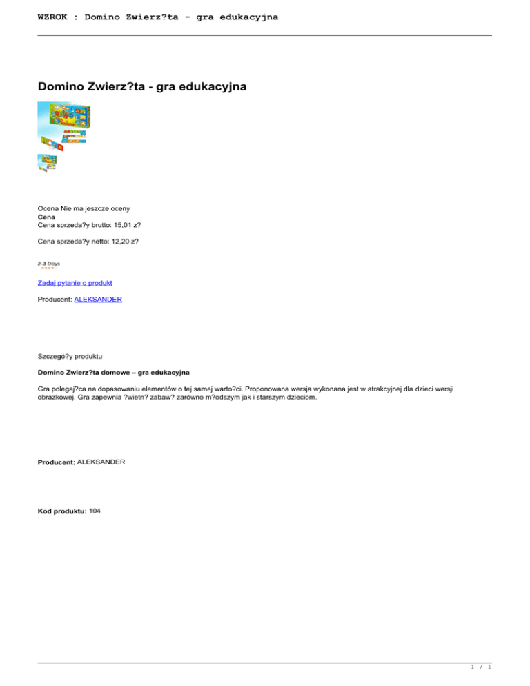 WZROK : Domino Zwierz?ta - gra edukacyjna Domino Zwierz?ta - gra edukacyjna Ocena Nie ma jeszcze oceny Cena Cena sprzeda?y brutto: 15,01 z? Cena sprzeda?y netto: 12,20 z? Zadaj pytanie o produkt Producent: ALEKSANDER Szczegó?y produktu Domino Zwierz?ta domowe – gra edukacyjna Gra polegaj?ca na dopasowaniu elementów o tej samej warto?ci. Proponowana wersja wykonana jest w atrakcyjnej dla dzieci wersji obrazkowej. Gra zapewnia ?wietn? zabaw? zarówno m?odszym jak i starszym dzieciom. Producent: ALEKSANDER Kod produktu: 104 1 / 1 Powered by TCPDF (www.tcpdf.org)
