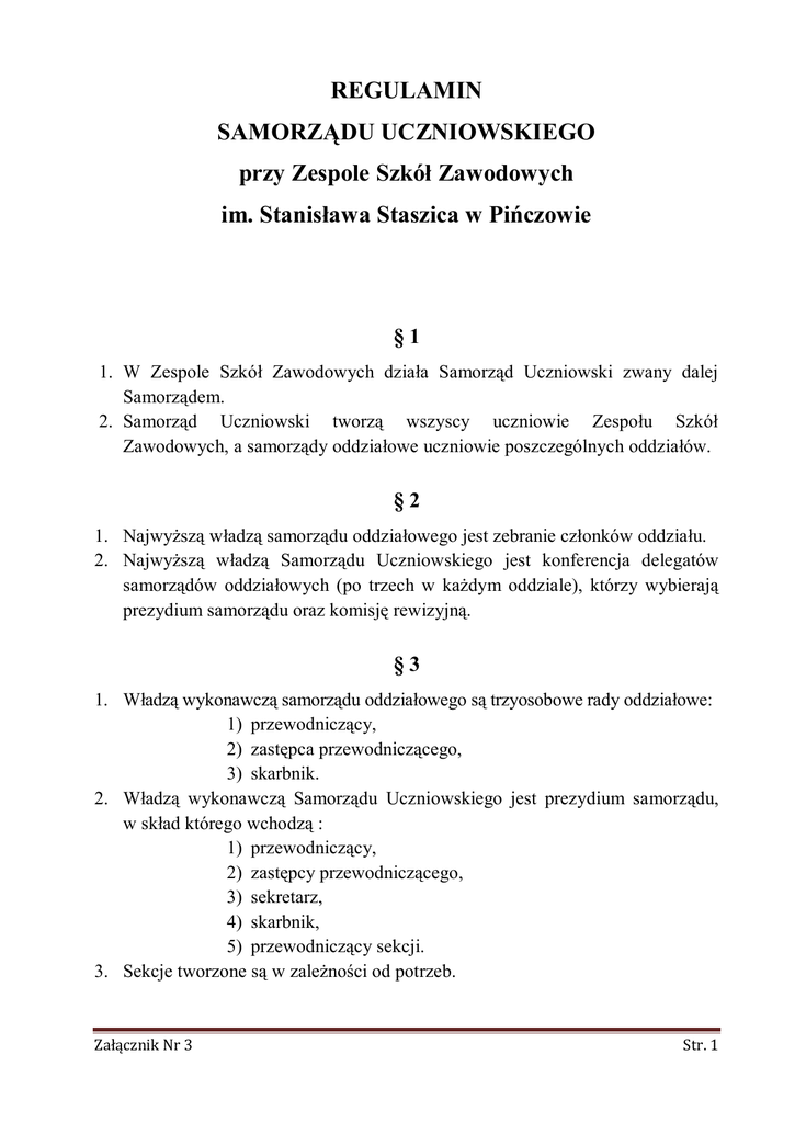 REGULAMIN SAMORZĄDU UCZNIOWSKIEGO przy Zespole Szkół Zawodowych im. Stanisława Staszica w Pińczowie §1 1. W Zespole Szkół Zawodowych działa Samorząd Uczniowski zwany dalej Samorządem. 2. Samorząd Uczniowski tworzą wszyscy uczniowie Zespołu Szkół Zawodowych, a samorządy oddziałowe uczniowie poszczególnych oddziałów. §2 1. Najwyższą władzą samorządu oddziałowego jest zebranie członków oddziału. 2. Najwyższą władzą Samorządu Uczniowskiego jest konferencja delegatów samorządów oddziałowych (po trzech w każdym oddziale), którzy wybierają prezydium samorządu oraz komisję rewizyjną. §3 1. Władzą wykonawczą samorządu oddziałowego są trzyosobowe rady oddziałowe: 1) przewodniczący, 2) zastępca przewodniczącego, 3) skarbnik. 2. Władzą wykonawczą Samorządu Uczniowskiego jest prezydium samorządu, w skład którego wchodzą : 1) przewodniczący, 2) zastępcy przewodniczącego, 3) sekretarz, 4) skarbnik, 5) przewodniczący sekcji. 3. Sekcje tworzone są w zależności od potrzeb. Załącznik Nr 3 Str. 1 §4 1. Funkcję kontrolną wobec Samorządu spełnia trzyosobowa komisja rewizyjna w składzie: 1) przewodniczący komisji, 2) zastępca przewodniczącego, 3) członek. §5 1. Wybory do samorządu i komisji rewizyjnej odbywają się w głosowaniu równym, tajnym i powszechnym przez zebranie ogółu członków lub delegatów. 2. Kadencja prezydium samorządu i komisji rewizyjnej trwa 2 lata. §6 Organy samorządu są jedynymi reprezentacjami ogółu uczniów wobec dyrekcji szkoły i Rady Pedagogicznej. §7 Prezydium samorządu i komisja rewizyjna informują ogół uczniów o swojej działalności i składają im sprawozdania. §8 Samorząd może przedstawić Radzie Pedagogicznej oraz Dyrektorowi Szkoły wnioski i opinie we wszystkich sprawach szkoły, w szczególności dotyczących realizacji podstawowych praw i obowiązków uczniów zawartych w Statucie Zespołu Szkół Zawodowych. §9 Samorząd może powołać sąd koleżeński do rozpatrywania konfliktów między uczniami i innych przypadków naruszania zasad określonych w statucie szkoły. § 10 Zebrania, narady, spotkania samorządu odbywają się w czasie wolnym od zajęć szkolnych. Załącznik Nr 3 Str. 2 § 11 Samorząd ma prawo wskazać dyrektorowi szkoły kandydata na opiekuna samorządu wybranego przez delegatów w głosowaniu tajnym. § 12 1. Samorząd posiada własne fundusze, które służą do finansowania jego działalności. 2. Dysponentem funduszy jest rada prezydium samorządu w porozumieniu z opiekunem. 3. Fundusze samorządu są tworzone z kwot uzyskanych za wykonaną odpłatną pracę przez uczniów, z dochodów imprez organizowanych przez samorząd, ze zbiórek surowców wtórnych itp. 4. Fundusze samorządu są zdeponowane na książeczce w PKO. 5. Dokumentacja finansowa winna być prowadzona zgodnie z obowiązującymi przepisami. § 13 1. Regulamin samorządu jest uchwalany na zebraniu ogólnym delegatów w obecności co najmniej 2/3 składu zwykłą większością głosów. 2. Zmiany w regulaminie mogą być dokonywane na wniosek delegatów lub Dyrektora Szkoły w głosowaniu jak w punkcie 1. § 14 Uczeń ma prawo do: 1) uzyskania wyczerpujących informacji na temat wymagań edukacyjnych, kryteriów oceniania oraz metod nauczania, 2) właściwie zorganizowanego procesu kształcenia zgodnie z zasadami higieny pracy umysłowej, 3) opieki wychowawczej i warunków pobytu w Szkole zapewniających bezpieczeństwo, ochronę przed wszelkimi formami przemocy fizycznej bądź psychicznej oraz ochronę i poszanowanie jego godności osobistej, 4) życzliwego, podmiotowego traktowania w procesie dydaktycznowychowawczym, 5) umotywowanej oceny postępów w nauce, 6) korzystania z pomocy nauczyciela w przypadku trudności w nauce, Załącznik Nr 3 Str. 3 7) korzystania z poradnictwa psychologiczno-pedagogicznego i zawodowego, 8) korzystania pod opieką nauczyciela z pracowni szkolnych, sprzętu, środków dydaktycznych, księgozbioru biblioteki podczas zajęć szkolnych i pozalekcyjnych, 9) jawnej, sprawiedliwej i obiektywnej oceny oraz ustalonych sposobów kontroli postępów w nauce: a) zachowanie ucznia na lekcji nie może stanowić kryterium oceny poziomu jego wiedzy i umiejętności z danego przedmiotu, b) oceny poziomu wiedzy i umiejętności powinny być dokonywane systematycznie w różnych formach, w warunkach zapewniających ich obiektywność, c) uczeń ma prawo odwołania się od wystawionej oceny z przedmiotu lub zachowania na zasadach określonych w odrębnych przepisach; 10) wpływania na życie Szkoły przez działalność samorządową oraz zrzeszenia się w organizacjach działających w Szkole, 11) rozwijania zainteresowań, zdolności i talentów w ramach kół i organizacji działających na terenie Szkoły, 12) swobodnego wyrażania myśli i przekonań światopoglądowych i religijnych, 13) reprezentowania Szkoły w olimpiadach, konkursach, zawodach sportowych i innych, 14) przystępowania do egzaminu poprawkowego i klasyfikacyjnego zgodnie z Wewnątrzszkolnym Systemem Oceniania. § 15 Uczeń ma obowiązek: 1) przestrzegania postanowień zawartych w statucie Szkoły, 2) uczęszczania na zajęcia edukacyjne, należytego przygotowania się do nich oraz aktywnego udziału w zajęciach, a także niezakłócania przebiegu zajęć przez niewłaściwe zachowanie, 3) przedstawiania, w określonym terminie, pisemnego usprawiedliwienia, w formie: a) zaświadczenia lekarskiego, b) oświadczenia rodziców lub oświadczenia pełnoletniego ucznia o uzasadnionej przyczynie nieobecności; 4) właściwego zwracania się do nauczycieli, pracowników Szkoły oraz koleżanek i kolegów, 5) dbania o wspólne dobro, ład i porządek w Szkole, Załącznik Nr 3 Str. 4 6) dbania o kulturę słowa, kulturę bycia w miejscach publicznych, o higienę osobistą, estetykę ubioru (schludny wygląd) i fryzury, 7) dbania o własne zdrowie i życie, nieulegania nałogom; ucznia obowiązuje za