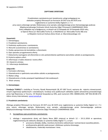 Nr zapytania 2/2016 ZAPYTANIE OFERTOWE Przedmiotem zamówienia jest świadczenie usługi polegającej na: obsłudze projekcji filmowych (w formacie 2K DCP oraz 4K DCP) oraz nagłośnienia w systemie Dolby Digital 5.1 i 7.1 przy użyciu własnego sprzętu Wykonawcy oraz sprzętu udostępnionego przez Zamawiającego podczas Międzynarodowego Festiwalu Sztuki Autorów Zdjęć Filmowych CAMERIMAGE 2016, który odbędzie się w Bydgoszczy, w dniach od 12 listopada do 19 listopada 2016 roku, w Operze Nova (ul. Marszałka Focha 5), w Multikinie (ul. Marszałka Focha 48) oraz w Miejskim Centrum Kultury (kino Orzeł, ul. Marcinkowskiego 12) Zawartość: 1. Zamawiający. 2. Przedmiot zamówienia. 3. Podmioty wykluczone z zamówienia. 4. Warunki uczestnictwa w zamówieniu. 5. Osoby uprawnione do kontaktów z oferentami. 6. Opis sposobu przygotowania oferty. 7. Dokumenty wymagane od oferentów w celu potwierdzenia spełniania warunków udziału w postępowaniu. 8. Kryteria wyboru ofert. 9. Informacje o trybie otwarcia i oceny ofert. 10. Zawarcie umowy. 11. Informacje dodatkowe. Załączniki: 1. Formularz ofertowy. 2. Oświadczenie o spełnianiu warunków udziału w postępowaniu. 3. Wykaz usług. 4. Oświadczenie o braku powiązań kapitałowych lub osobowych 5. Wzór umowy. 1. Zamawiający Fundacja TUMULT z siedzibą w Toruniu, Rynek Nowomiejski 28, 87-100 Toruń, wpisana do rejestru stowarzyszeń, innych organizacji społecznych i zawodowych, fundacji oraz publicznych zakładów opieki zdrowotnej prowadzonego przez Sąd Rejonowy w Toruniu, VII Wydział Gospodarczy KRS, pod numerem KRS: 0000012434, NIP 956-00-08-579. Adres strony internetowej: www.tumult.pl. 2. Przedmiot zamówienia Obsługa projekcji filmowych (w formacie 2K DCP oraz 4K DCP) oraz nagłośnienia w systemie Dolby Digital 5.1 i 7.1 przy użyciu własnego sprzętu Wykonawcy oraz sprzętu udostępnionego przez Zamawiającego podczas Międzynarodowego Festiwalu Sztuki Autorów Zdjęć Filmowych CAMERIMAGE 2016. A. Szczegółowy opis przedmiotu zamówienia: 1. obsługa i wyposażenie dużej sali Opery Nova (803 miejsca) w dniach 12 – 19.11.2016 w aparaturę nagłośnieniową do odsłuchu dźwięku w systemie Dolby Digital 7.1, w tym: procesory dźwięku dolby, monitory kontrolno-odsłuchowe i wzmacniacze wysokiej jakości, profesjonalne głośniki zaekranowe i efektowe systemu kinowego, okablowanie, materiały montażowe i inne; 1 2. instalacja projektorów i ich obsługa oraz obsługa aparatury niezbędnej do projekcji cyfrowych (PAKIETY DCP/DCI, w formacie 2K DCP lub w formacie 4K DCP) – projektor laserowy oraz projektor xenonowy firmy Barco, dostarczonych Zamawiającemu przez partnera festiwalu firmę Barco, oraz obsługa i wyposażenie w skaler (minimum 1 wejście HD-SDI/SD-SDI, 1 wejście DVI/HDMI, 1 wejście analogowe component lub composit) umożliwiający płynne przejścia między źródłami projekcji oraz dostosowanie proporcji obrazu, przy czym: a) projektor musi być dostosowany do możliwości projekcji pakietów: 2K DCP oraz 4K DCP, jak również do projekcji plików multimedialnych z zewnętrznego źródła, np. komputera, b) zasoby dyskowe serwera DCP powinny umożliwiać projekcję 100% materiału w formacie DCP z możliwością wgrania materiału na serwer i jego sprawdzenia co najmniej dobę przed projekcją; 3. skontaktowanie się i ustalenie szczegółów współpracy z firmą Barco przed Festiwalem Camerimage, tak, aby zapewnić najlepszą możliwą jakość instalacji projektorów wskazanych powyżej oraz zapewnienie maksymalnej wielkość zasobów dyskowych serwerów DCP umożliwiających projekcję 100% materiałów w formacie DCP z możliwością wgrania materiału na serwer i jego sprawdzenia co najmniej dobę przed projekcją. Sposób rozliczenia finansowego między partnerem Barco, a Wykonawcą pozostaje po stronie Wykonawcy; 4. wyposażenia małej sali Opery Nova (220 miejsc) w dniach 12-19.11.2016 r. w: a) aparaturę nagłośnieniową do odsłuchu dźwięku w systemie Dolby Digital 5.1, w tym: procesory dźwięku dolby, monitory kontrolno-odsłuchowe i wzmacniacze wysokiej jakości, profesjonalne głośniki zaekranowe i efektowe systemu kinowego, okablowanie, materiały montażowe i inne, b) aparaturę niezbędną do projekcji cyfrowych (PAKIETY DCP/DCI, w formacie 2K DCP), w tym skaler (minimum 1 wejście HD-SDI/SD-SDI, 2 wejścia DVI/HDMI, 1 wejście analogowe component lub composit) umożliwiający płynne przejścia między źródłami projekcji oraz dostosowanie proporcji obrazu, przy czym: projektor cyfrowy musi być dostosowany do możliwości projekcji pakietów: 2K DCP, jak również do projekcji plików multimedialnych z zewnętrznego źródła, np. komputera, zasoby dyskowe serwera DCP powinny umożliwiać projekcję 100% materiału w formacie DCP z możliwością wgrania materiału na serwer i jego sprawdzenia co najmniej dobę przed projekcją; 5. wyposażenia sali kina Orzeł w Miejskim Centrum Kultury (240 miejsc) w dniach 12–19.11.2016r. w: 1. projektor i aparaturę niezbędną do projekcji cyfrowych (PAKIETY DCP/DCI, w formacie 2K DCP lub w formacie 4K DCP) – projektor firmy ………………, typ …………. z serwerem ……………., obiektywy ………………….., i wyposażenie w skaler (minimum 1 wejście HD-SDI/SD-SDI, 1 wejście DVI/HDMI, 1 wejście analogowe component lub composit) umożliwiający płynne przejścia między źródłami projekcji oraz dostosowanie proporcji obrazu, przy czym: a) projektor musi być dostosowany do możliwości projekcji pakietów: 2K DCP oraz 4K DCP, jak również do projekcji plików multimedialnych z zewnętrznego źródła, np. komputera b) w przypadku projekcji 2D luminancja ekranu musi wynosić min. 14 foot-lambertów [fL], c) zasoby dyskowe serwera DCP powinny umożliwiać projekcję 100% materiału w formacie DCP z możliwością wgrania materiału na serwer i jego sprawdzenia co najmniej dobę przed projekcją; 6. montażu, de