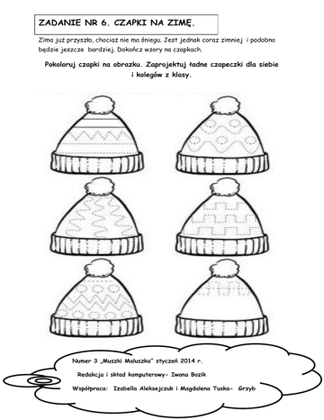ZADANIE NR 6. CZAPKI NA ZIMĘ. Zima już przyszła, chociaż nie ma śniegu. Jest jednak coraz zimniej i podobno będzie jeszcze bardziej. Dokończ wzory na czapkach. Pokoloruj czapki na obrazku. Zaprojektuj ładne czapeczki dla siebie i kolegów z klasy. Numer 3 „Muszki Maluszka” styczeń 2014 r. Redakcja i skład komputerowy- Iwona Bozik Współpraca: Izabella Aleksejczuk i Magdalena Tuska- Grzyb
