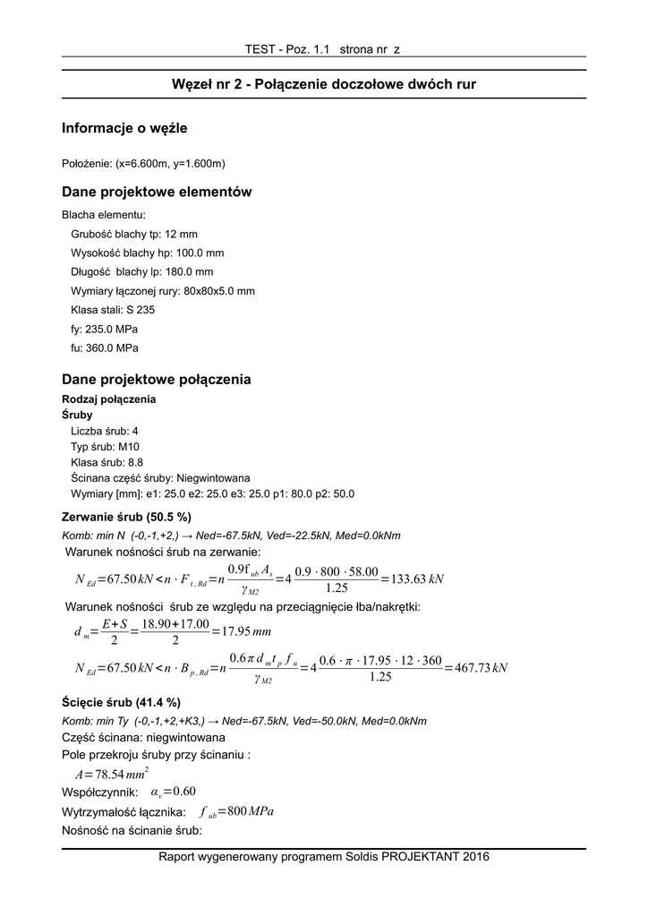 TEST - Poz. 1.1 strona nr z Węzeł nr 2 - Połączenie doczołowe dwóch rur Informacje o węźle Położenie: (x=6.600m, y=1.600m) Dane projektowe elementów Blacha elementu: Grubość blachy tp: 12 mm Wysokość blachy hp: 100.0 mm Długość blachy lp: 180.0 mm Wymiary łączonej rury: 80x80x5.0 mm Klasa stali: S 235 fy: 235.0 MPa fu: 360.0 MPa Dane projektowe połączenia Rodzaj połączenia Śruby Liczba śrub: 4 Typ śrub: M10 Klasa śrub: 8.8 Ścinana część śruby: Niegwintowana Wymiary [mm]: e1: 25.0 e2: 25.0 e3: 25.0 p1: 80.0 p2: 50.0 Zerwanie śrub (50.5 %) Komb: min N (-0,-1,+2,) → Ned=-67.5kN, Ved=-22.5kN, Med=0.0kNm Warunek nośności śrub na zerwanie: N Ed =67.50 kN < n ⋅F t , Rd =n 0.9f ub As 0.9 ⋅800 ⋅58.00 =4 =133.63 kN γ M2 1.25 Warunek nośności śrub ze względu na przeciągnięcie łba/nakrętki: E+ S 18.90+17.00 = =17.95 mm 2 2 0.6 π d m t p f u 0.6 ⋅π ⋅17.95 ⋅12 ⋅360 N Ed =67.50 kN < n ⋅B p , Rd =n =4 =467.73 kN γ M2 1.25 d m= Ścięcie śrub (41.4 %) Komb: min Ty (-0,-1,+2,+K3,) → Ned=-67.5kN, Ved=-50.0kN, Med=0.0kNm Część ścinana: niegwintowana Pole przekroju śruby przy ścinaniu : 2 A=78.54 mm Współczynnik: α v =0.60 Wytrzymałość łącznika: f ub=800 MPa Nośność na ścinanie śrub: Raport wygenerowany programem Soldis PROJEKTANT 2016 TEST - Poz. 1.1 strona nr z F v , Rd =n α v f ub A 4⋅0.60 ⋅800 ⋅78.54 = =120.64 kN γ M2 1.25 Warunek nośności: V Ed =50.00 kN < F v , Rd =120.64 kN Docisk śrub (20.8 %) Komb: min Ty (-0,-1,+2,+K3,) → Ned=-67.5kN, Ved=-50.0kN, Med=0.0kNm Współczynniki: α b=min k 1=min ( ( F b , Rd =n ) ( ) ( e 1 f ub 25.0 800 , , 1 =min , ,1 =0.69 3d 0 f u 3⋅12 360 ) 2.8e 2 f ub 2.8 ⋅25.0 800 , ,1 =min , ,1 =2.50 d0 fu 12 360 ) k 1 α b f u t p d 4 ⋅2.50 ⋅0.69⋅360 ⋅12 ⋅10 = =240.00 kN γ M2 1.25 Warunki nośności: V Ed =50.00 kN < F b , Rd =240.00 kN Uplastycznienie blachy (83.9 %) Komb: min N (-0,-1,+2,) → Ned=-67.5kN, Ved=-22.5kN, Med=0.0kNm Zalecana grubość blachy czołowej: 0.5 ( ) KP f ( 1+δ ) b' =e 1 − δ=1− K= ( P f= ( 0.5 ⩽ t p ⩽ ( KP f ) ( d2 )+ t =25.0 −( 102 )+5=25.00 mm 1 d0 =1 −12/ 50.0=0.76 p2 4b ' 4 · 25.00 1 = =0.009 MPa 235 f 0.9⋅ ⋅50.0 0.9 yp p2 1.00 γ M0 )( ) N 1, Ed =67.50/4=16.88 kN n 0.009· 16.88⋅1e3 (1+ 0.76 ) 0.5 ) 0.5 ⩽ 12⩽ ( 0.009· 16.88 ⋅1e3 ) ⇔ 9.52 mm ⩽ 12 mm⩽ 12.63 mm Warunek spełniony. Sprawdzenie warunku bocznych odległości dla śrub: e 2 <1.25e1 → 25.0<31.2 Warunek spełniony. Określenie parametru [( α= KF t , Rd t 2p α (przyjęto obciążenie równe nośności śruby na rozciąganie): )][ ( −1 ( e + d2 ) 2 δ e 2 +e 1 +t 1) ] Raport wygenerowany programem Soldis PROJEKTANT 2016 TEST - Poz. 1.1 strona nr z [( α= [ )] 0.009 · 33.41 −1 12 2 (25.0+ 102 ) 0.76 ⋅( 25.0+ 25.0+5 ) ] =0.86 Do dalszych obliczeń przyjęto: α=0.86 Nośność blachy styku doczołowego: t 2p ( 1+δ α ) n 12 2 ( 1+0.76 · 0.86 ) · 4 N Rd = = 1e-3=80.46 kN K γ M2 0.009 · 1.25 Warunek nośności: N Ed =67.50 kN < N Rd =80.46 kN Nośność spoin (42.9 %) Komb: min Ty (-0,-1,+2,+K3,) → Ned=-67.5kN, Ved=-50.0kN, Med=0.0kNm Współczynnik βw: β w =0.80 Graniczne naprężenia prostopadłe: σ ⊥ ,lim.=0.9 fu 360 =0.9 =259.20 MPa γ M2 1.25 Graniczne naprężenia wypadkowe: σ lim.= fu 360 = =360.00 MPa β w γ M2 0.80 ⋅1.25 Naprężenia normalne: Aw =2 ⋅a w ( h+b )=2 ⋅4.00 ( 80.00+80.00 )=1280 mm 2 N Ed 67500 σ= = =52.73 MPa Aw 1280 Naprężenia prostopadłe: σ 52.73 = =37.29 MPa √2 √2 σ ⊥ =37.29 MPa <259.20 MPa σ ⊥ =τ ⊥ = Naprężenia równoległe: Av =2 ⋅a w ⋅h=2⋅4.00 ⋅80.00=640 mm V 50000 τ ∥ = Ed = =35.16 MPa Aw 640 √σ 2 ⊥ 2 +3 ( τ 2⊥+ τ 2∥ )=√37.29 2+ 3 ( 37.292 +35.16 2) =96.28 MPa <360.00 MPa Raport wygenerowany programem Soldis PROJEKTANT 2016