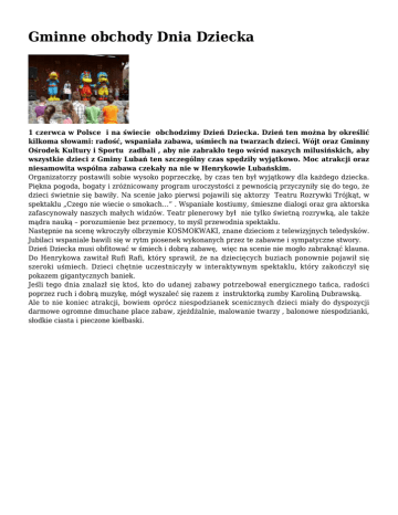 Gminne obchody Dnia Dziecka 1 czerwca w Polsce i na świecie obchodzimy Dzień Dziecka. Dzień ten można by określić kilkoma słowami: radość, wspaniała zabawa, uśmiech na twarzach dzieci. Wójt oraz Gminny Ośrodek Kultury i Sportu zadbali , aby nie zabrakło tego wśród naszych milusińskich, aby wszystkie dzieci z Gminy Lubań ten szczególny czas spędziły wyjątkowo. Moc atrakcji oraz niesamowita wspólna zabawa czekały na nie w Henrykowie Lubańskim. Organizatorzy postawili sobie wysoko poprzeczkę, by czas ten był wyjątkowy dla każdego dziecka. Piękna pogoda, bogaty i zróżnicowany program uroczystości z pewnością przyczyniły się do tego, że dzieci świetnie się bawiły. Na scenie jako pierwsi pojawili się aktorzy Teatru Rozrywki Trójkąt, w spektaklu „Czego nie wiecie o smokach…” . Wspaniałe kostiumy, śmieszne dialogi oraz gra aktorska zafascynowały naszych małych widzów. Teatr plenerowy był nie tylko świetną rozrywką, ale także mądra nauką – porozumienie bez przemocy, to myśl przewodnia spektaklu. Następnie na scenę wkroczyły olbrzymie KOSMOKWAKI, znane dzieciom z telewizyjnych teledysków. Jubilaci wspaniale bawili się w rytm piosenek wykonanych przez te zabawne i sympatyczne stwory. Dzień Dziecka musi obfitować w śmiech i dobrą zabawę, więc na scenie nie mogło zabraknąć klauna. Do Henrykowa zawitał Rufi Rafi, który sprawił, że na dziecięcych buziach ponownie pojawił się szeroki uśmiech. Dzieci chętnie uczestniczyły w interaktywnym spektaklu, który zakończył się pokazem gigantycznych baniek. Jeśli tego dnia znalazł się ktoś, kto do udanej zabawy potrzebował energicznego tańca, radości poprzez ruch i dobrą muzykę, mógł wyszaleć się razem z instruktorką zumby Karoliną Dubrawską. Ale to nie koniec atrakcji, bowiem oprócz niespodzianek scenicznych dzieci miały do dyspozycji darmowe ogromne dmuchane place zabaw, zjeżdżalnie, malowanie twarzy , balonowe niespodzianki, słodkie ciasta i pieczone kiełbaski.