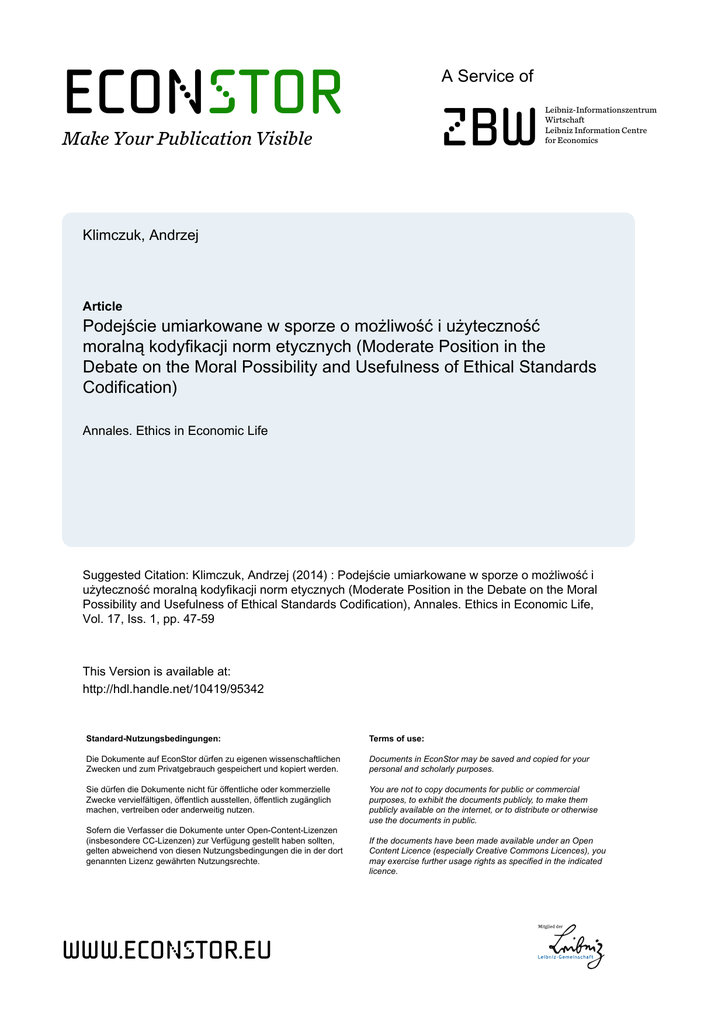 econstor A Service of zbw Make Your Publication Visible Leibniz-Informationszentrum Wirtschaft Leibniz Information Centre for Economics Klimczuk, Andrzej Article Podejście umiarkowane w sporze o możliwość i użyteczność moralną kodyfikacji norm etycznych (Moderate Position in the Debate on the Moral Possibility and Usefulness of Ethical Standards Codification) Annales. Ethics in Economic Life Suggested Citation: Klimczuk, Andrzej (2014) : Podejście umiarkowane w sporze o możliwość i użyteczność moralną kodyfikacji norm etycznych (Moderate Position in the Debate on the Moral Possibility and Usefulness of Ethical Standards Codification), Annales. Ethics in Economic Life, Vol. 17, Iss. 1, pp. 47-59 This Version is available at: http://hdl.handle.net/10419/95342 Standard-Nutzungsbedingungen: Terms of use: Die Dokumente auf EconStor dürfen zu eigenen wissenschaftlichen Zwecken und zum Privatgebrauch gespeichert und kopiert werden. Documents in EconStor may be saved and copied for your personal and scholarly purposes. Sie dürfen die Dokumente nicht für öffentliche oder kommerzielle Zwecke vervielfältigen, öffentlich ausstellen, öffentlich zugänglich machen, vertreiben oder anderweitig nutzen. You are not to copy documents for public or commercial purposes, to exhibit the documents publicly, to make them publicly available on the internet, or to distribute or otherwise use the documents in public. Sofern die Verfasser die Dokumente unter Open-Content-Lizenzen (insbesondere CC-Lizenzen) zur Verfügung gestellt haben sollten, gelten abweichend von diesen Nutzungsbedingungen die in der dort genannten Lizenz gewährten Nutzungsrechte. www.econstor.eu If the documents have been made available under an Open Content Licence (especially Creative Commons Licences), you may exercise further usage rights as specified in the indicated licence. Podejście umiarkowane w sporze o możliwość i użyteczność moralną kodyfikacji norm etycznych Autor: Andrzej Klimczuk Artykuł opublikowany w „Annales. Etyka w życiu gospodarczym” 2014, vol. 17, nr 1, s. 47-59 Wydawnictwo Uniwersytetu Łódzkiego Stable URL: http://www.annalesonline.uni.lodz.pl/archiwum/2014/2014_1_klimczuk_47_59.pdf Moderate Position in the Debate on the Moral Possibility and Usefulness of Ethical Standards Codification Author: Andrzej Klimczuk Source: ‘Annales. Ethics in Economic Life’ 2014, vol. 17, no. 1, pp. 47-59 Published by Lodz University Press Stable URL: http://www.annalesonline.uni.lodz.pl/archiwum/2014/2014_1_klimczuk_47_59.pdf © Copyright by Uniwersytet Łódzki, Łódź 2014 Used under authorization. All rights reserved. Annales. Etyka w życiu gospodarczym / Annales. Ethics in Economic Life 2014 Vol. 17, No. 1, February 2014, 47-59 Andrzej Klimczuk Szkoła Główna Handlowa w Warszawie email: [email protected] Podejście umiarkowane w sporze o możliwość i użyteczność moralną kodyfikacji norm etycznych Moderate Position in the Debate on the Moral Possibility and Usefulness of Ethical Standards Codification The popularisation of code elaboration addressed to various social groups is one of the features of the modern world. However, among researchers of this phenomenon a full consensus on the moral validity and usefulness of this activity does not exist. The article closely reviews the literature with regard to the reasons for the creation of a moderate position on the codification of ethical standards. The essay brings closer the main concepts of ethical codes and positions for their adoption and rejection. Attention is paid to ways of increasing the effectiveness of codes and the ethical decision-making procedure in a manner that undermines supporters and opponents of codification approaches. Keywords: professional ethics, codification, social responsibility, regulation of behaviour, standardization, situationism JEL Classification: M14 1. Wprowadzenie Kwestia kodyfikacji norm etycznych postrzegana jest w literaturze przedmiotu głównie w dwóch ujęciach. Z jednej strony postuluje się całkowite uznanie dla zasadności kodyfikacji norm etycznych. Z drugiej natomiast zaprzecza się jej przesłankom i wskazuje na jej ograniczenia i wypaczenia. Dotychczas badacze nie wypracowali stanowiska umożliwiającego zakończenie sporu. Celem niniej- 48 ANDRZEJ KLIMCZUK szego opracowania jest przybliżenie perspektywy ukazującej umiarkowane stanowisko za kodyfikacją norm etycznych, które umożliwiałoby pogodzenie racji obu stron. W pierwszej kolejności przybliżone zostaną podstawowe kwestie dotyczące ustanawiania, wdrażania oraz nadzorowania zbiorów czy systemów norm i reguł etyk zawodowych. Po wskazaniu podstawowych pojęć i stanowisk etycznych podjęta zostanie dyskusja nad możliwością skonstruowania stanowiska umiarkowanego, wykorzystującego argumenty zwolenników i przeciwników kodyfikacji. 2. Pojęcie kodeksu etycznego i jego przemiany Punktem wyjścia będzie omówienie podstawowych definicji związanych z kodyfikacją norm, wybranych stanowisk etycznych oraz ich przemian wraz z rozwojem społeczno-gospodarczym. Kodeks etyczny według L. Zdybela to: „niesprzeczny układ (system) norm regulujący sferę moralną i wyznaczający stosunek jednostki do innych osób, do grupy, do samej siebie oraz, w przypadku kodeksu religijno-etycznego (np. dekalog) przede wszystkim do Boga” 1. Podobnie według E. Grendeckiej kodeks etyczny to system „norm regulujący sferę moralnego życia człowieka” 2. Badacze ci wskazują, że kodeksy występują w formie pisanej lub przekazu ustnego, przy czym moc obowiązująca jest podobna lub taka sama. Kodeksy mogą obejmować duże grupy np. wyznawców określonej religii oraz małe np. zawodowe. Wyróżnia się kodeksy: etyki społecznej, honorowe i etyki zawodowej, m.in. lekarskiej, dziennikarskiej, etyki w życiu gospodarczym oraz polityków i naukowców3. W literaturze przedmiotu obecne są przynajmniej trzy podejścia do formalizacji zasad