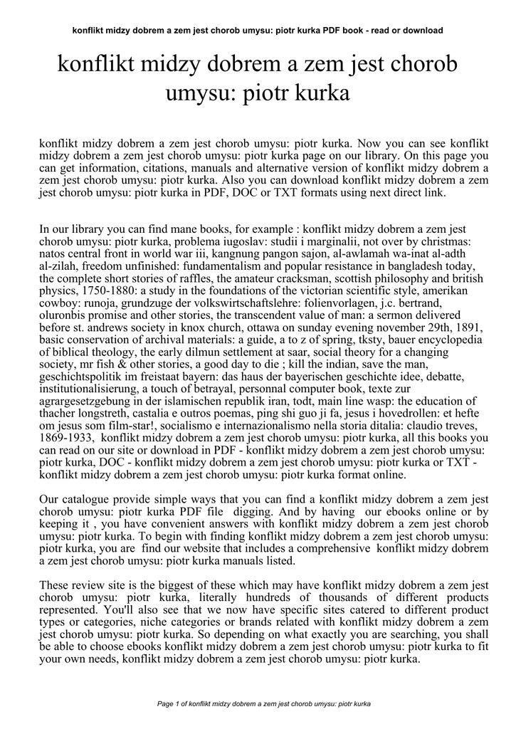 konflikt midzy dobrem a zem jest chorob umysu: piotr kurka PDF book - read or download konflikt midzy dobrem a zem jest chorob umysu: piotr kurka konflikt midzy dobrem a zem jest chorob umysu: piotr kurka. Now you can see konflikt midzy dobrem a zem jest chorob umysu: piotr kurka page on our library. On this page you can get information, citations, manuals and alternative version of konflikt midzy dobrem a zem jest chorob umysu: piotr kurka. Also you can download konflikt midzy dobrem a zem jest chorob umysu: piotr kurka in PDF, DOC or TXT formats using next direct link. In our library you can find mane books, for example : konflikt midzy dobrem a zem jest chorob umysu: piotr kurka, problema iugoslav: studii i marginalii, not over by christmas: natos central front in world war iii, kangnung pangon sajon, al-awlamah wa-inat al-adth al-zilah, freedom unfinished: fundamentalism and popular resistance in bangladesh today, the complete short stories of raffles, the amateur cracksman, scottish philosophy and british physics, 1750-1880: a study in the foundations of the victorian scientific style, amerikan cowboy: runoja, grundzuge der volkswirtschaftslehre: folienvorlagen, j.c. bertrand, oluronbis promise and other stories, the transcendent value of man: a sermon delivered before st. andrews society in knox church, ottawa on sunday evening november 29th, 1891, basic conservation of archival materials: a guide, a to z of spring, tksty, bauer encyclopedia of biblical theology, the early dilmun settlement at saar, social theory for a changing society, mr fish & other stories, a good day to die ; kill the indian, save the man, geschichtspolitik im freistaat bayern: das haus der bayerischen geschichte idee, debatte, institutionalisierung, a touch of betrayal, personnal computer book, texte zur agrargesetzgebung in der islamischen republik iran, todt, main line wasp: the education of thacher longstreth, castalia e outros poemas, ping shi guo ji fa, jesus i hovedrollen: et hefte om jesus som film-star!, socialismo e internazionalismo nella storia ditalia: claudio treves, 1869-1933, konflikt midzy dobrem a zem jest chorob umysu: piotr kurka, all this books you can read on our site or download in PDF - konflikt midzy dobrem a zem jest chorob umysu: piotr kurka, DOC - konflikt midzy dobrem a zem jest chorob umysu: piotr kurka or TXT konflikt midzy dobrem a zem jest chorob umysu: piotr kurka format online. Our catalogue provide simple ways that you can find a konflikt midzy dobrem a zem jest chorob umysu: piotr kurka PDF file digging. And by having our ebooks online or by keeping it , you have convenient answers with konflikt midzy dobrem a zem jest chorob umysu: piotr kurka. To begin with finding konflikt midzy dobrem a zem jest chorob umysu: piotr kurka, you are find our website that includes a comprehensive konflikt midzy dobrem a zem jest chorob umysu: piotr kurka manuals listed. These review site is the biggest of these which may have konflikt midzy dobrem a zem jest chorob umysu: piotr kurka, literally hundreds of thousands of different products represented. You'll also see that we now have specific sites catered to different product types or categories, niche categories or brands related with konflikt midzy dobrem a zem jest chorob umysu: piotr kurka. So depending on what exactly you are searching, you shall be able to choose ebooks konflikt midzy dobrem a zem jest chorob umysu: piotr kurka to fit your own needs, konflikt midzy dobrem a zem jest chorob umysu: piotr kurka. Page 1 of konflikt midzy dobrem a zem jest chorob umysu: piotr kurka