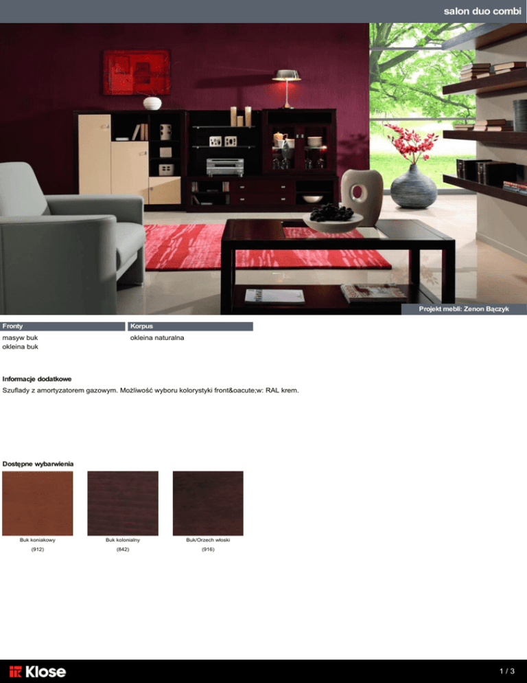 salon duo combi Projekt mebli: Zenon Bączyk Fronty Korpus masyw buk okleina buk okleina naturalna Informacje dodatkowe Szuflady z amortyzatorem gazowym. Możliwość wyboru kolorystyki frontów: RAL krem. Dostępne wybarwienia Buk koniakowy Buk kolonialny Buk/Orzech włoski (912) (842) (916) 1/3 salon duo combi Elementy zestawu witryna oszklona z witryna oszklona z witryna oszklona z witryna oszklona z witryna oszklona oświetleniem oświetleniem oświetleniem oświetleniem 675-34 witryna z barkiem 676-32 675-36 675-44 675-45 675-35 85/199/40 85/199/40 170/199/40 170/199/40 170/199/40 127/199/40 witryna z barkiem regał regał oszklony szafa ubraniowa szafa ubraniowa szafa ubraniowa 676-33 685-30 685-31 675-33 675-32 675-31 85/199/40 85/199/40 85/199/40 170/205/58 127/205/58 85/205/58 kredens wysoki z kredens wysoki z kredens wysoki z kredens wysoki kredens wysoki kredens wysoki oświetleniem oświetleniem oświetleniem 675-37 675-41 675-42 673-32 673-31 673-30 127/120/40 127/120/40 127/120/40 170/120/40 127/120/40 85/120/40 kredens wysoki kredens wysoki kredens wysoki kredens wysoki z kredens wysoki barek 675-43 675-46 675-47 oświetleniem 682-33 676-31 127/120/40 127/120/40 127/120/40 676-30 170/120/40 85/120/40 kredens z oświetleniem 85/120/40 kredens kredens kredens kredens kredens z oświetleniem 682-32 677-35 677-34 677-33 677-31 677-30 170/80/40 170/80/40 127/80/40 127/80/40 85/80/40 85/80/40 komoda komoda komoda szafka RTV komoda TV komoda TV 682-31 682-30 677-32 678-30 688-31 688-30 85/80/40 85/80/40 85/80/40 85/51/40 170/37/54 127/37/54 Wymiary podawane w kolejności szer./wys./głębokość 2/3 salon duo combi Elementy zestawu szafka RTV szafka RTV panel TV panel TV podest podest 678-32 678-31 280-30 280-31 670-30 670-31 170/37/54 127/37/54 85/83/26 85/83/5 85/6/54 127/6/54 ramka dystansowana podest podest podest podest ramka dystansowana 670-32 670-40 670-41 670-42 671-30 671-31 170/6/54 85/6/40 127/6/40 170/6/40 85/3/40 127/3/40 ramka dystansowana 671-32 170/3/40 Wymiary podawane w kolejności szer./wys./głębokość 3/3