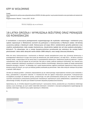 KPP W WOŁOMINIE Źródło: http://kppwolomin.policja.waw.pl/pw/aktualnosci/30355,16-latka-grozila-i-wymuszala-bizuterie-oraz-pieniadze-od-rowiesniczk i.html Wygenerowano: Wtorek, 7 marca 2017, 05:29 Strona znajduje się w archiwum. 16-LATKA GROZIŁA I WYMUSZAŁA BIŻUTERIĘ ORAZ PIENIĄDZE OD RÓWIEŚNICZKI Z wnioskiem o wszczęcie postępowania wyjaśniającego do wydziału rodzinnego i nieletnich przy sądzie rejonowym w Wołominie zwrócili się policjanci z komisariatu w Markach wobec 16-letniej uczennicy jednej z lokalnych szkół. Dziewczyna od maja 2011r wielokrotnie groziła pobiciem oraz ciężkim uszkodzeniem ciała swojej rówieśniczce, dwukrotnie żądała też od niej wydania pieniędzy i biżuterii. Ta obawiając się o swoje bezpieczeństwo przekazała jej należące do swojej babci pierścionek i dwie złote obrączki warte blisko 1000 złotych, oraz swoją sztuczną biżuterię. Kilka dni temu funkcjonariusze z komisariatu w Markach zostali powiadomieni przez ojca 16-letniej dziewczyny o przestępstwach dokonanych na jego córce przez jej rówieśniczką. Jak ustalili policjanci, od maja 2011r., 16-letnia uczennica lokalnej szkoły, uczęszczająca do tej samej klasy co poszkodowana dziewczyna, wielokrotnie groziła jej pobiciem i ciężkim uszkodzeniem ciała. Na tym jednak się nie kończyło. Nie tylko w szkole, podczas osobistych konfrontacji, lecz również przy pomocy wiadomości tekstowych wysyłanych za pomocą telefonu komórkowego, dziewczyna żądała od swojej zastraszanej koleżanki pieniędzy i biżuterii. Ta obawiając się o swoje bezpieczeństwo najpierw przekazała napastniczce swoją sztuczna biżuterię wartą 50 złotych, po czym po kolejnej groźbie przekazała jej pierścionek i dwie złote obrączki należące do jej babci o wartości 1000 złotych. 16-latka po kolejnej groźbie i usiłowaniu doprowadzenia jej do niekorzystnego rozporządzenia mieniem przez koleżankę z klasy, powiadomiła o wszystkim rodziców. Ci niezwłocznie fakt ten zgłosili miejscowym policjantom. Funkcjonariusze szczegółowo przystąpili do zbadania sprawy, przesłuchując nie tylko poszkodowaną dziewczynę, lecz również dokonując czynności procesowych przeszukania pomieszczeń mieszkalnych zajmowanych przez podejrzewaną o popełnienie czynu zabronionego 16-latkę. W wyniku tych działań kryminalni odzyskali przywłaszczona biżuterię. Upewniwszy się, że 16-letka dopuścił się gróźb karalnych i wymuszenia mienia, przesłuchali ją w charakterze nieletniego sprawcy czynu karalnego, po czym całość materiałów skierowali z wnioskiem o wszczęcie postępowania wyjaśniającego do wydziału rodzinnego i nieletnich przy sądzie rejonowym w Wołominie. ts Ocena: 0/5 (0) Tweetnij