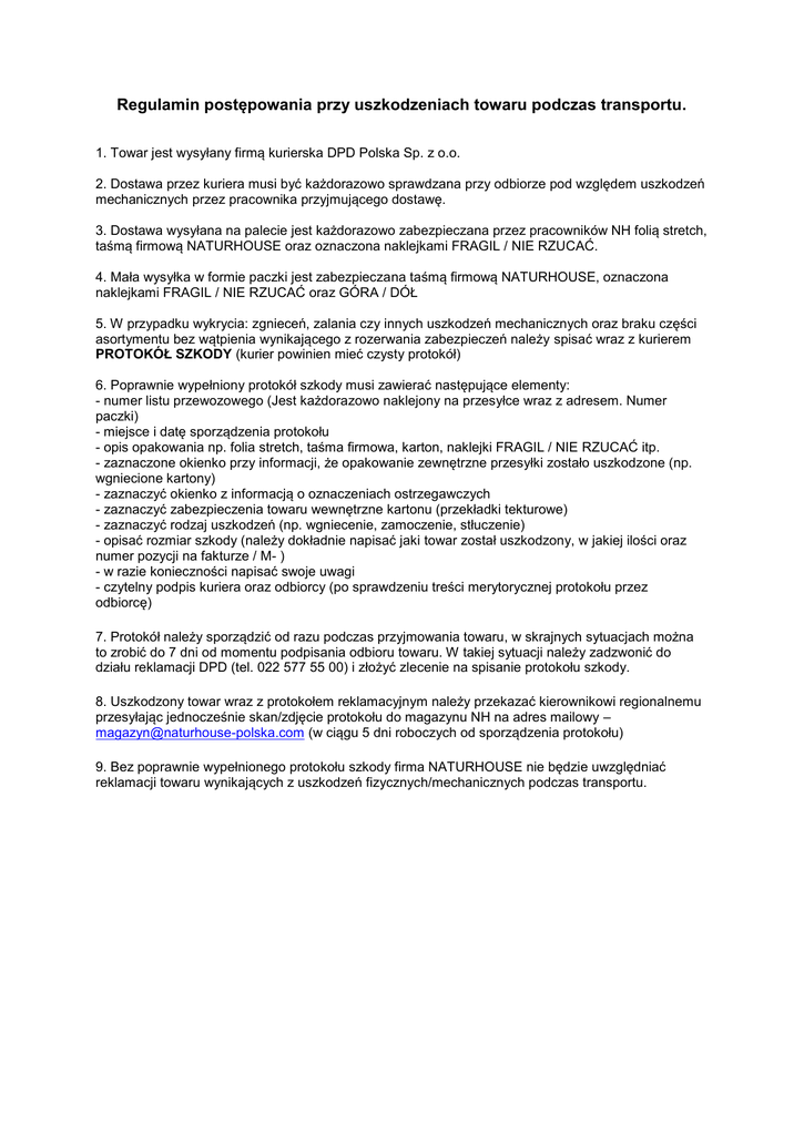 Regulamin postępowania przy uszkodzeniach towaru podczas transportu. 1. Towar jest wysyłany firmą kurierska DPD Polska Sp. z o.o. 2. Dostawa przez kuriera musi być każdorazowo sprawdzana przy odbiorze pod względem uszkodzeń mechanicznych przez pracownika przyjmującego dostawę. 3. Dostawa wysyłana na palecie jest każdorazowo zabezpieczana przez pracowników NH folią stretch, taśmą firmową NATURHOUSE oraz oznaczona naklejkami FRAGIL / NIE RZUCAĆ. 4. Mała wysyłka w formie paczki jest zabezpieczana taśmą firmową NATURHOUSE, oznaczona naklejkami FRAGIL / NIE RZUCAĆ oraz GÓRA / DÓŁ 5. W przypadku wykrycia: zgnieceń, zalania czy innych uszkodzeń mechanicznych oraz braku części asortymentu bez wątpienia wynikającego z rozerwania zabezpieczeń należy spisać wraz z kurierem PROTOKÓŁ SZKODY (kurier powinien mieć czysty protokół) 6. Poprawnie wypełniony protokół szkody musi zawierać następujące elementy: - numer listu przewozowego (Jest każdorazowo naklejony na przesyłce wraz z adresem. Numer paczki) - miejsce i datę sporządzenia protokołu - opis opakowania np. folia stretch, taśma firmowa, karton, naklejki FRAGIL / NIE RZUCAĆ itp. - zaznaczone okienko przy informacji, że opakowanie zewnętrzne przesyłki zostało uszkodzone (np. wgniecione kartony) - zaznaczyć okienko z informacją o oznaczeniach ostrzegawczych - zaznaczyć zabezpieczenia towaru wewnętrzne kartonu (przekładki tekturowe) - zaznaczyć rodzaj uszkodzeń (np. wgniecenie, zamoczenie, stłuczenie) - opisać rozmiar szkody (należy dokładnie napisać jaki towar został uszkodzony, w jakiej ilości oraz numer pozycji na fakturze / M- ) - w razie konieczności napisać swoje uwagi - czytelny podpis kuriera oraz odbiorcy (po sprawdzeniu treści merytorycznej protokołu przez odbiorcę) 7. Protokół należy sporządzić od razu podczas przyjmowania towaru, w skrajnych sytuacjach można to zrobić do 7 dni od momentu podpisania odbioru towaru. W takiej sytuacji należy zadzwonić do działu reklamacji DPD (tel. 022 577 55 00) i złożyć zlecenie na spisanie protokołu szkody. 8. Uszkodzony towar wraz z protokołem reklamacyjnym należy przekazać kierownikowi regionalnemu przesyłając jednocześnie skan/zdjęcie protokołu do magazynu NH na adres mailowy – [email protected] (w ciągu 5 dni roboczych od sporządzenia protokołu) 9. Bez poprawnie wypełnionego protokołu szkody firma NATURHOUSE nie będzie uwzględniać reklamacji towaru wynikających z uszkodzeń fizycznych/mechanicznych podczas transportu.