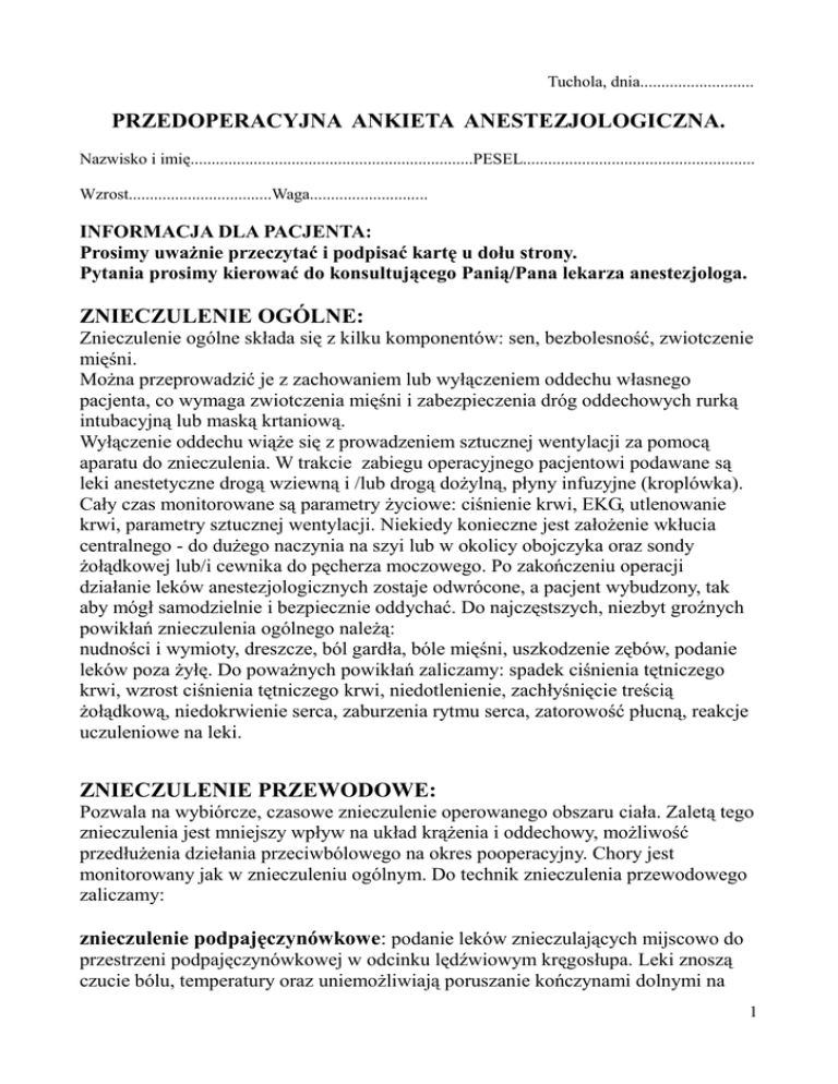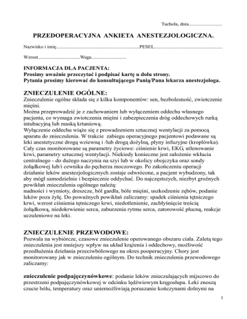 Tuchola, dnia........................... PRZEDOPERACYJNA ANKIETA ANESTEZJOLOGICZNA. Nazwisko i imię...................................................................PESEL....................................................... Wzrost..................................Waga............................ INFORMACJA DLA PACJENTA: Prosimy uważnie przeczytać i podpisać kartę u dołu strony. Pytania prosimy kierować do konsultującego Panią/Pana lekarza anestezjologa. ZNIECZULENIE OGÓLNE: Znieczulenie ogólne składa się z kilku komponentów: sen, bezbolesność, zwiotczenie mięśni. Można przeprowadzić je z zachowaniem lub wyłączeniem oddechu własnego pacjenta, co wymaga zwiotczenia mięśni i zabezpieczenia dróg oddechowych rurką intubacyjną lub maską krtaniową. Wyłączenie oddechu wiąże się z prowadzeniem sztucznej wentylacji za pomocą aparatu do znieczulenia. W trakcie zabiegu operacyjnego pacjentowi podawane są leki anestetyczne drogą wziewną i /lub drogą dożylną, płyny infuzyjne (kroplówka). Cały czas monitorowane są parametry życiowe: ciśnienie krwi, EKG, utlenowanie krwi, parametry sztucznej wentylacji. Niekiedy konieczne jest założenie wkłucia centralnego - do dużego naczynia na szyi lub w okolicy obojczyka oraz sondy żołądkowej lub/i cewnika do pęcherza moczowego. Po zakończeniu operacji działanie leków anestezjologicznych zostaje odwrócone, a pacjent wybudzony, tak aby mógł samodzielnie i bezpiecznie oddychać. Do najczęstszych, niezbyt groźnych powikłań znieczulenia ogólnego należą: nudności i wymioty, dreszcze, ból gardła, bóle mięśni, uszkodzenie zębów, podanie leków poza żyłę. Do poważnych powikłań zaliczamy: spadek ciśnienia tętniczego krwi, wzrost ciśnienia tętniczego krwi, niedotlenienie, zachłyśnięcie treścią żołądkową, niedokrwienie serca, zaburzenia rytmu serca, zatorowość płucną, reakcje uczuleniowe na leki. ZNIECZULENIE PRZEWODOWE: Pozwala na wybiórcze, czasowe znieczulenie operowanego obszaru ciała. Zaletą tego znieczulenia jest mniejszy wpływ na układ krążenia i oddechowy, możliwość przedłużenia dziełania przeciwbólowego na okres pooperacyjny. Chory jest monitorowany jak w znieczuleniu ogólnym. Do technik znieczulenia przewodowego zaliczamy: znieczulenie podpajęczynówkowe: podanie leków znieczulających mijscowo do przestrzeni podpajęczynówkowej w odcinku lędźwiowym kręgosłupa. Leki znoszą czucie bólu, temperatury oraz uniemożliwiają poruszanie kończynami dolnymi na 1 okres około 3- 4 godzin (niekiedy 6-8 godzin). Objawy niepożądane związane z tym rodzajem znieczulenia to: spadek ciśnienia tętniczego krwi, przemijające zwolnienie akcji serca. Możliwe powikłania: bóle głowy, bóle pleców, czasowe zatrzymanie moczu wymagające cewnikowania pęcherza moczowego. Do poważnych powikłań występujących bardzo rzadko zaliczamy: uszkodzenie rdzenia kręgowego lub korzenia nerwowego, zapalenie opon mózgowych lub mózgu, krwiak podpajęczynówkowy. znieczulenie zewnątrzoponowe: podanie leków znieczulających miejscowo do przestrzeni zewnątrzoponowej. Może być przeprowadzony metodą ciągłą przy pomocy cienkego cewnika wprowadzonego do tej przestrzeni, dzięki czemu znieczulenie to może być wykorzystane do leczenia bólu pooperacyjnego lub łagodzenia bólu porodowego. Powikłania takie same jak w znieczuleniu podpajęczynówkowym. Ryzyko wystąpienia powikłań zwiększa się wraz z wiekiem pacjenta, czasem trwania operacji i jej pilnością. Ryzyko powikłań jest większe u chorych otyłych, obciążonych chorobowo, u kobiet ciężarnych i chorych z pełnym żołądkiem (przed upływem 6 godzin od ostatniego posiłku). Pacjent operowany w trybie planowym zobowiązany jest powstrzymać się od przyjmowania pakarmów stałych i płynów w dniu operacji. Podczas całego znieczulenia, a także w bezpośrednim okresie poznieczuleniowym będzie towarzyszyć Państwu lekarz specjalista anestezjologii i intensywnej terapii oraz pielęgniarka anestezjologiczna. Powyższe informacje dotyczące technik znieczulenia i związanych z nimi powikłań przeczytałam/em. Data i podpis pacjenta lub jego przedstawiciela ustawowego. ............................................................................................................................................................. 2 Ankieta przedoperacyjna służy do zebrania informacji, na podstawie których możliwe będzie wybranie najbardziej korzystnego postępowania anestezjologicznego. Prosimy bardzo dokładnie odpowiedzieć na wszystkie pytania !!! Nazwisko i imię.............................................................................................................................. Pobyt w szpitalu (właściwe podkreślić): pierwszy kolejny Przebyte operacje: □ TAK Powikłania znieczulenia: TAK jakie.............................................................. □ jakie........................................................ Choroba serca: TAK Nadciśnienie: TAK Zawał serca: TAK □ □ □ □ □ □ Czy wystąpiły kiedykolwiek bóle w klatce piersiowej: TAK Czy pali Pani/Pan papierosy TAK Kaszel: TAK Przeziębienie: TAK Choroby płuc: TAK Choroby nerek: TAK Żółtaczka: TAK □ □ □ NIE NIE NIE □ NIE Czy pije Pani/Pan alkohol ? TAK □ NIE NIE NIE NIE NIE NIE NIE NIE □ □ □ □ □ □ □ □ □ kiedy ostatnio:....................................... □ jakie:...................................................... □ jakie:...................................................... □ ile........................................ NIE □ Choroby układu nerwowego (właściwe podkreślić): udar mózgu, podaczka, drgawki, miastenia, bóle głowy, utrata przytomności, porażenia lub brak czucia w nogach, rękach Cukrzyca: TAK Porfiria: TAK Dna moczanowa: □ □ TAK NIE NIE □ □ □ NIE □ Tarczyca (właściwe podkreślić): wole obojętne, nadczynność, niedoczynność