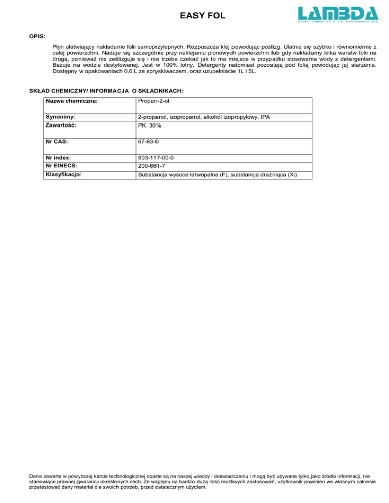 EASY FOL OPIS: Płyn ułatwiający nakładanie folii samoprzylepnych. Rozpuszcza klej powodując poślizg. Ulatnia się szybko i równomiernie z całej powierzchni. Nadaje się szczególnie przy naklejaniu pionowych powierzchni lub gdy nakładamy kilka warstw folii na drugą, poniewaŜ nie ześlizguje się i nie trzeba czekać jak to ma miejsce w przypadku stosowania wody z detergentami. Bazuje na wodzie destylowanej. Jest w 100% lotny. Detergenty natomiast pozostają pod folią powodując jej starzenie. Dostępny w opakowaniach 0,6 L ze spryskiwaczem, oraz uzupełniacie 1L i 5L. SKŁAD CHEMICZNY/ INFORMACJA O SKŁADNIKACH: Nazwa chemiczna: Propan-2-ol Synonimy: 2-propanol, izopropanol, alkohol izopropylowy, IPA Zawartość: PK. 30% Nr CAS: 67-63-0 Nr index: 603-117-00-0 Nr EINECS: 200-661-7 Klasyfikacja: Substancja wysoce łatwopalna (F), substancja draŜniąca (Xi) Dane zawarte w powyŜszej karcie technologicznej oparte są na naszej wiedzy i doświadczeniu i mogą być uŜywane tylko jako źródło informacji, nie stanowiące prawnej gwarancji określonych cech. Ze względu na bardzo duŜą ilość moŜliwych zastosowań, uŜytkownik powinien we własnym zakresie przetestować dany materiał dla swoich potrzeb, przed ostatecznym uŜyciem.